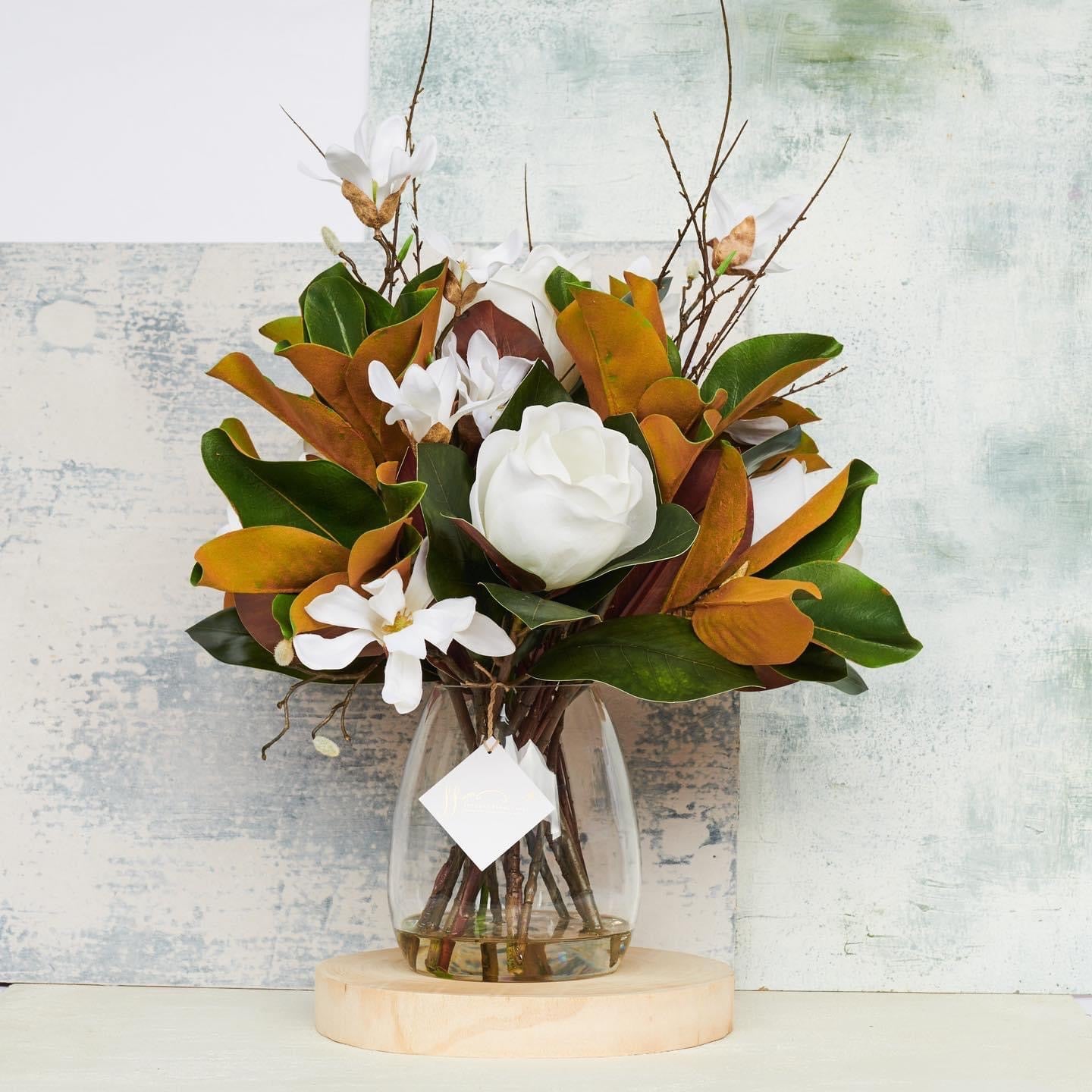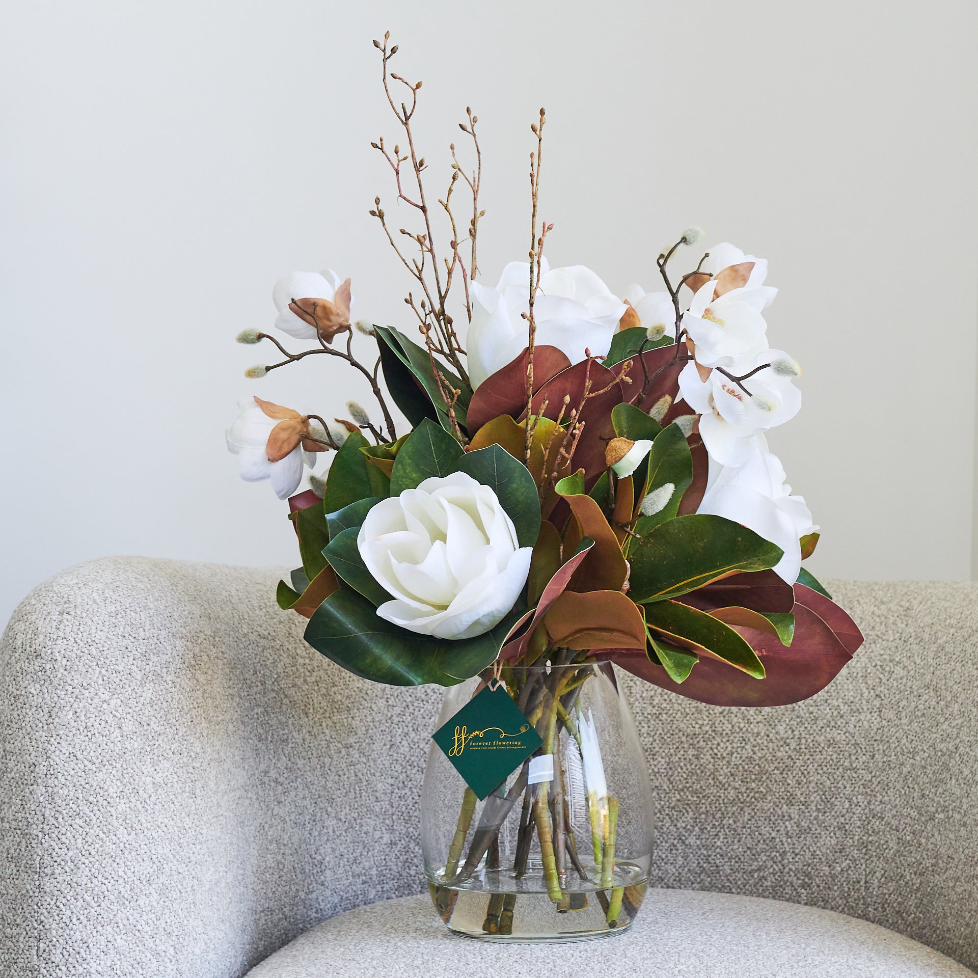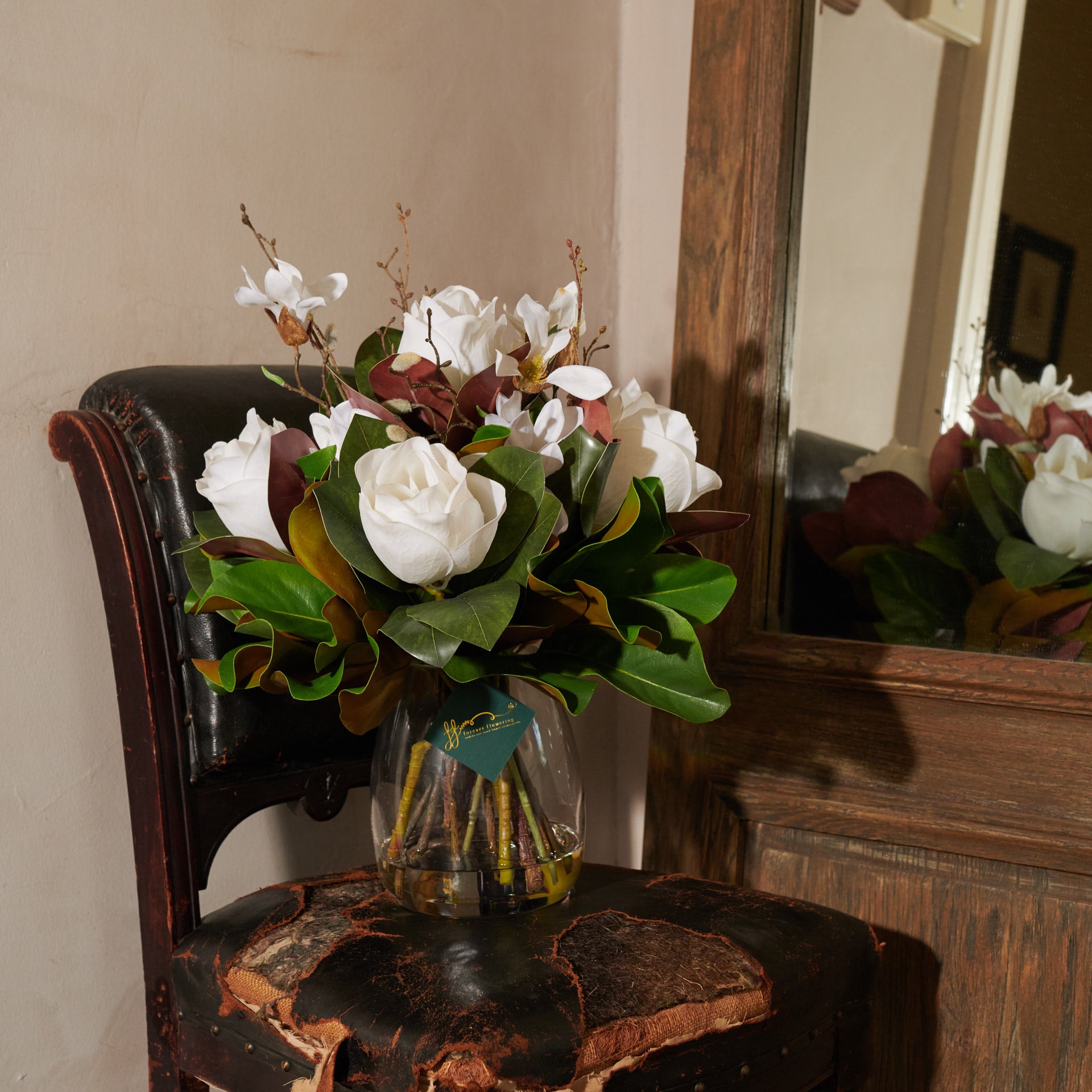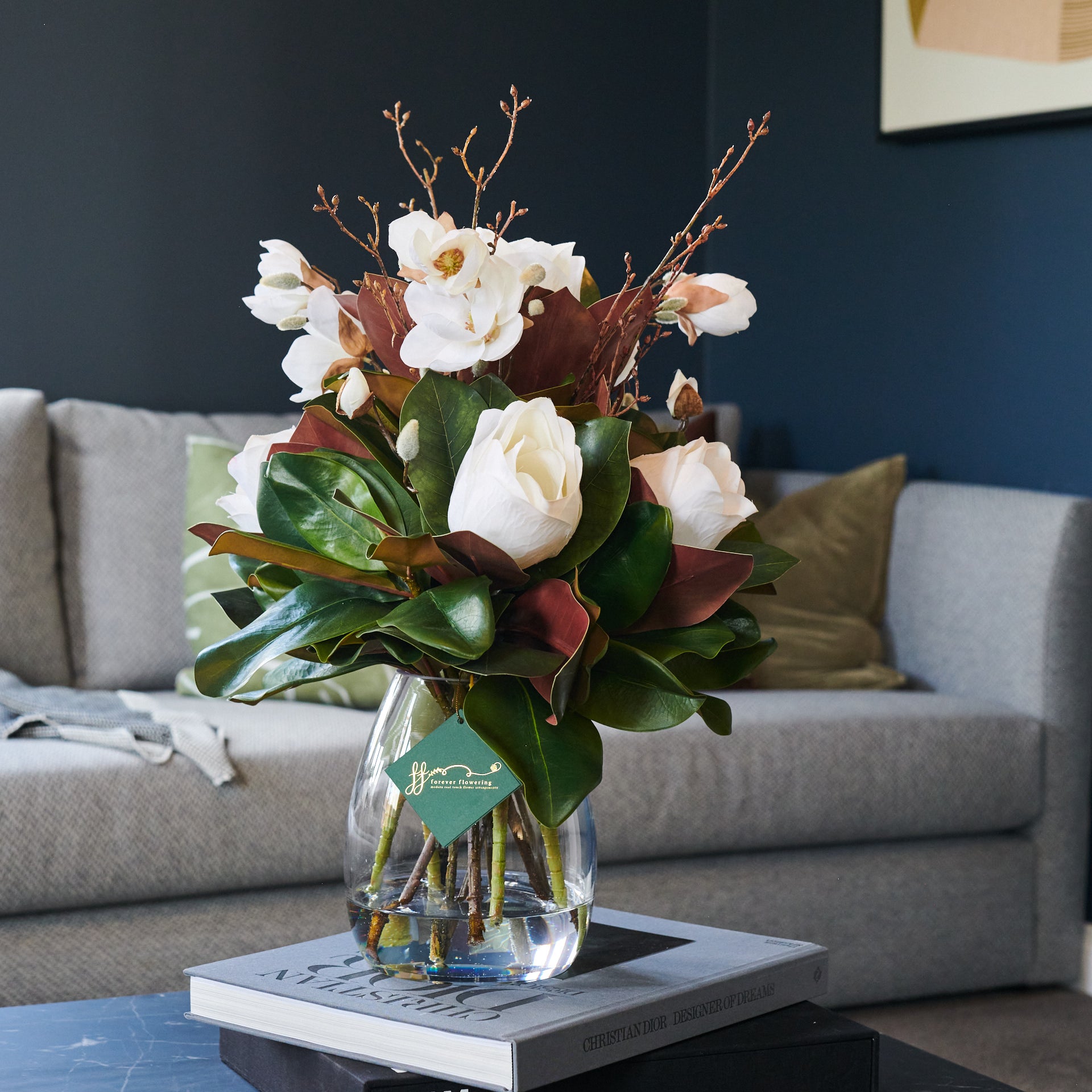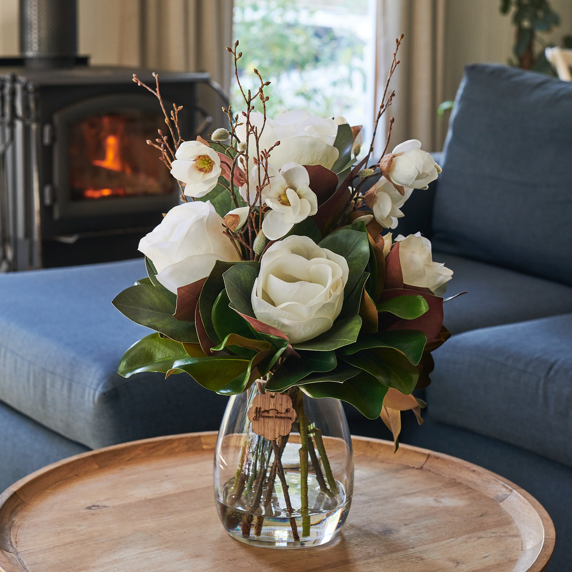 Real Touch Magnolia Flowers, Magnolia Leaves, Willow Branch Sticks and Magnolia Japanese Spray in a Belly Vase and Artificial Water. This is a 360-degree flower arrangement.