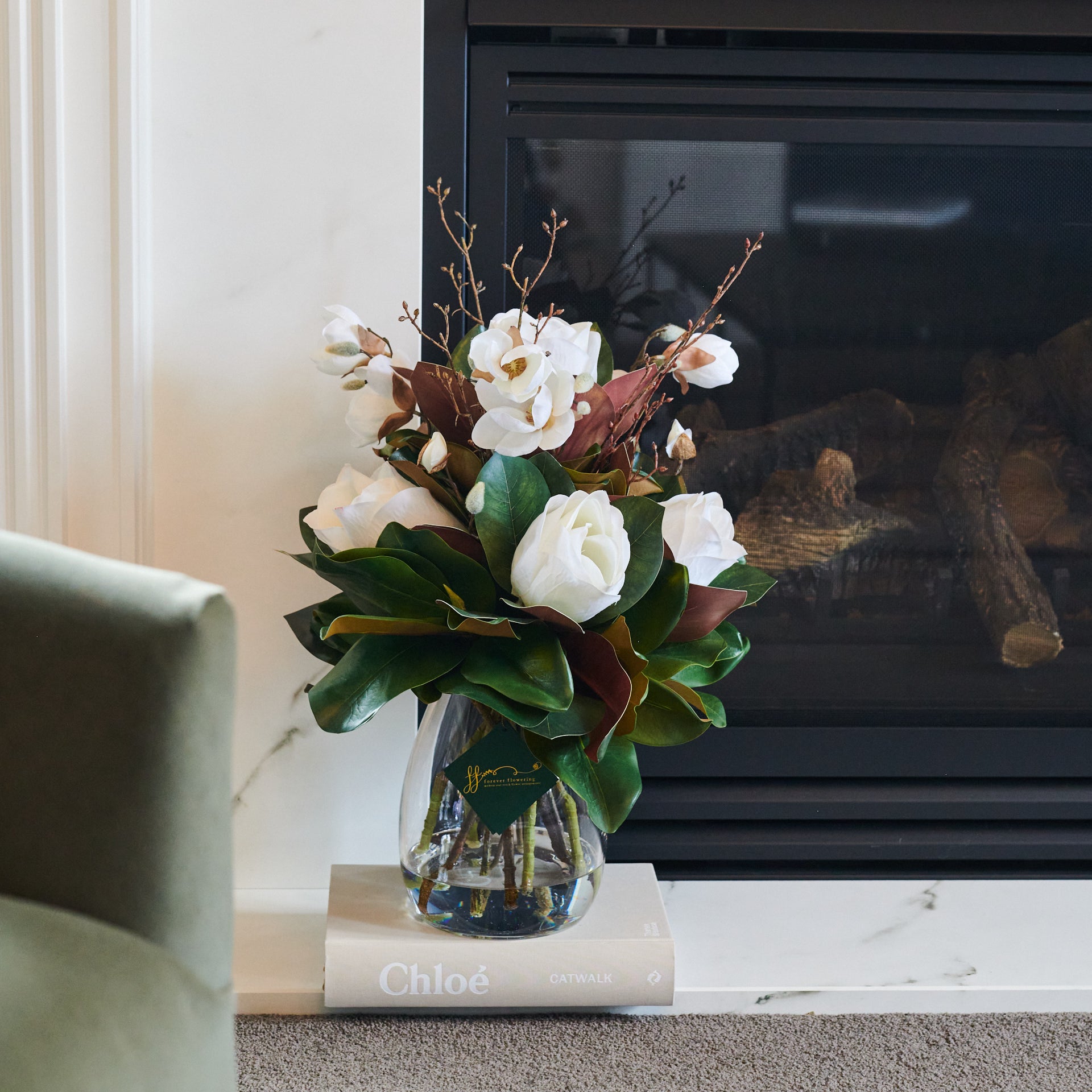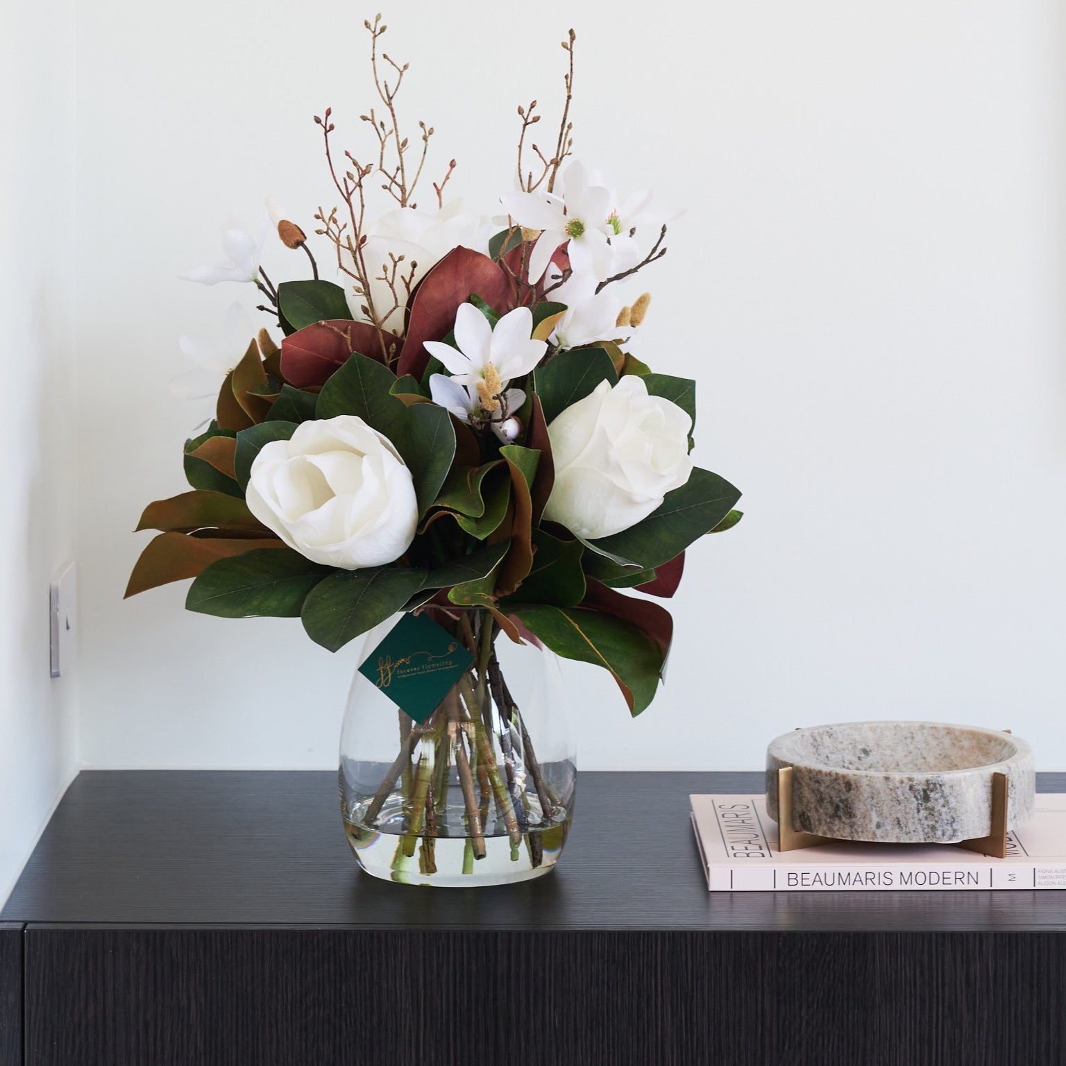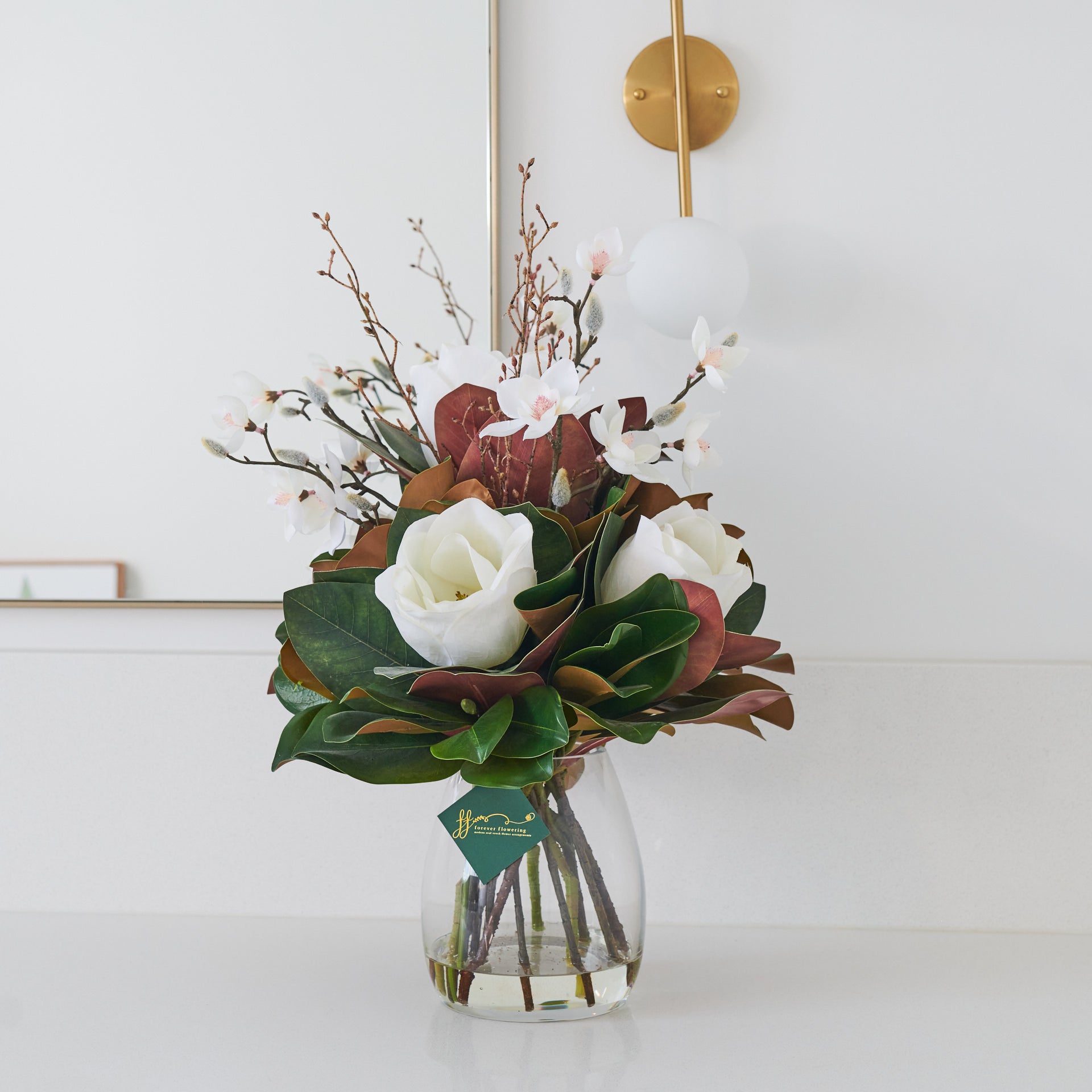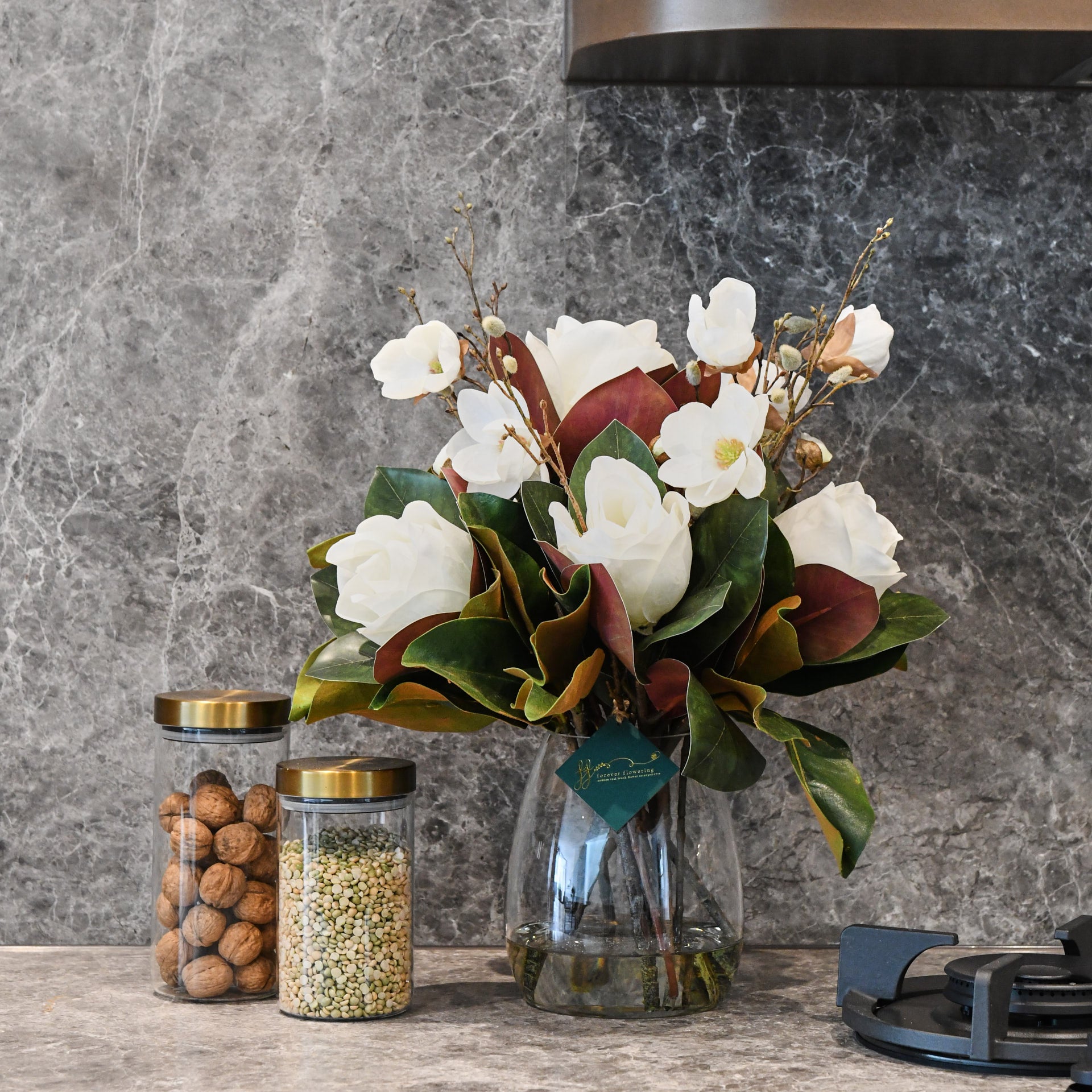Real Touch Magnolia Flowers, Magnolia Leaves, Willow Branch Sticks and Magnolia Japanese Spray in a Belly Vase and Artificial Water. This is a 360-degree flower arrangement.