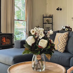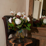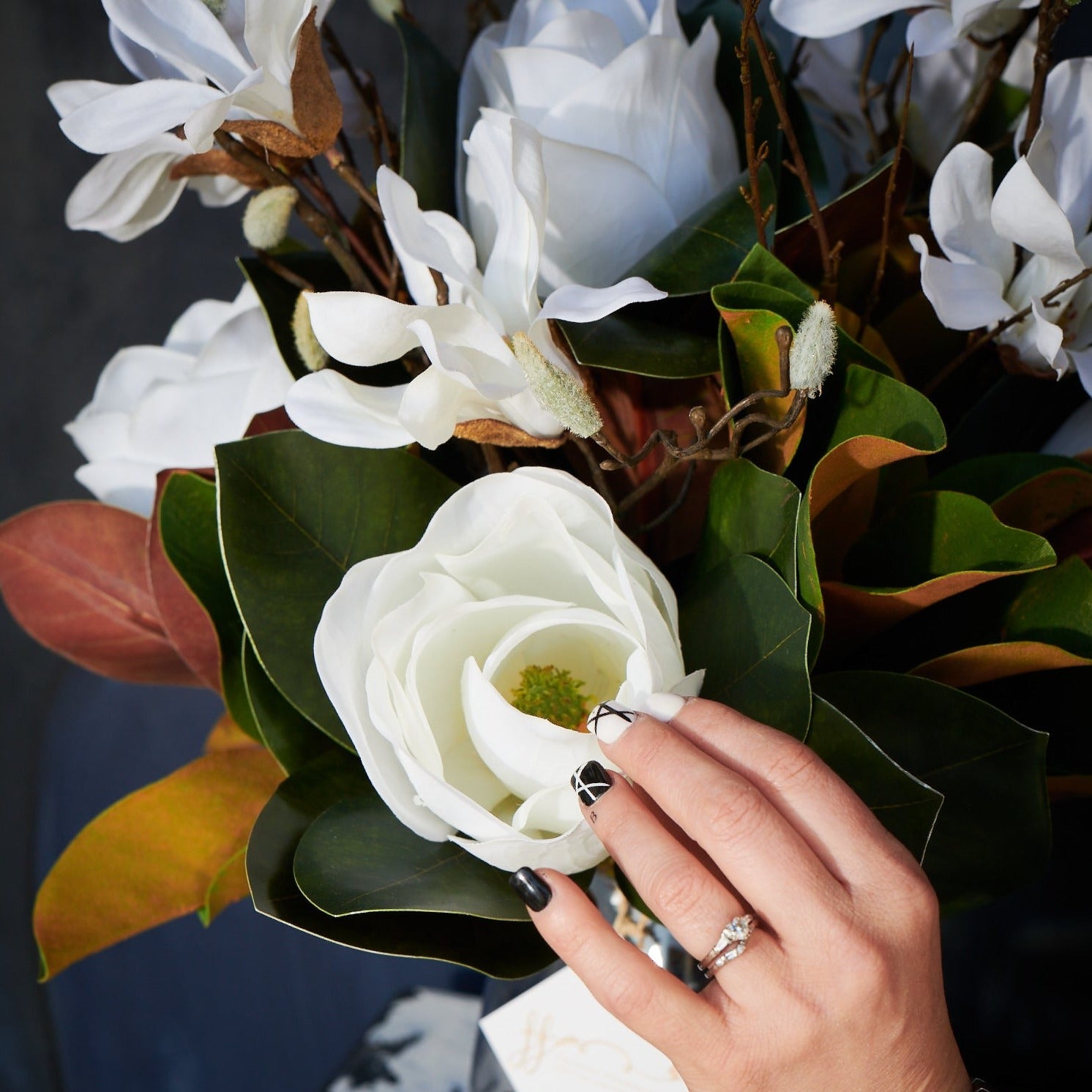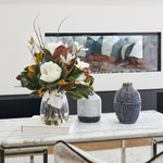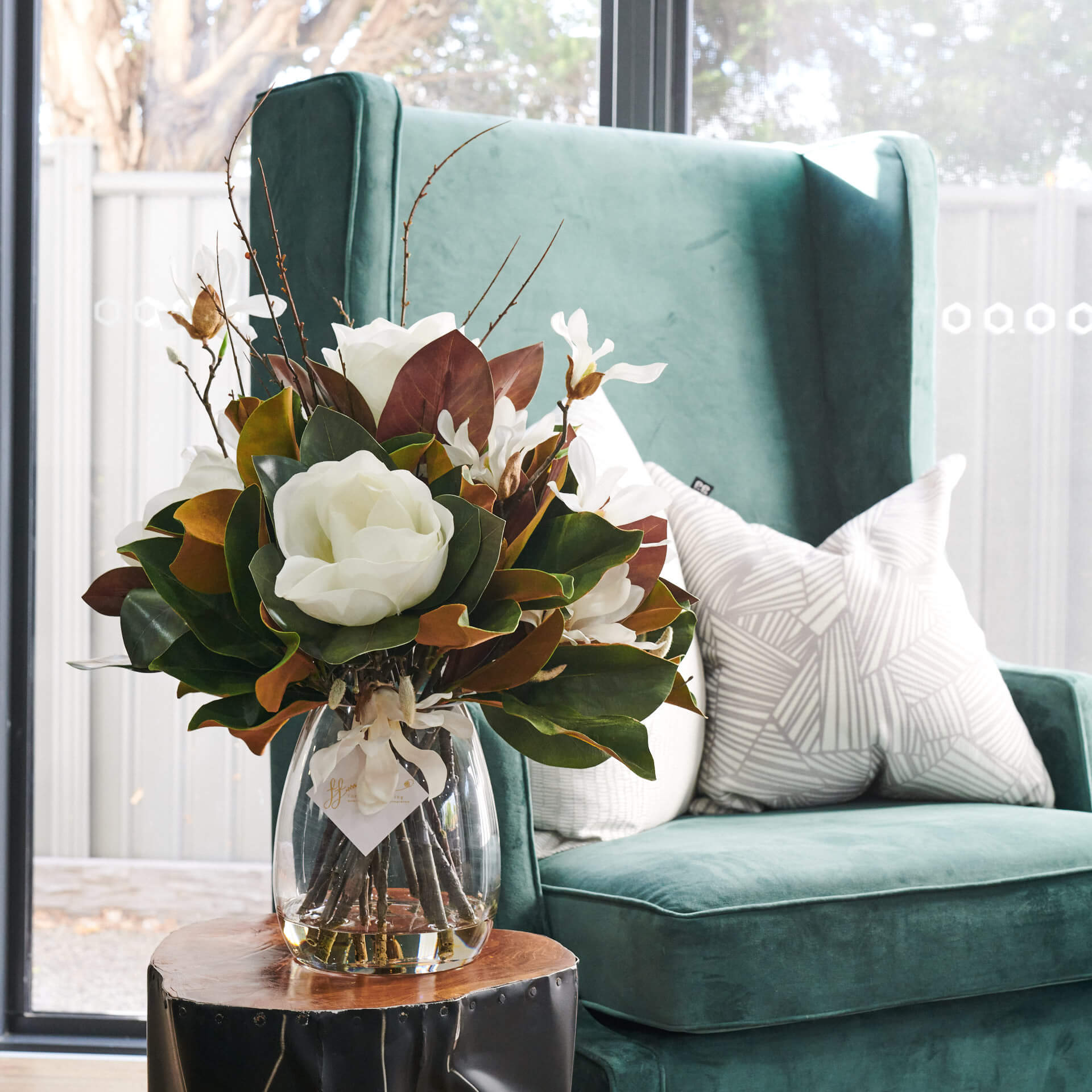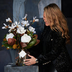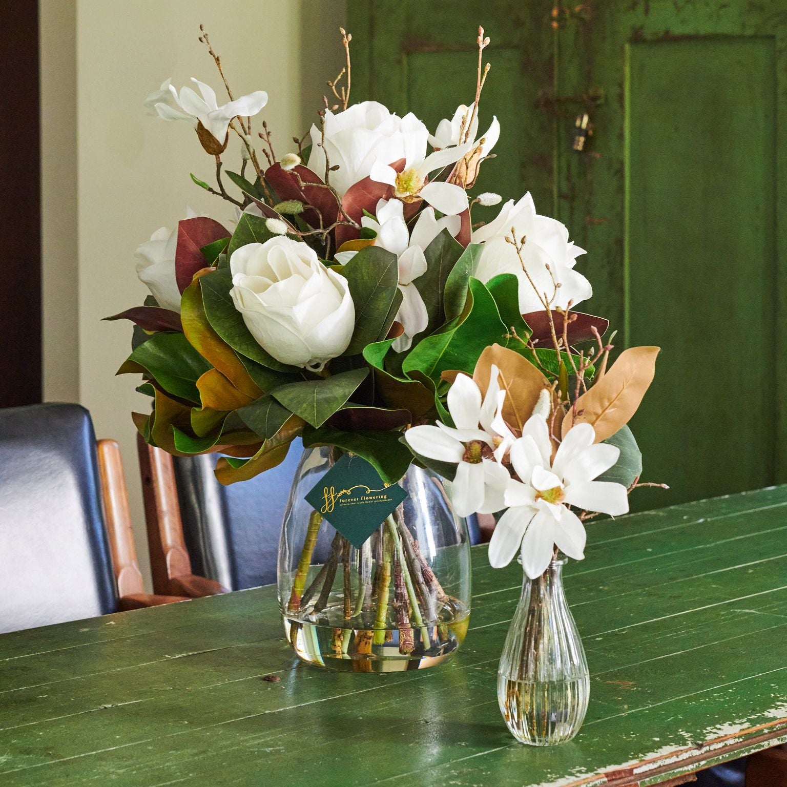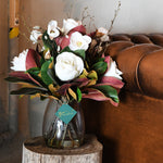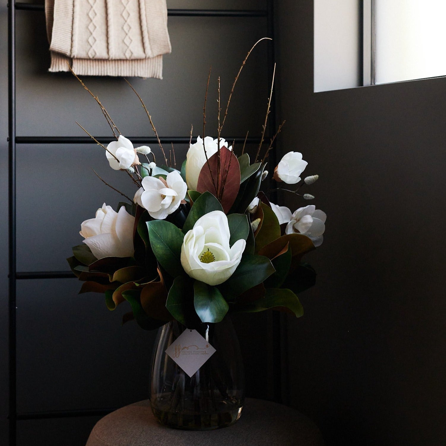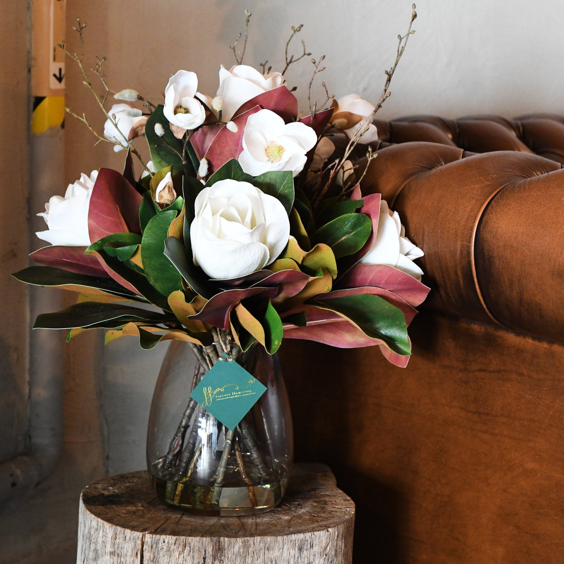 Real Touch Magnolia Flowers, Magnolia Leaves, Willow Branch Sticks and Magnolia Japanese Spray in a Belly Vase and Artificial Water. This is a 360-degree flower arrangement.