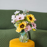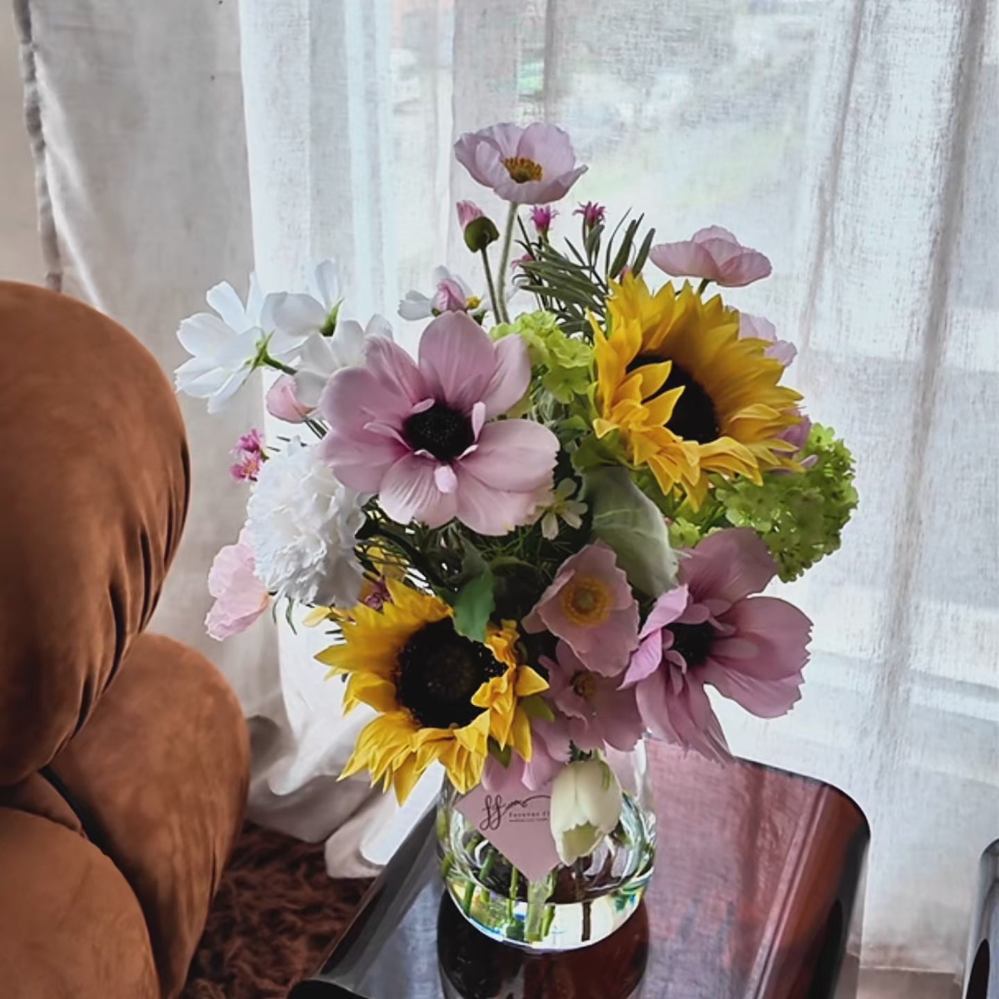 Real Touch Sunflowers and Coreopsis with Snowball, Tulips and Poppies set in Glass Vase and Artificial Water. This is a 360 degree flower arrangement.