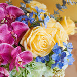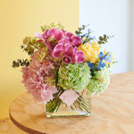 Real Touch Phalaenopsis Orchid, Dahlias, Roses, Spinning Gum, Hydrangeas, Larkspur and Queen Anne’s Lace in a rectangle vase. Flowers are permanently set in an artificial water. This is a 360-degree arrangement.