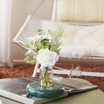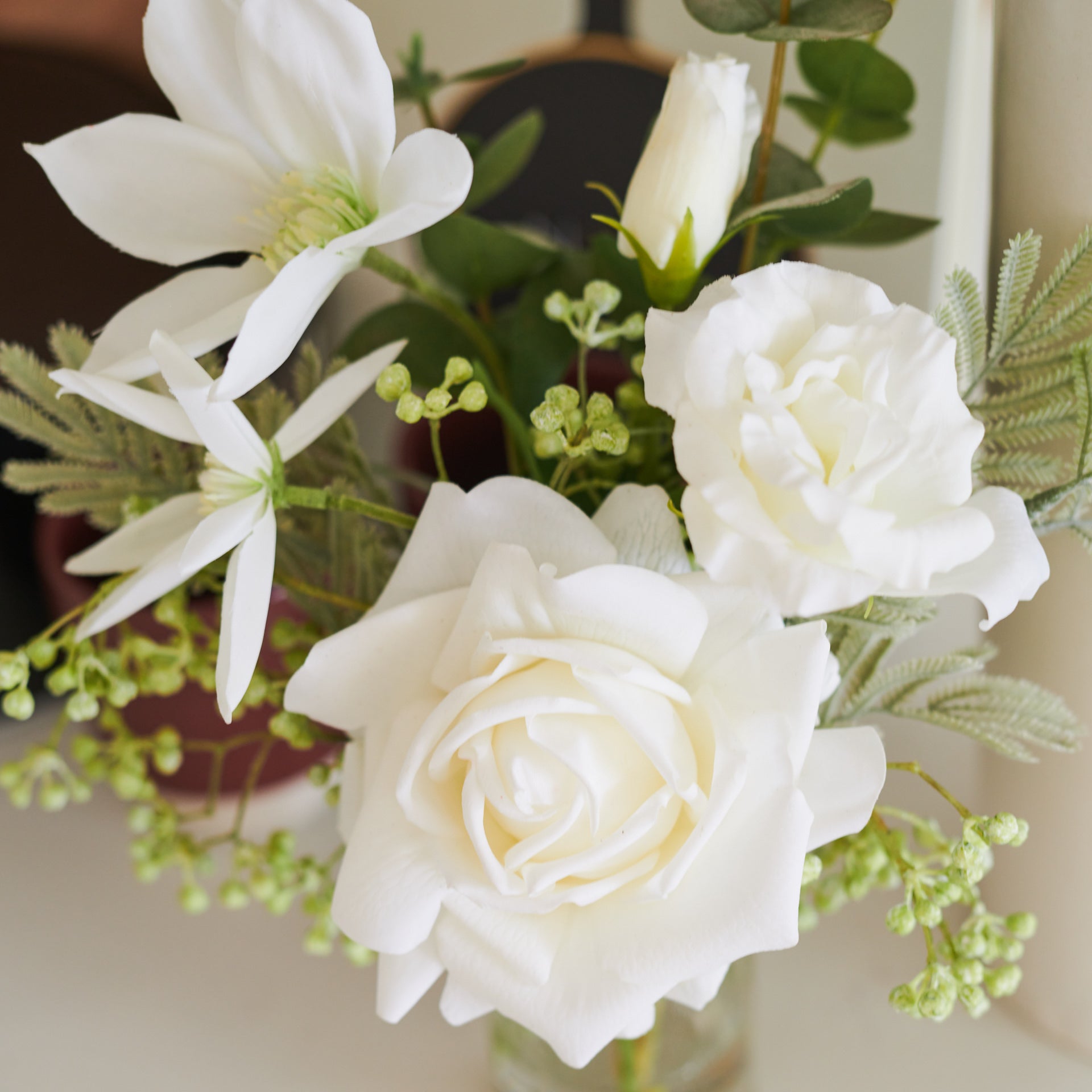 Real Touch Eucalyptus, Rose and Clematis Arrangement set in a Glass Vase with Artificial Water.