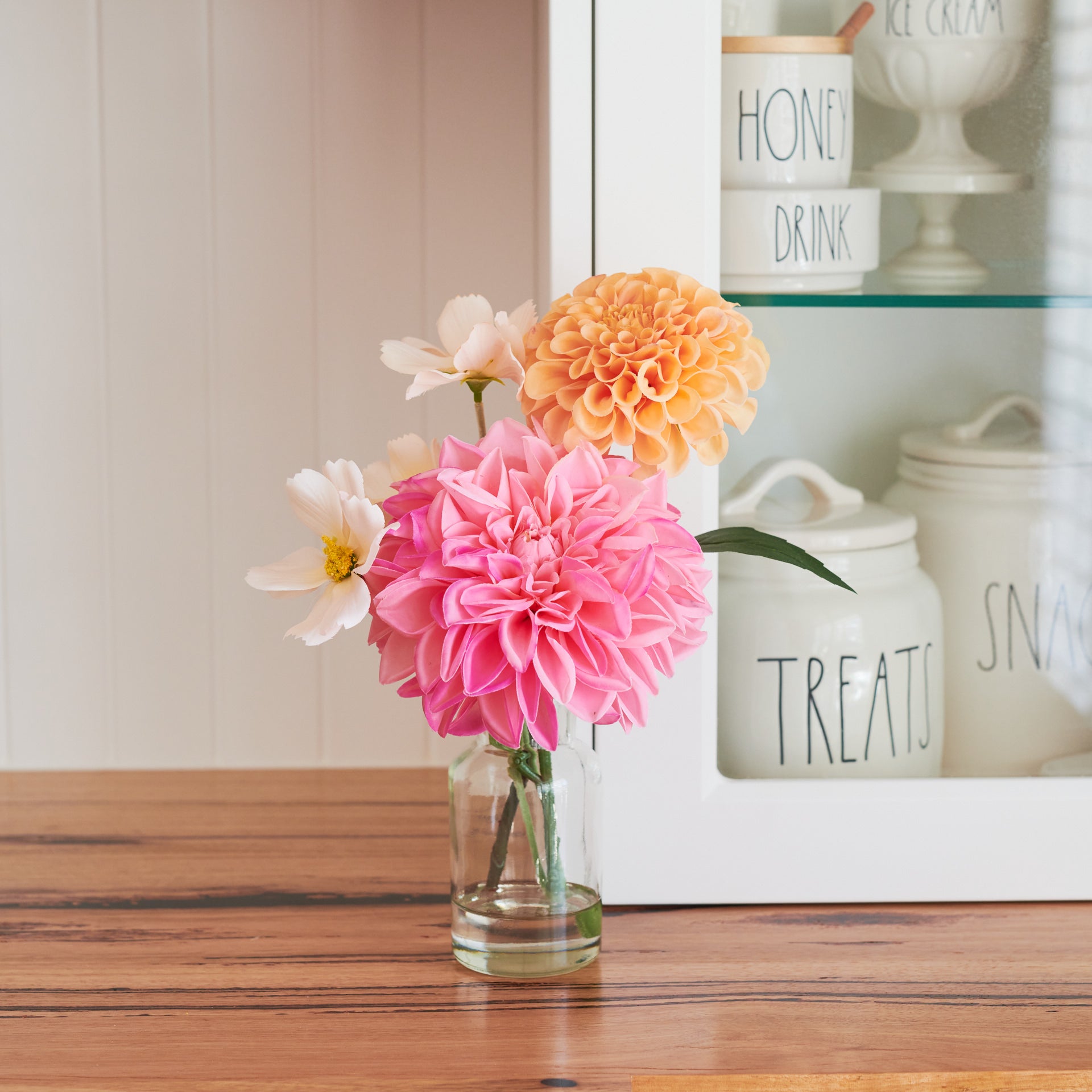 Vibrant real touch cosmo and pom dahlias set in artificial water in a glass vase.