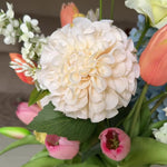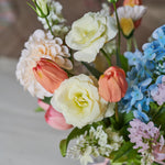 Real Touch Pom Dahlia, Hydrangea and Lilacs with Poppy, Tulips and Lisianthus set in a Glass Vase in Artificial Water.