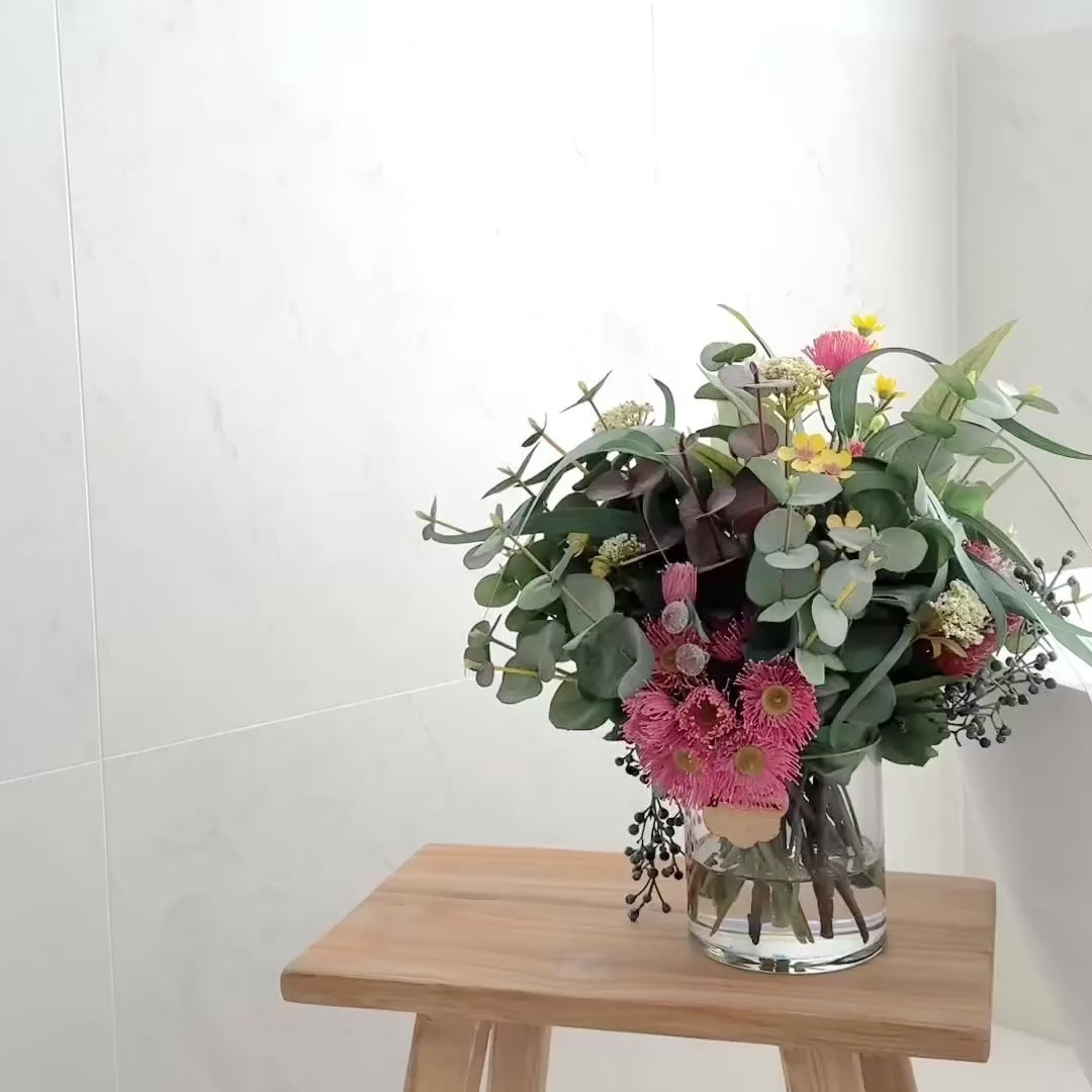 Designed from our best selling Bobby arrangement, this smaller 360’ native arrangement features seeded eucalyptus, leucospermum, banksias, was flower and peppercorn set in artificial water in a glass vase.