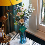 Real Touch Spinning Gum, mini Ranunculus and Astrantia set in Artificial Water in glass vase.