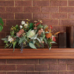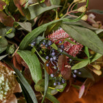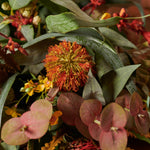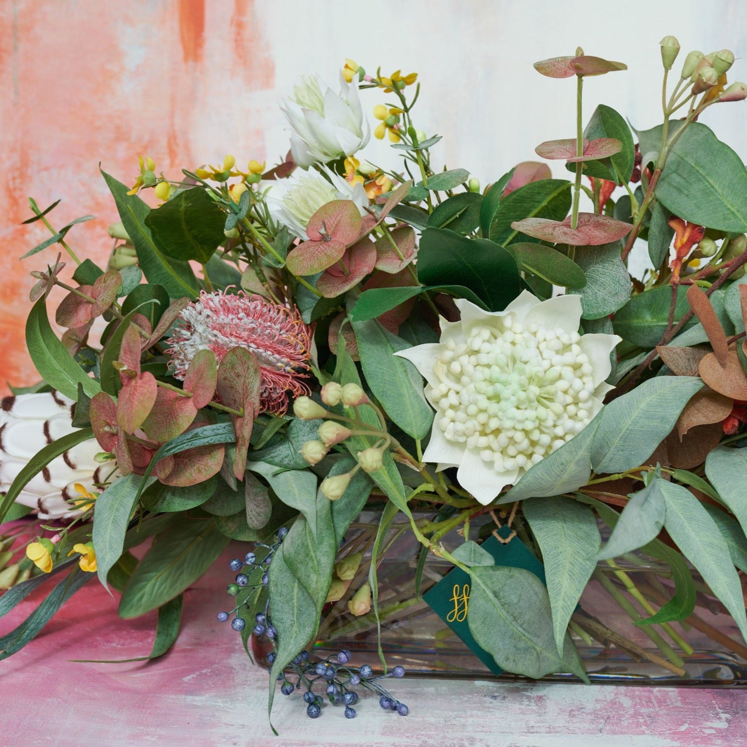 Real Touch Eucalyptus Silver Dollar Leaf, Waratah, Eucalyptus Leaf and Seed Spray, Eucalyptus Long Leaf Spray, Wax Flower, Protea Leucospermum Hybrid, Protea Leucadendron Spray, Waratah, Sawtooth Leaf, Peppercorn, Blushing Bride, Eucalyptus Seed, Kangaroo Paw, Blossoming Flower and Eucalyptus Pod Flowering in a Rectangle Vase and Artificial Water. This is a 360 degree arrangement.