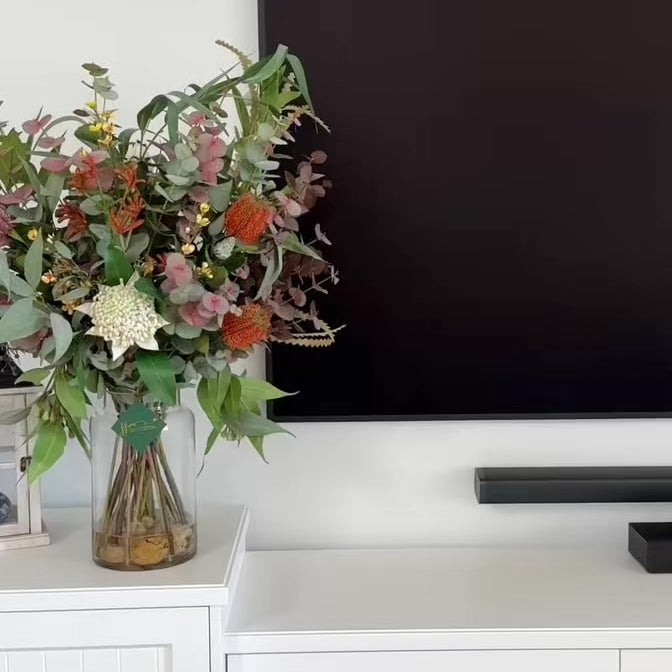Real Touch Eucalyptus Silver Dollar Leaf, Waratah, Eucalyptus Leaf and Seed Spray, Eucalyptus Long Leaf Spray, Wax Flower, Protea Leucospermum Hybrid, Protea Leucadendron Spray, Waratah, Sawtooth Leaf, Peppercorn, Blushing Bride, Eucalyptus Seed, Kangaroo Paw, Blossoming Flower and Eucalyptus Pod Flowering in a Squat Dome Vase and Artificial Water. This is a 360 degree arrangement.