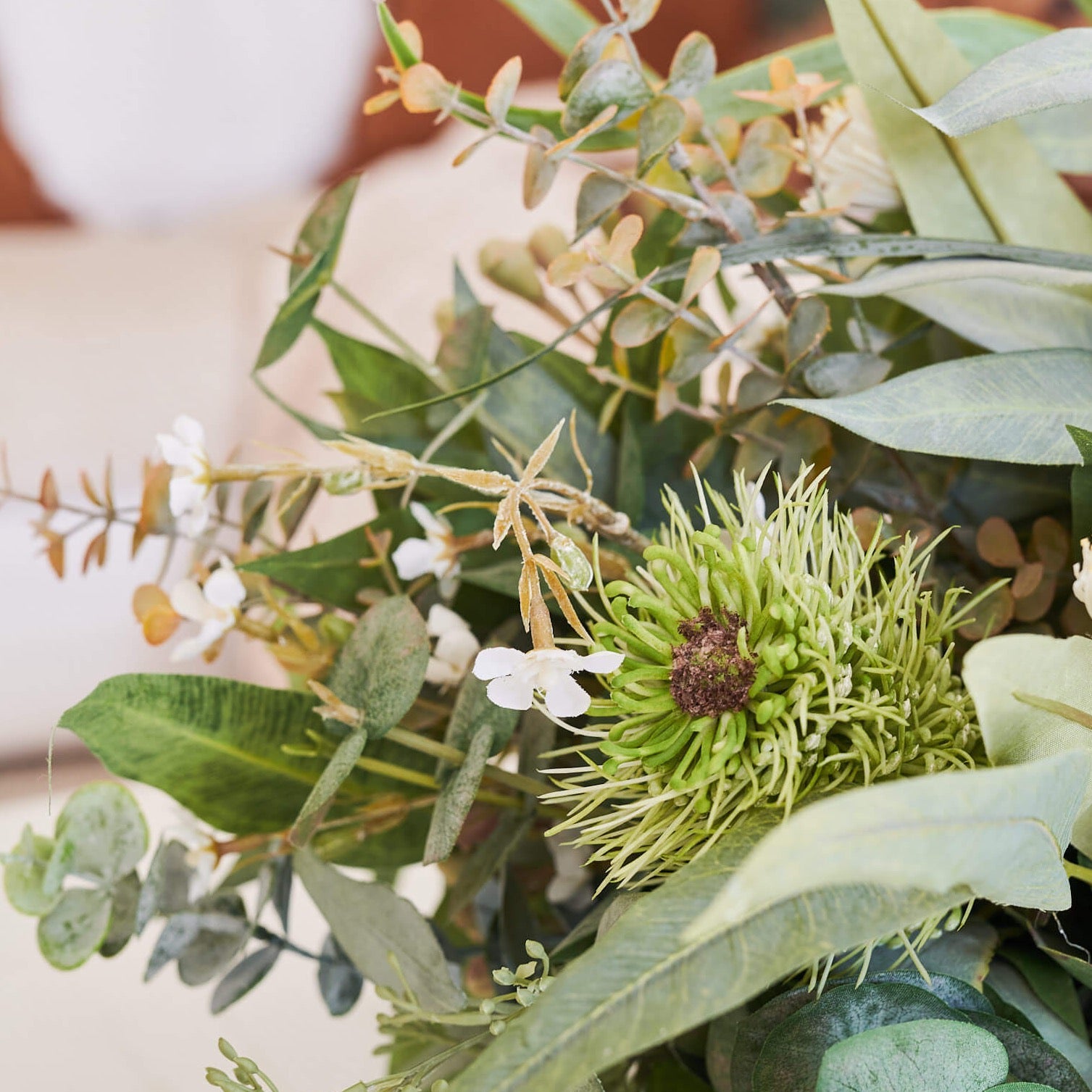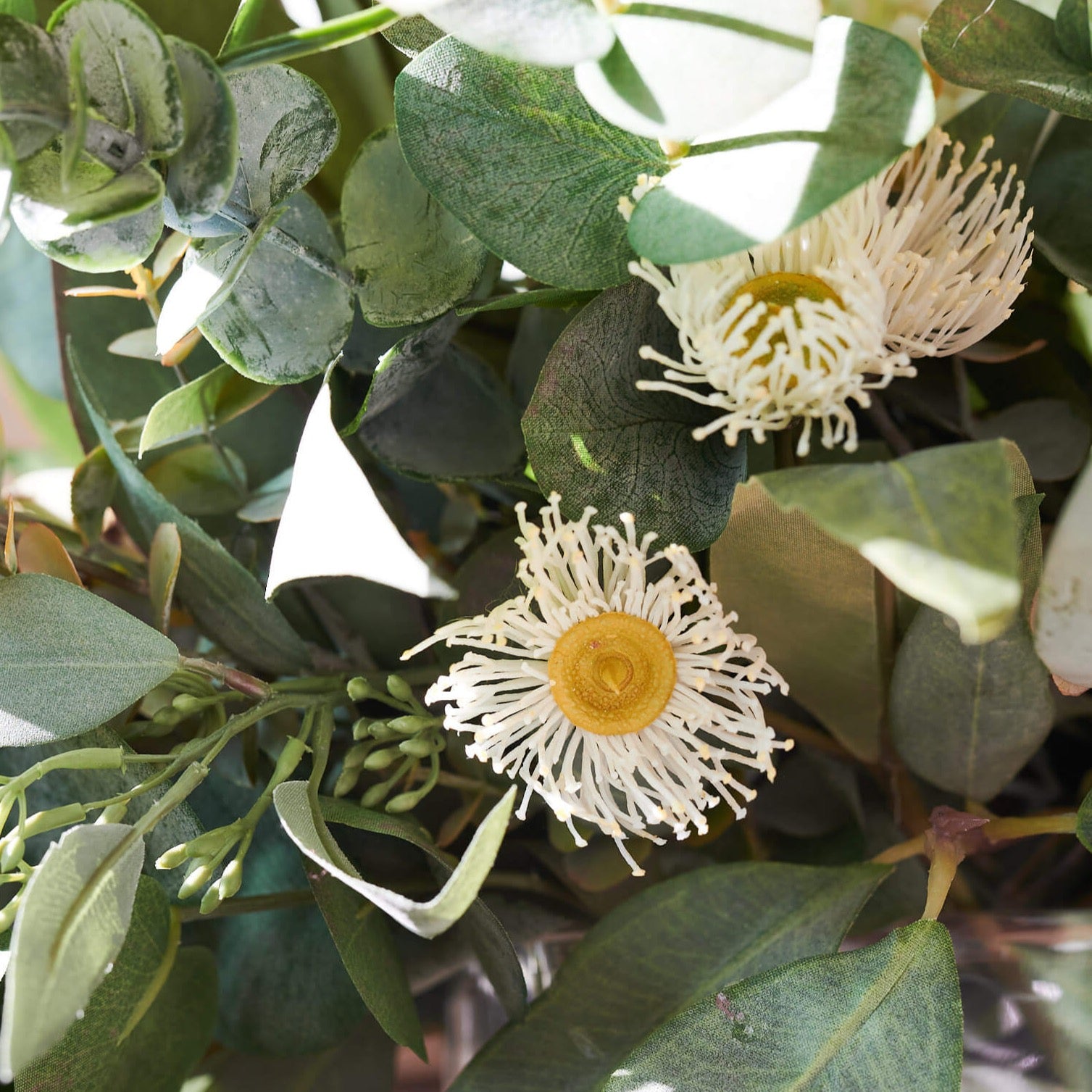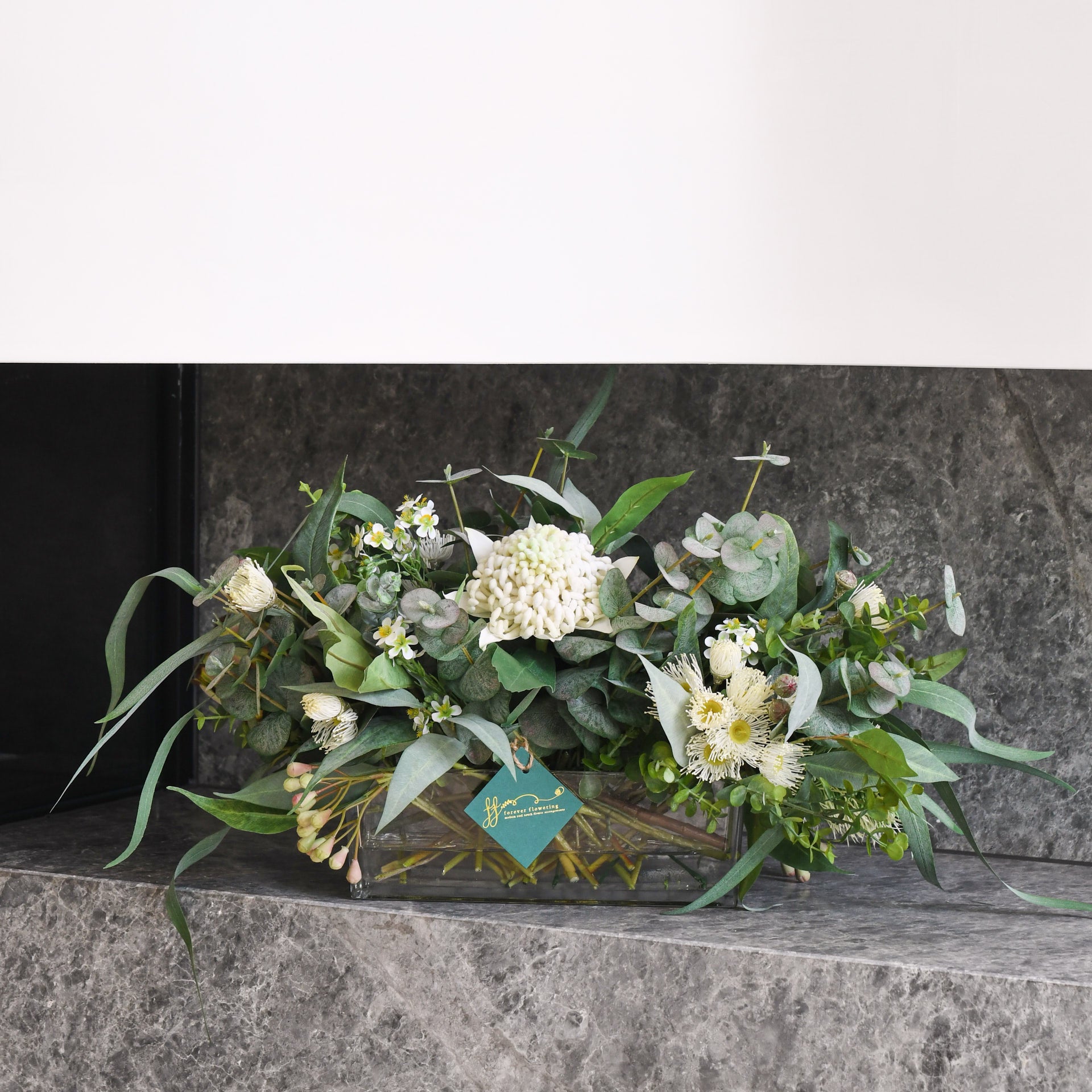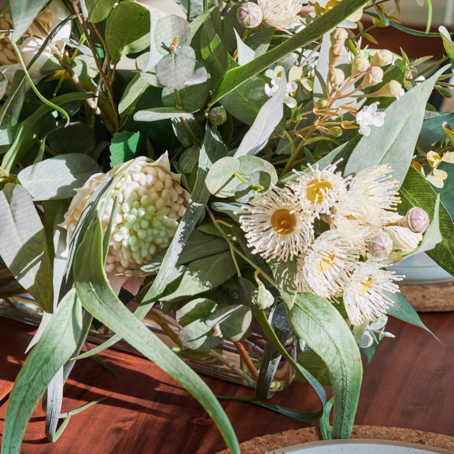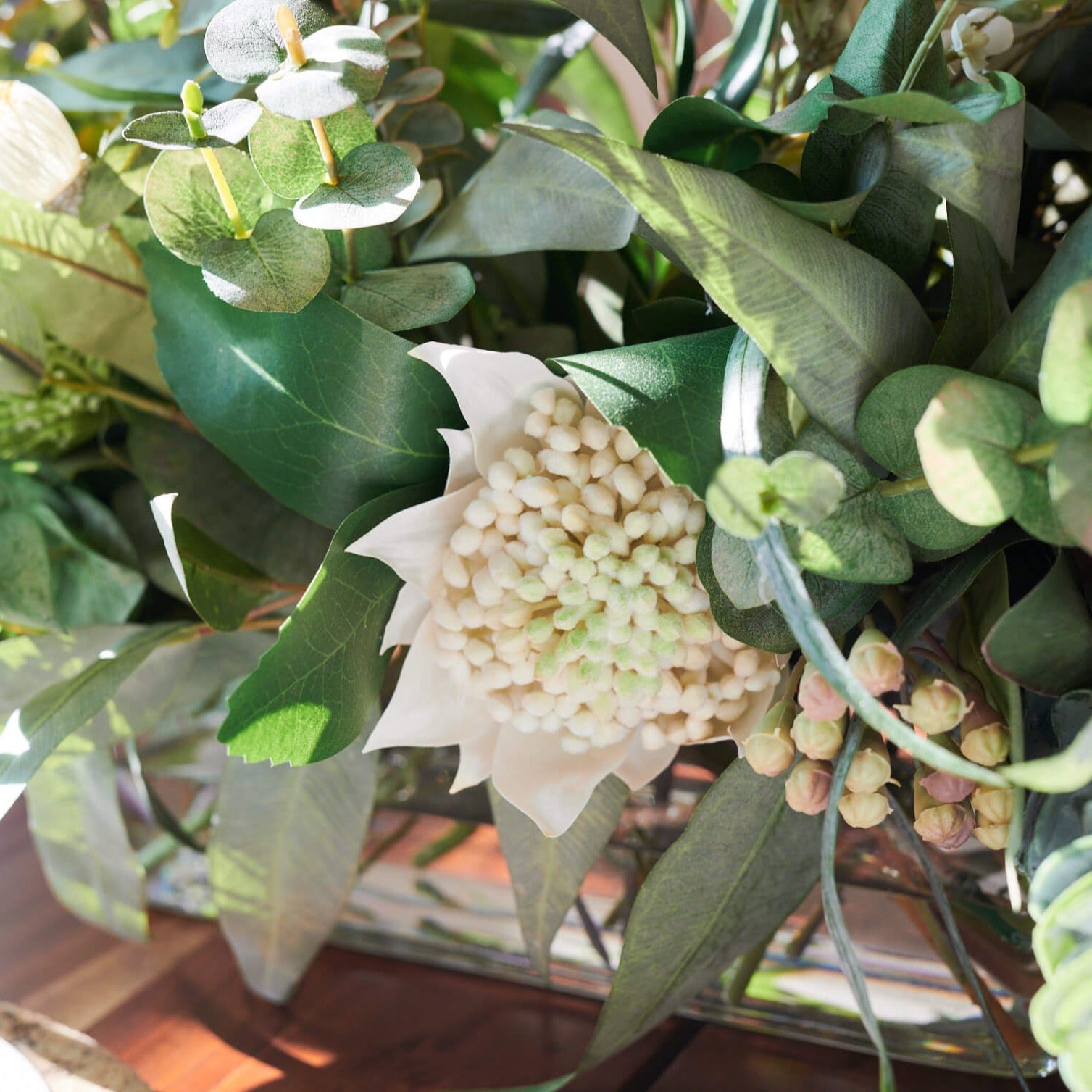 Real Touch Eucalyptus Silver Dollar Leaf, Waratah, Eucalyptus Leaf and Seed Spray, Eucalyptus Long Leaf Spray, Stephanotis Spray, Protea Leucospermum Hybrid, Protea Leucadendron Spray, Blossoming Flower and Eucalyptus Pod Flowering in a Rectangle Vase and Artificial Water. This is a 360 degree flower arrangement.