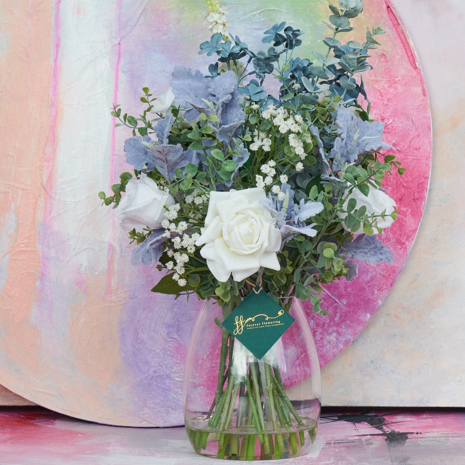Real Touch Roses, Babys Breath, Eucalyptus Silver Dollar, Clover Spray, Mini Gum Eucalyptus Leaf and Dusty Miller in Belly Vase and Artificial Water. This is a 360 degree flower arrangement.