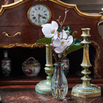 Real Touch Magnolia Flower Spray, Willow Brand and Magnolia Leaf mix in Vintage Glass Bottle. Flowers are permanently set in artificial water.