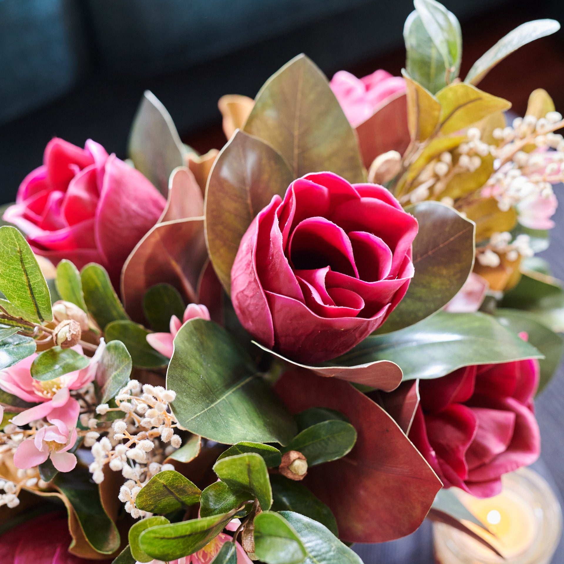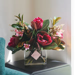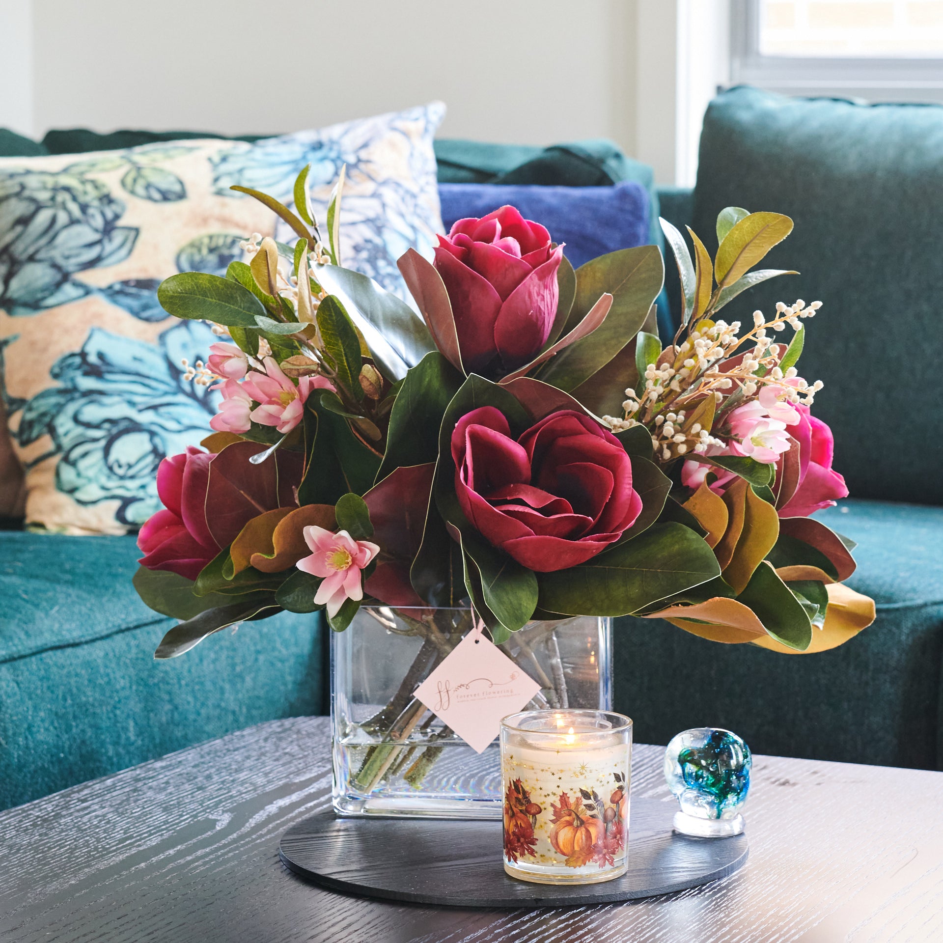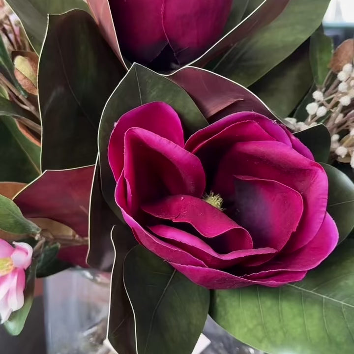 Real Touch Burgundy Magnolia Flowers, Magnolia Leaves, Willow and Branch Sticks and Magnolia Spray in a Rectangle Vase and Artificial Water. This is a 360-degree flower arrangement.