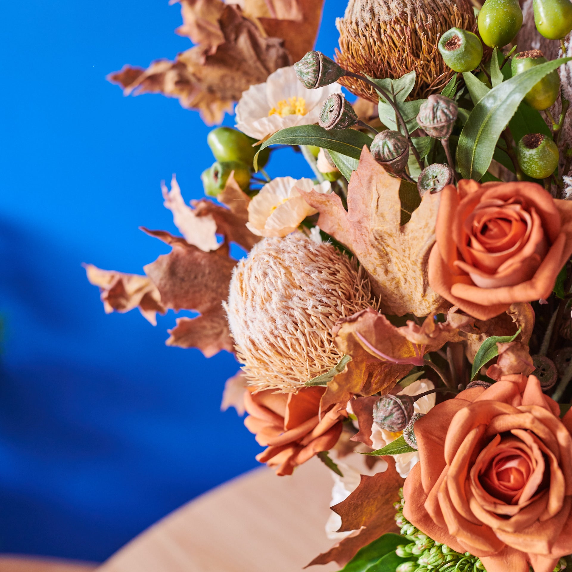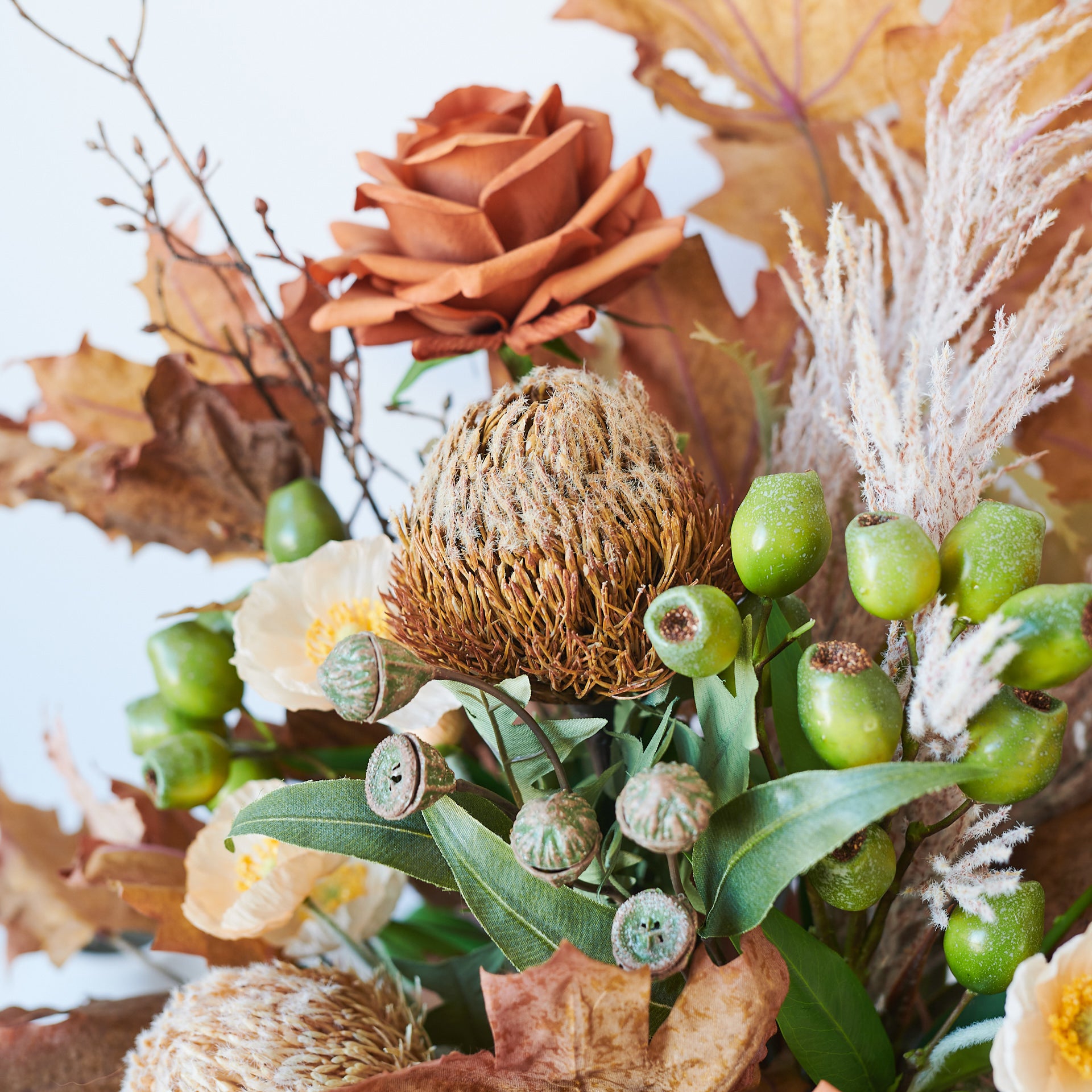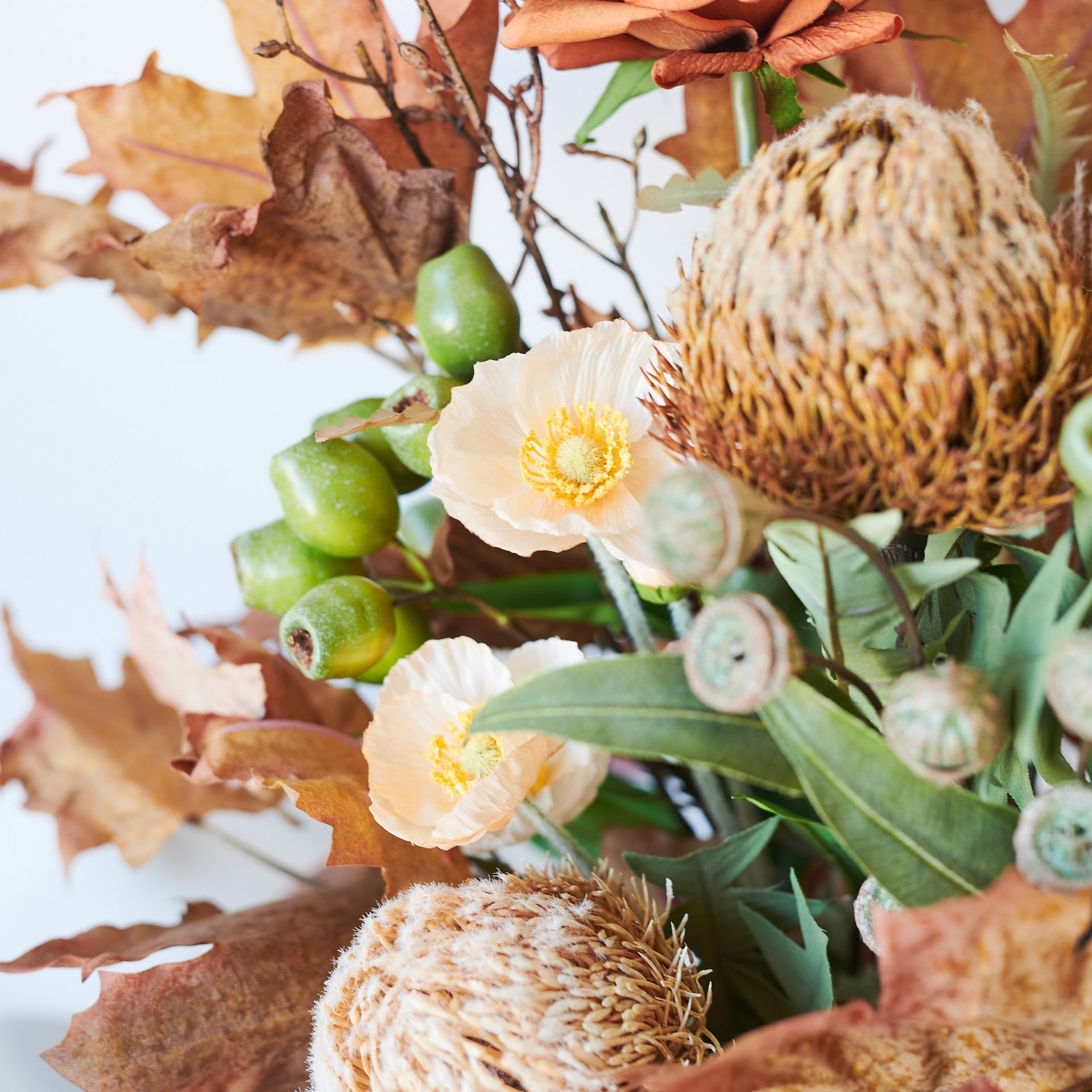 Real Touch Artificial Banksia, Roses and Poppies with Gum Nuts, Kalanchoe buds and Maple Autumn leaves. This arrangement is single sided.