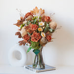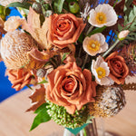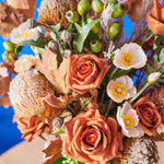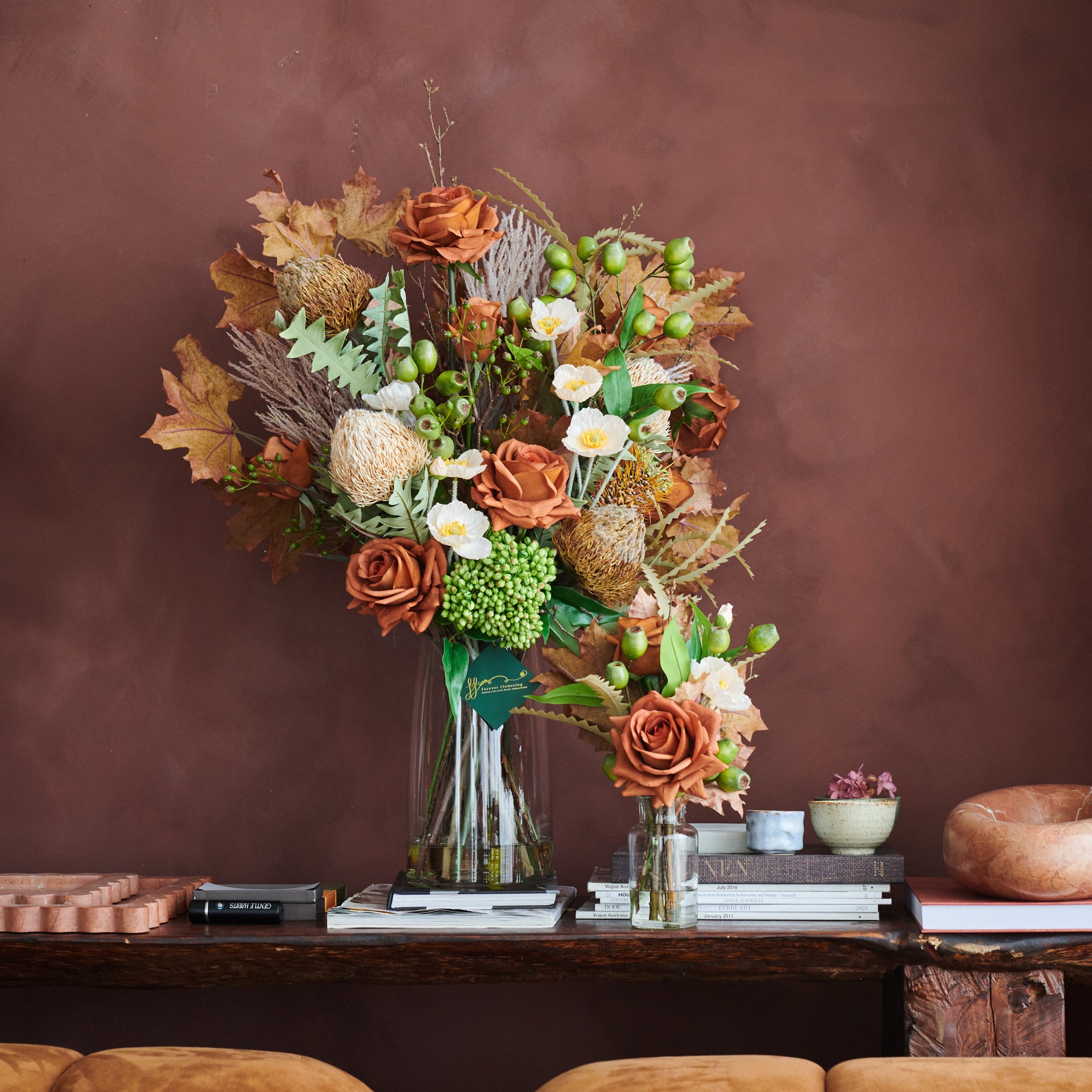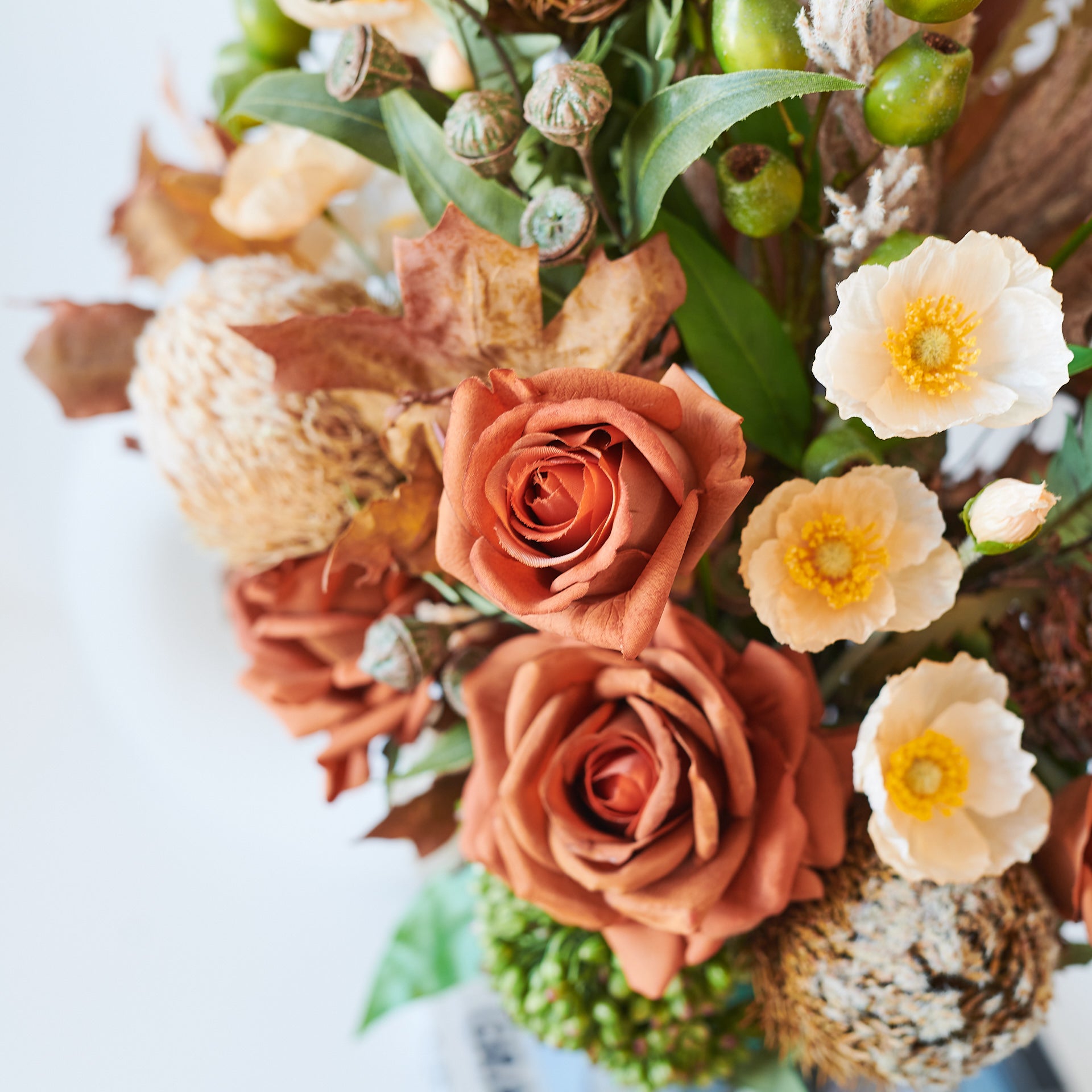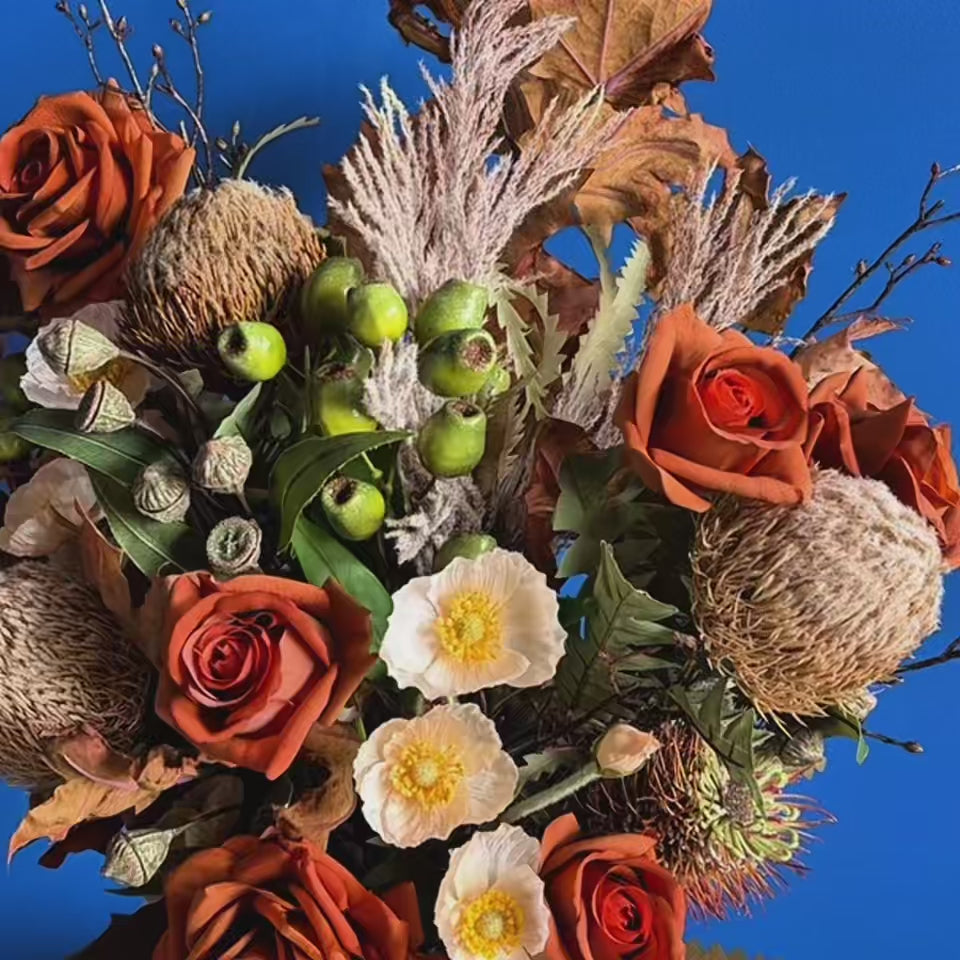 Real Touch Artificial Banksia, Roses and Poppies with Gum Nuts, Kalanchoe buds and Maple Autumn leaves. This arrangement is single sided.