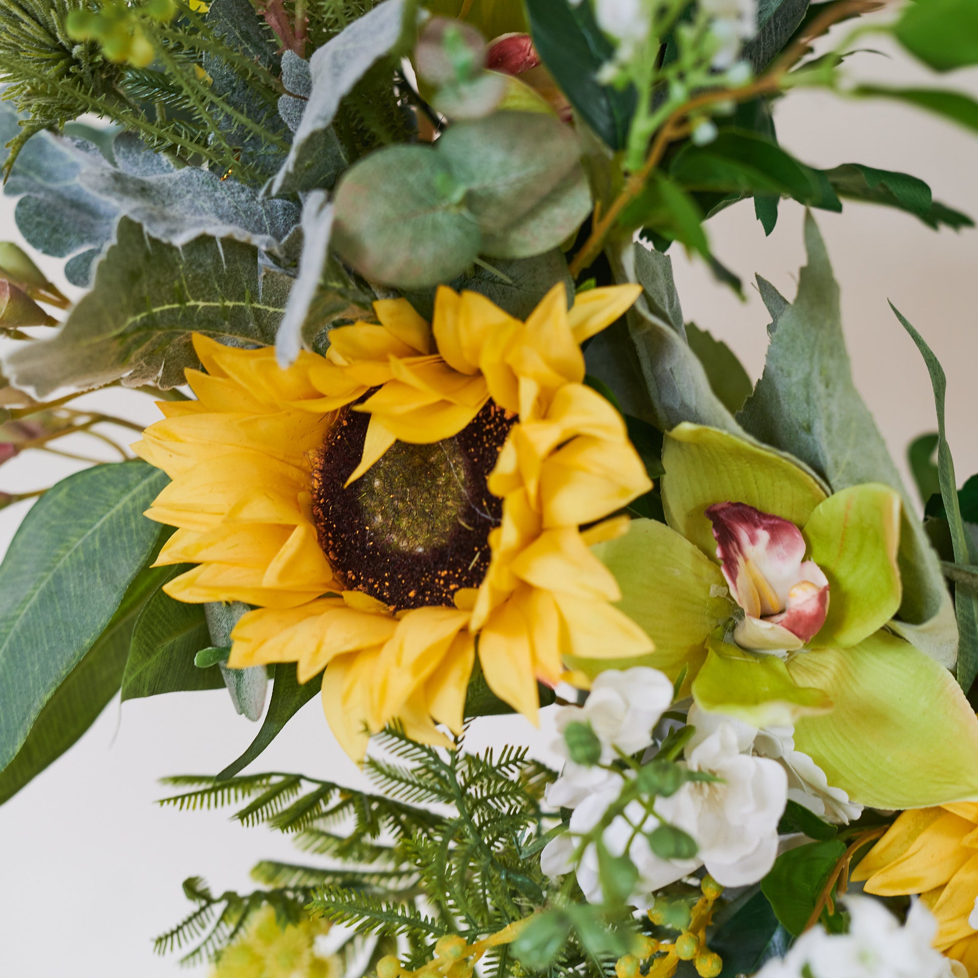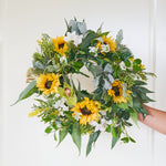 Handmade Wreath for Christmas or all year round! Made with a combination of Real Touch Eucalyptus, Sunflower, Seeded Gum, Orchid and Dusty Miller.