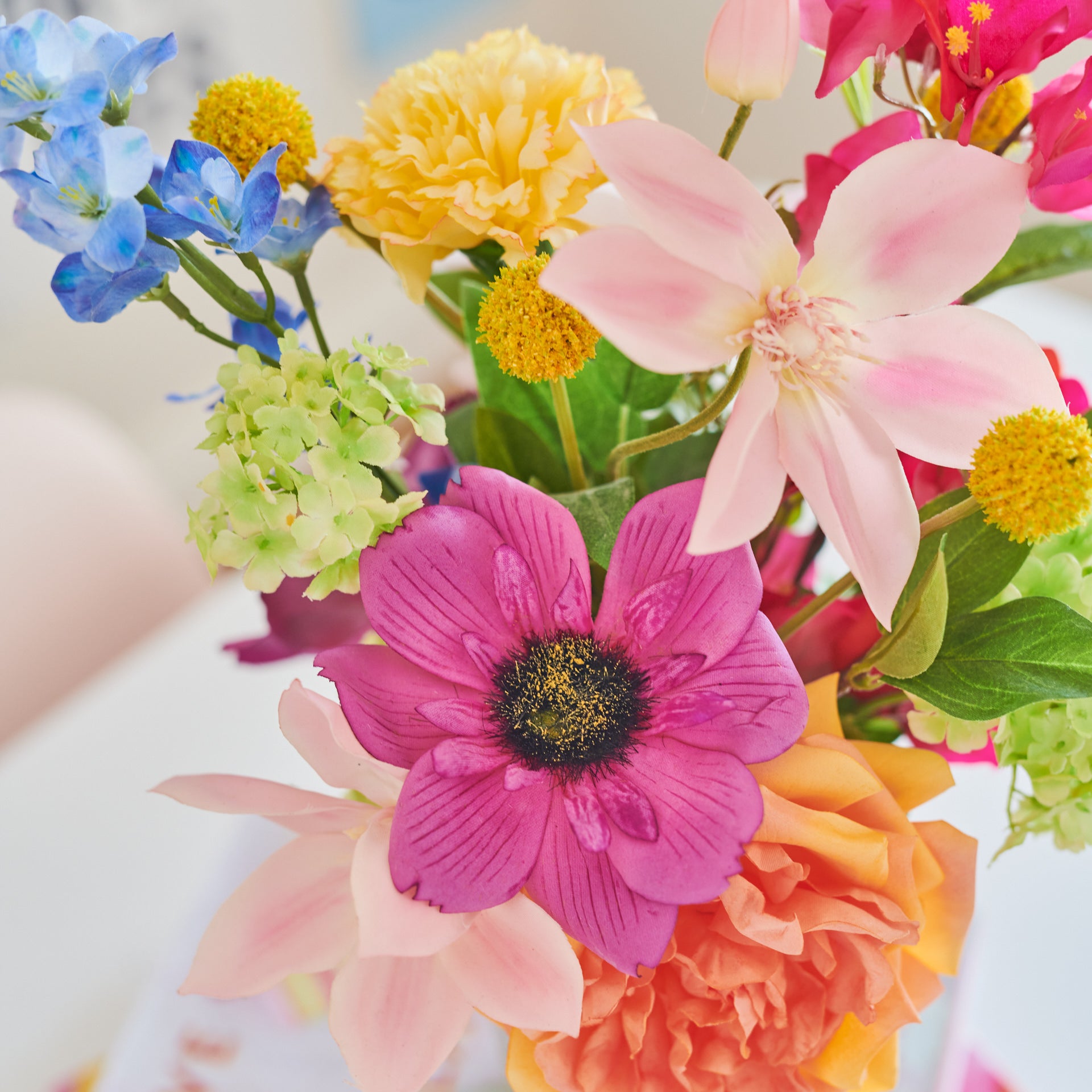 Mischief : A colourful arrangement including Real Touch Clematis, Austin Rose and Snowball with Billy Buttons, Larkspur, Carnation, Enki Leaf and Bougainvillea set in a Glass Vase in Artificial Water
