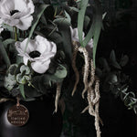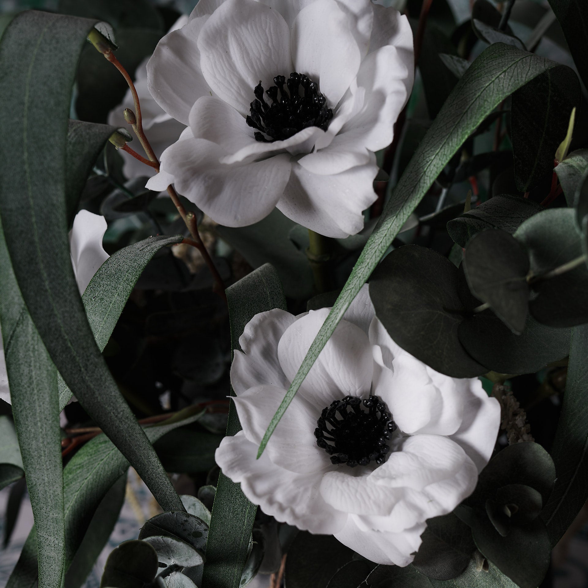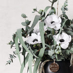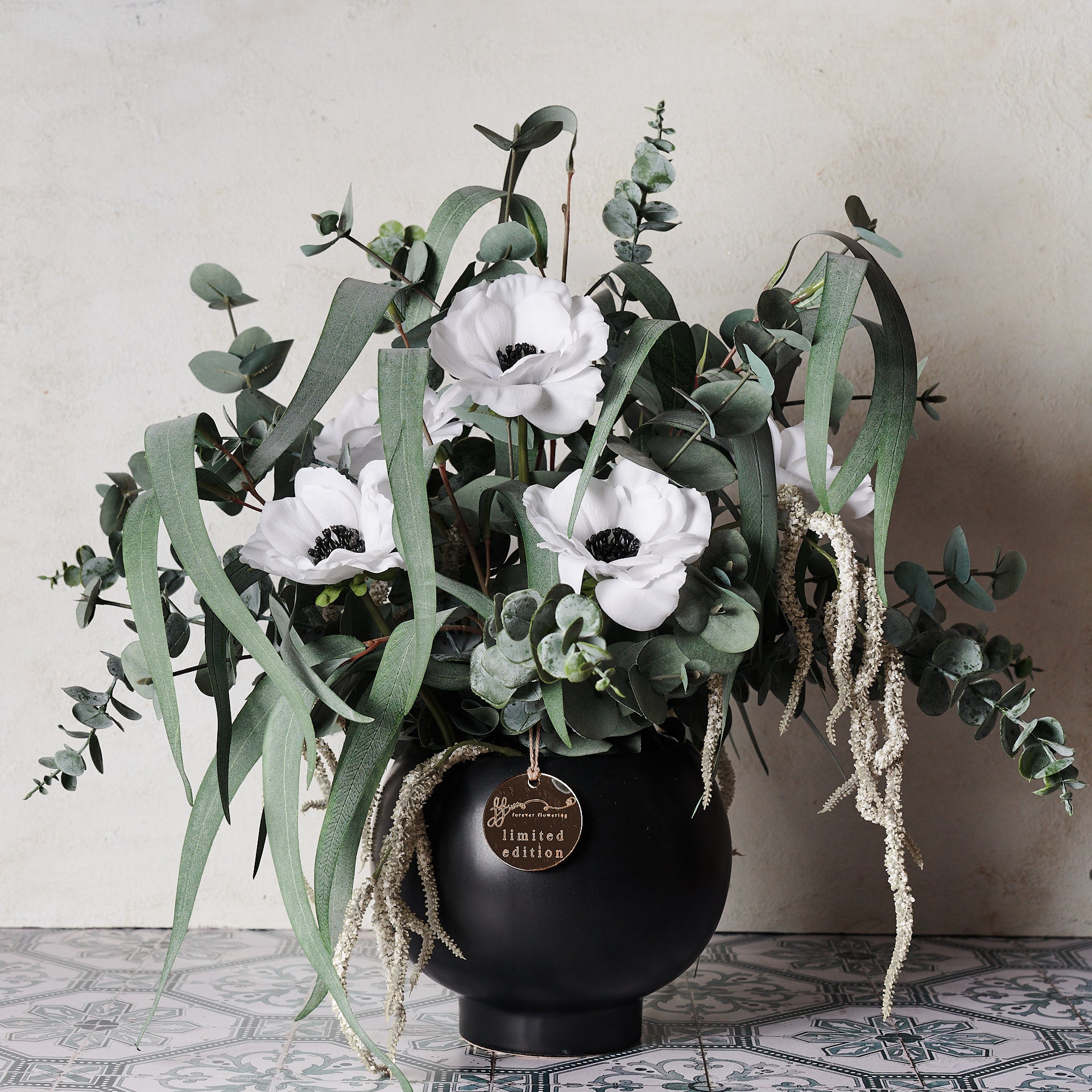Real Touch Anemones, Amaranthus Spray, Eucalyptus Long Leaf Spray, Eucalyptus Silver Dollar and Spinning Gum in Ceramic Pot. This is 360-degree flower arrangement. Includes our signature Gold Limited Edition Tag.