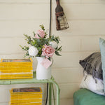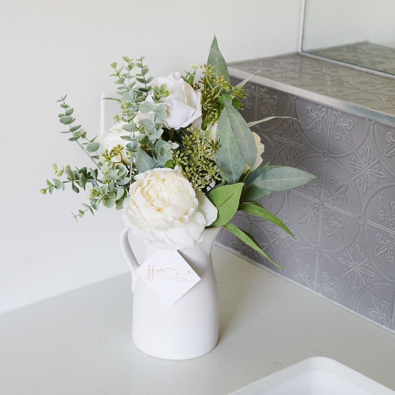 Real Touch Artificial Eucalyptus Seed Leaf, Mini Gum Eucalyptus Seed Leaf, Peonies and Roses in Matt White Ceramic Jug