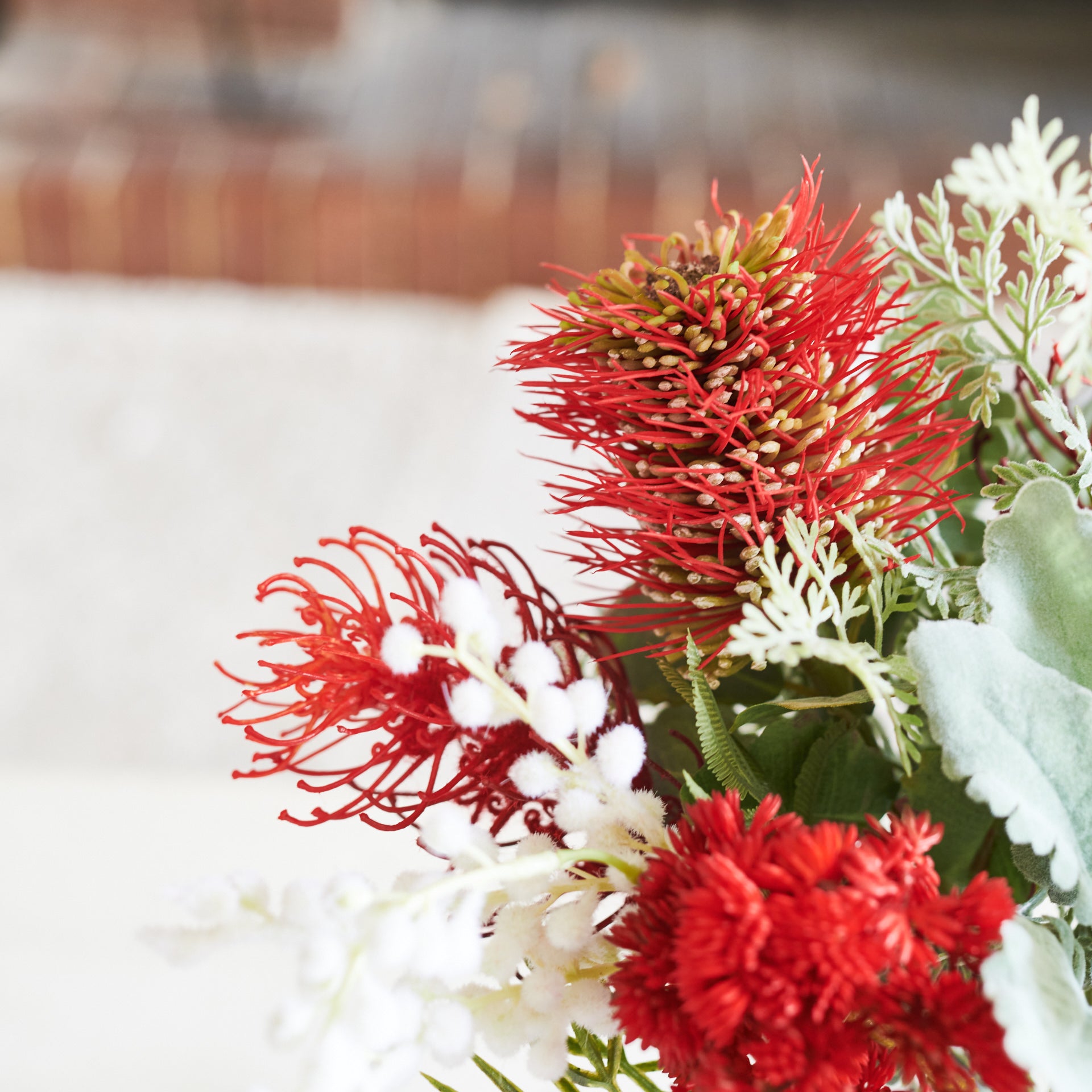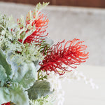Real Touch Grevillea Spray, Sedum and Dusty Miller with Wattle and Banksia in a Ribbed Glass Vase and artificial water.