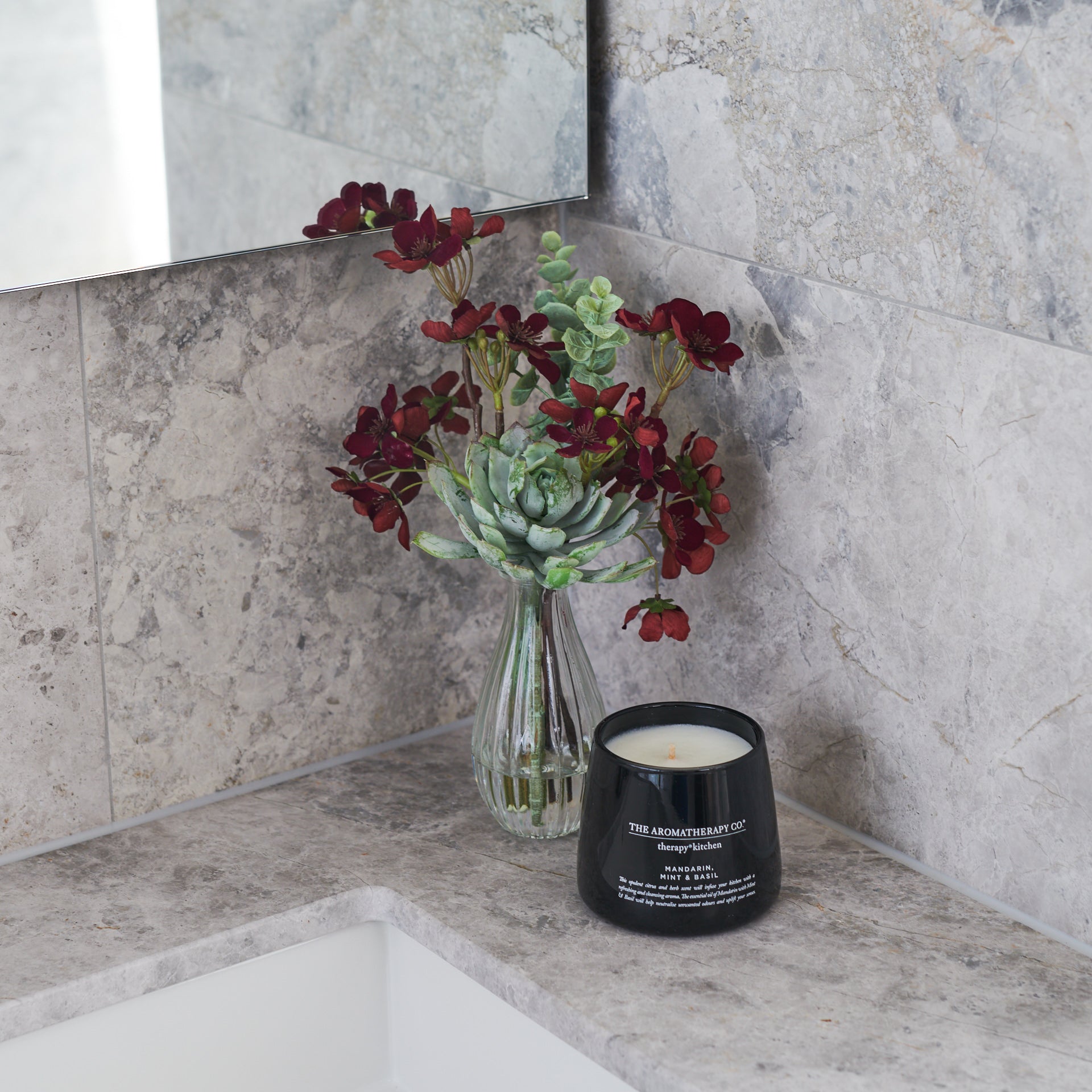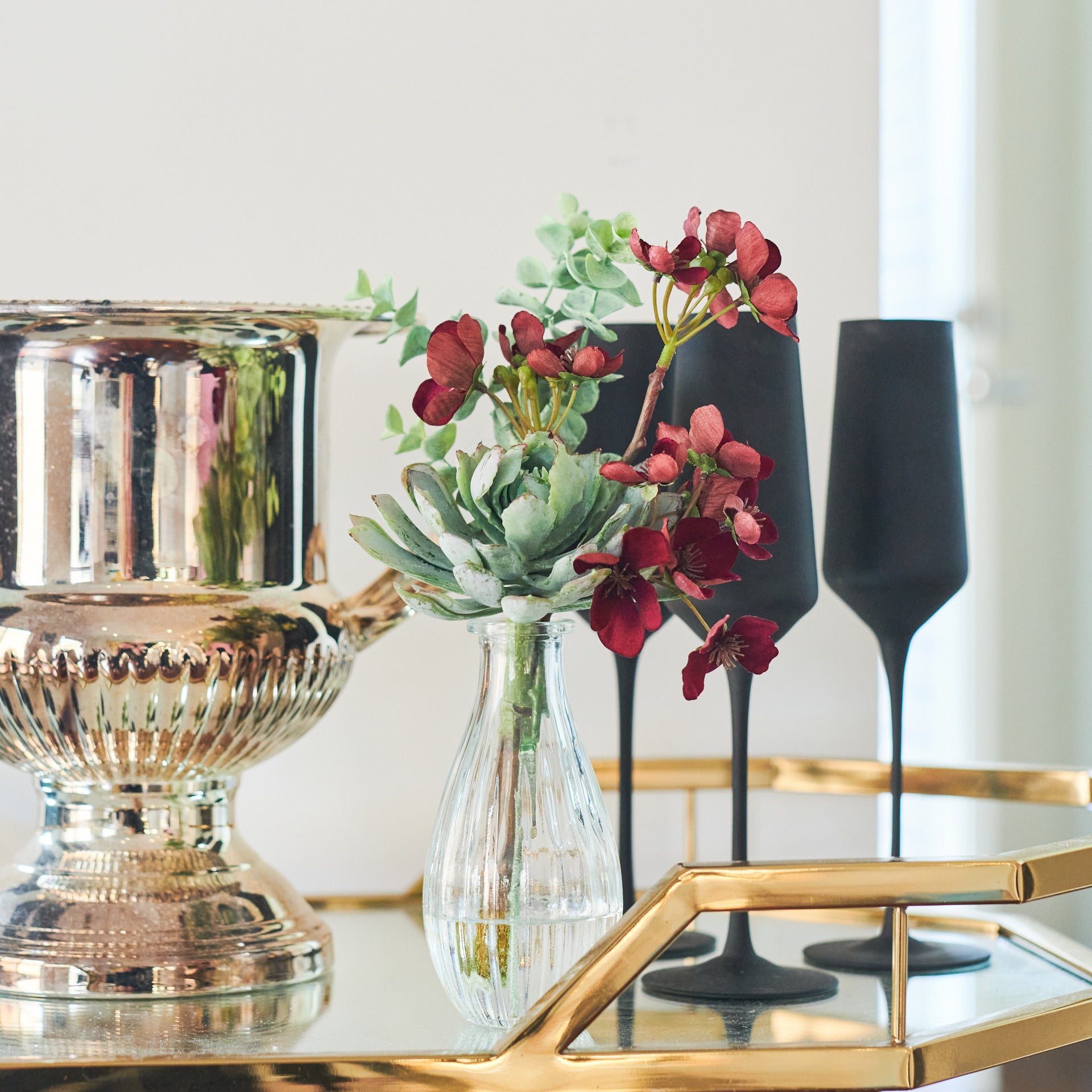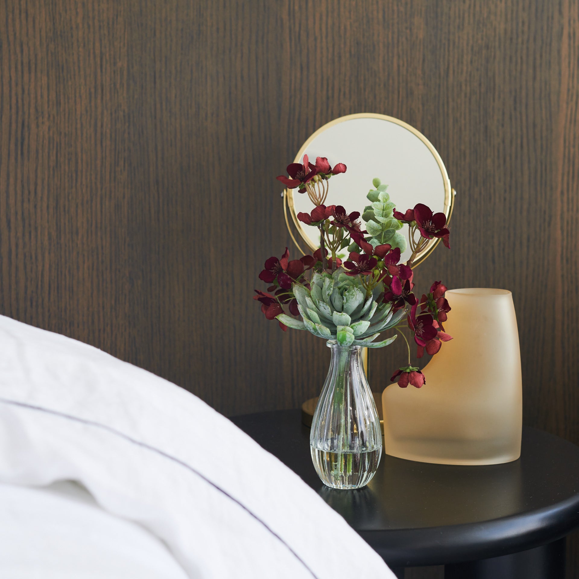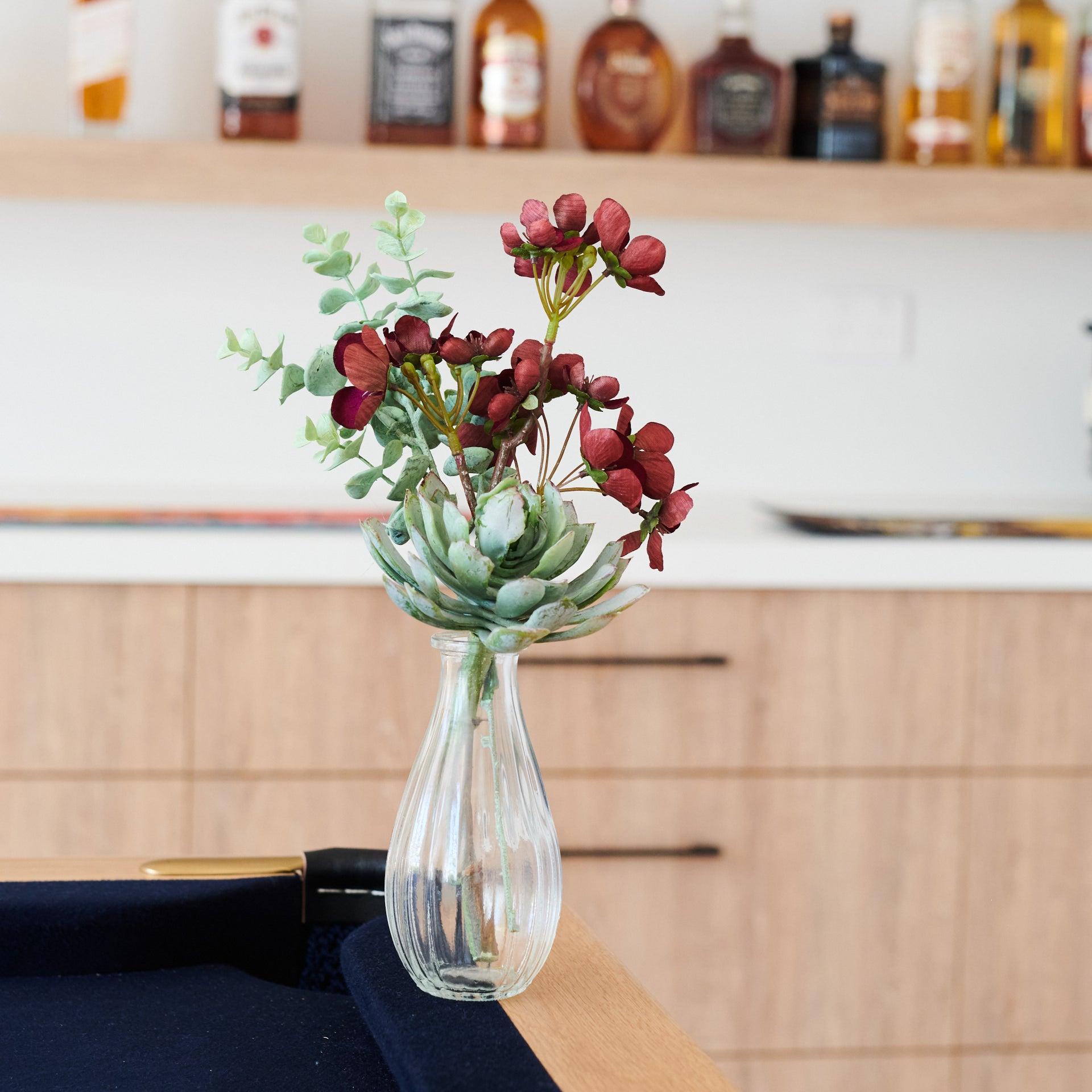 Real Touch Eucalyptus, Begonia and Succulent, permanently set in a ribbed glass vase and artificial water.