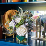 Real Touch Clover Spray, Spinning Gum Leaf, Astilbe, Mini Gum Eucalyptus Spray, Roses, Babys Breath and Dusty Miller in a Cylinder Vase and Artificial Water. This is a 360 degree arrangement.