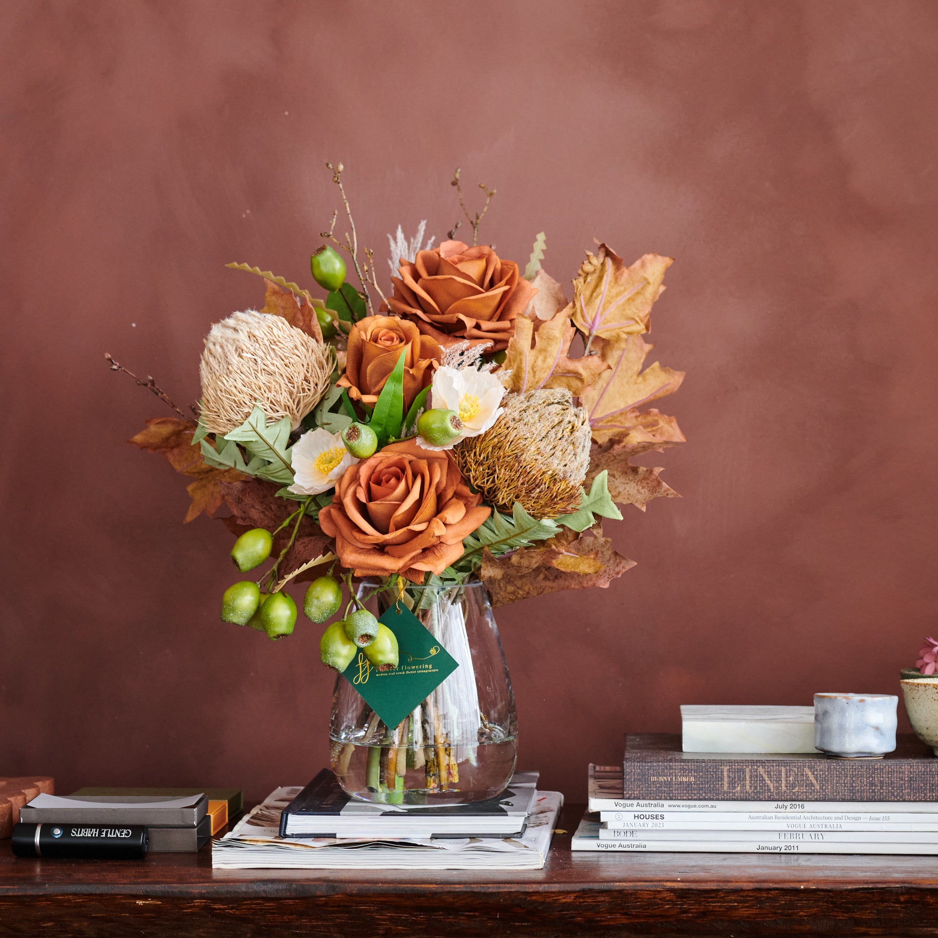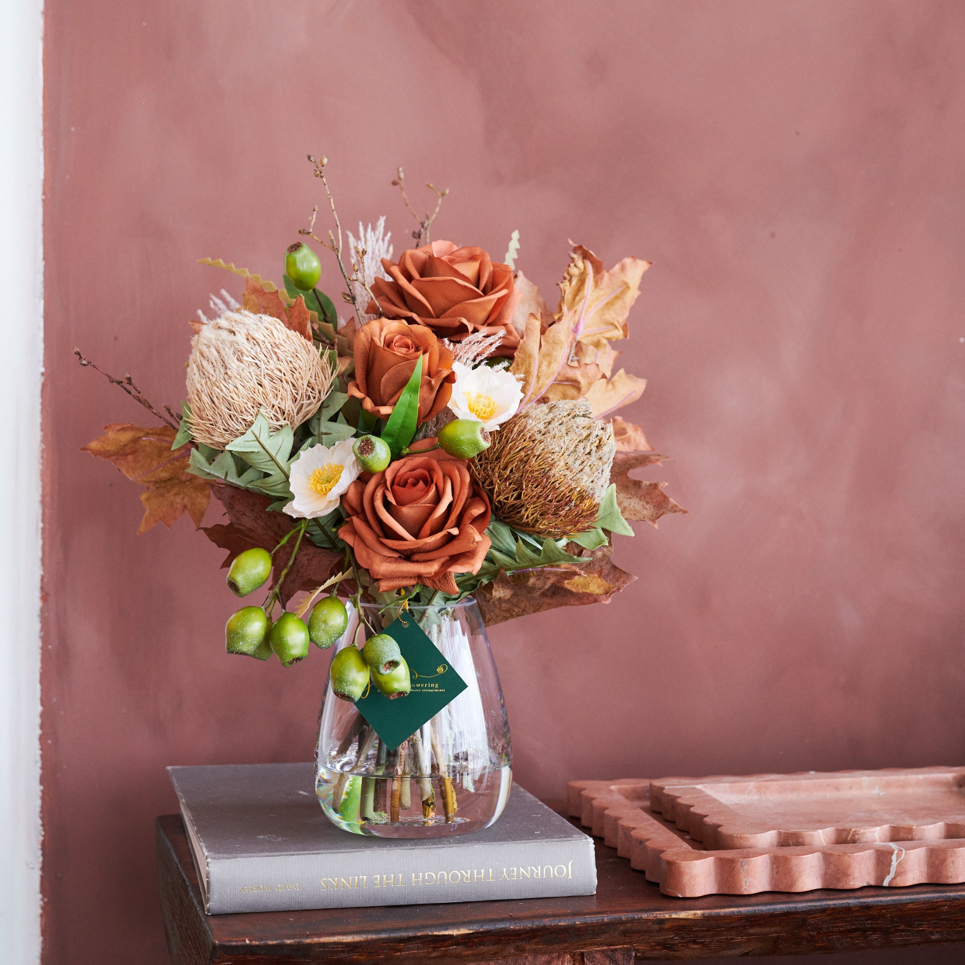Real Touch Artificial Banksia, Roses and Poppies with Gum Nuts and Maple Autumn leaves. This arrangement is single sided.