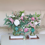 Little Jay - Real touch eucalyptus, dollar gum and pepper berry with astrantia, ranunculus and roses, set in artificial water in glass vase.
