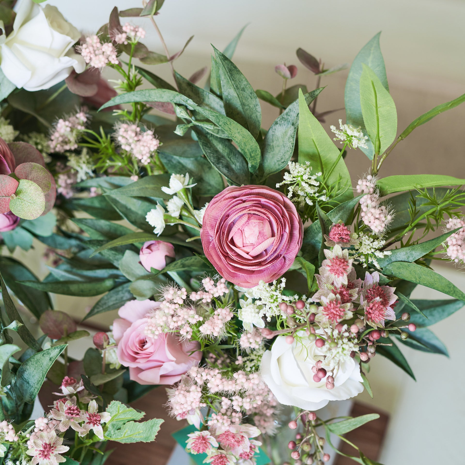 Jamiee - Real touch eucalyptus, dollar gum and pepper berry with astrantia, ranunculus and roses, set in artificial water in glass vase.