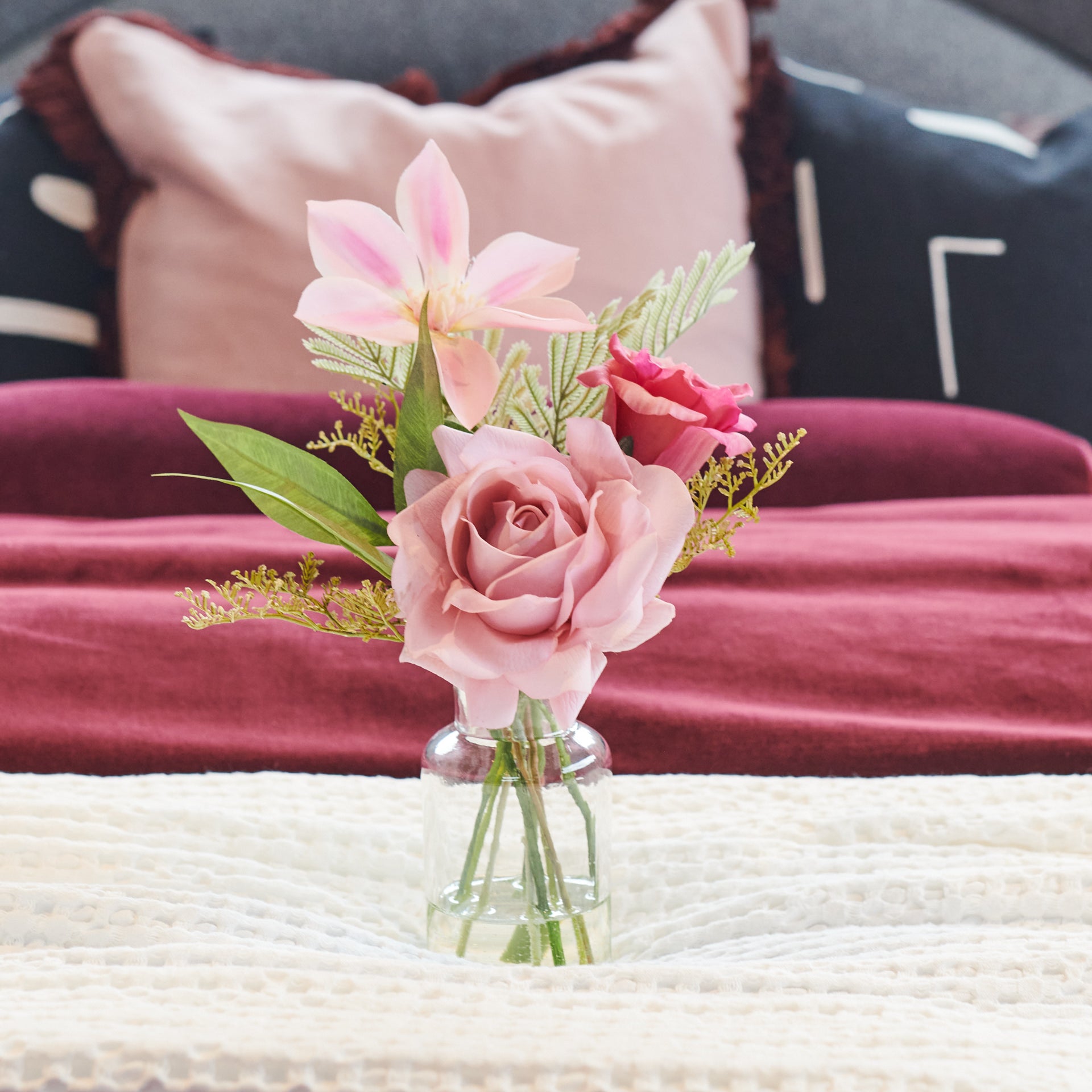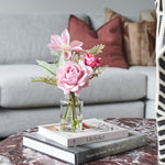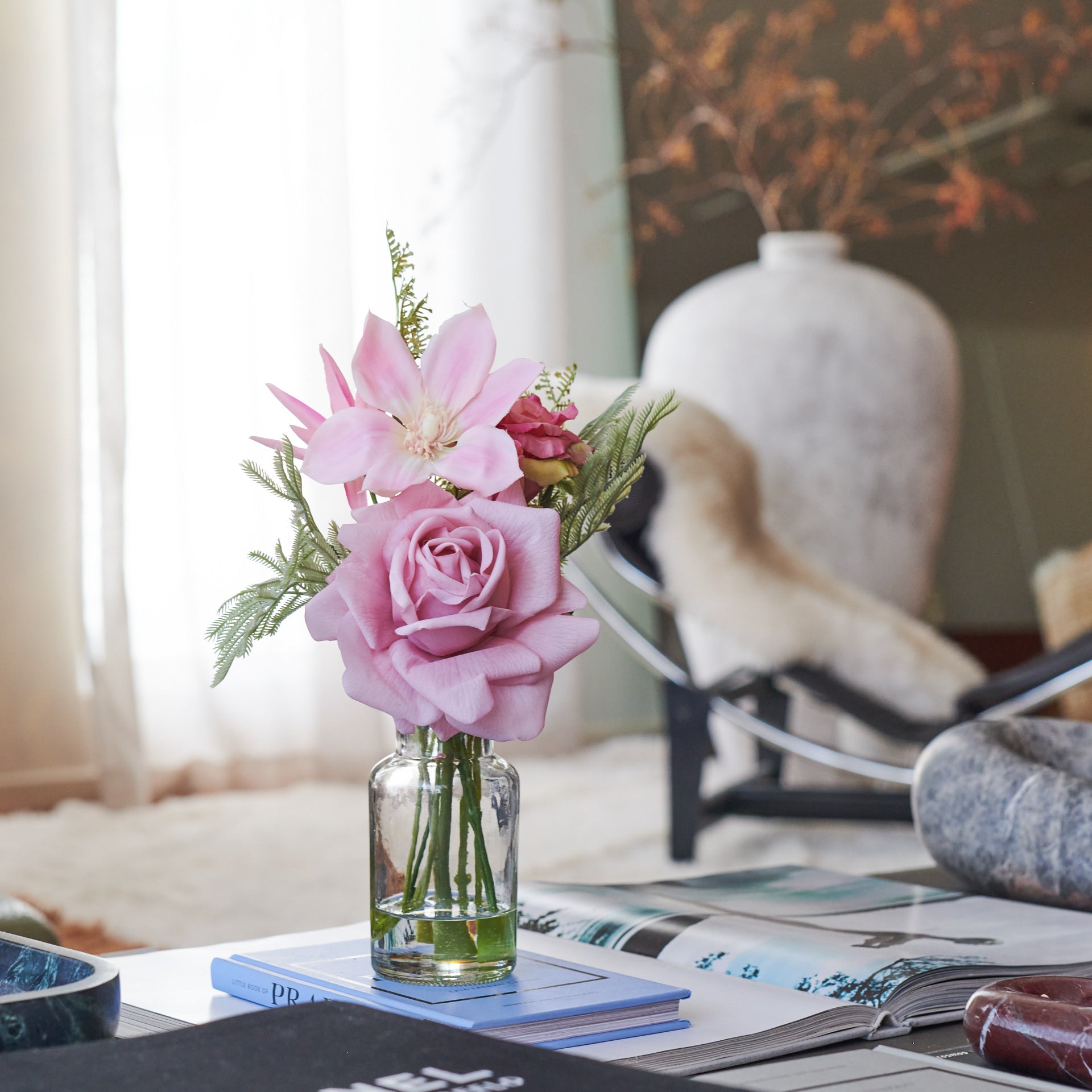 Real Touch Eucalyptus, Rose and Clematis with Limonium set in a Glass Vase with Artificial Water.