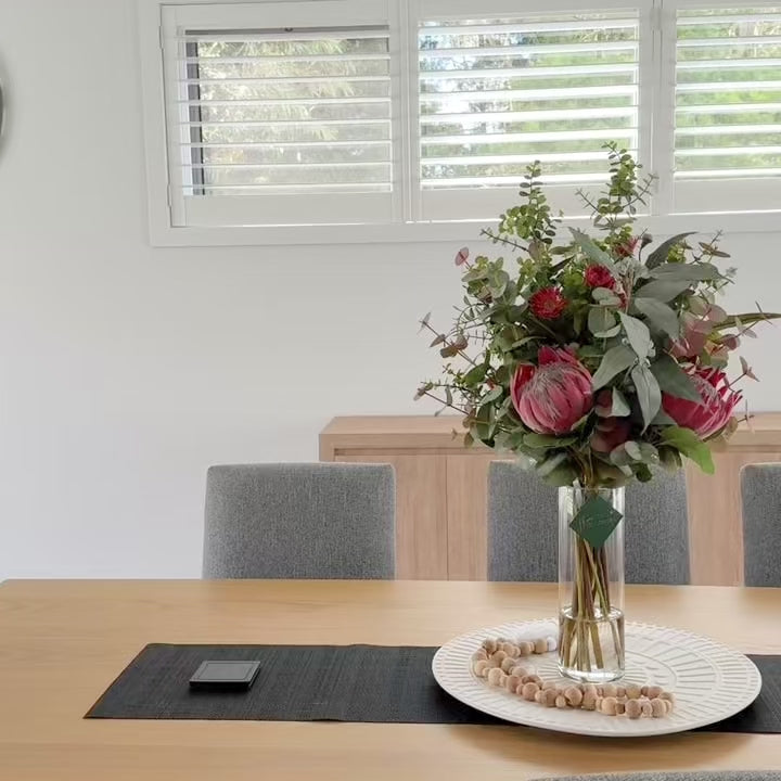 Real Touch King Proteas, Eucalyptus Silver Dollar, Mini Gum Eucalyptus Leaf, Tetragons Gum Nuts and Eucalyptus Gum Blossom Spray in Cylinder Vase in Artificial Water. This is a 360 degree flower arrangement.