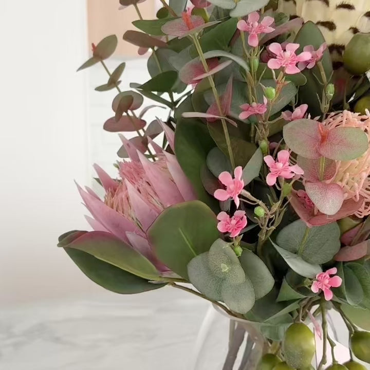 Real Touch Artificial Protea, Gum Nuts, Eucalyptus Leaves, Blossom Flower, Leucosperum Pin Cushion and Wax Flower spray in Belly Vase and Artificial Water. 360 degree flower arrangement