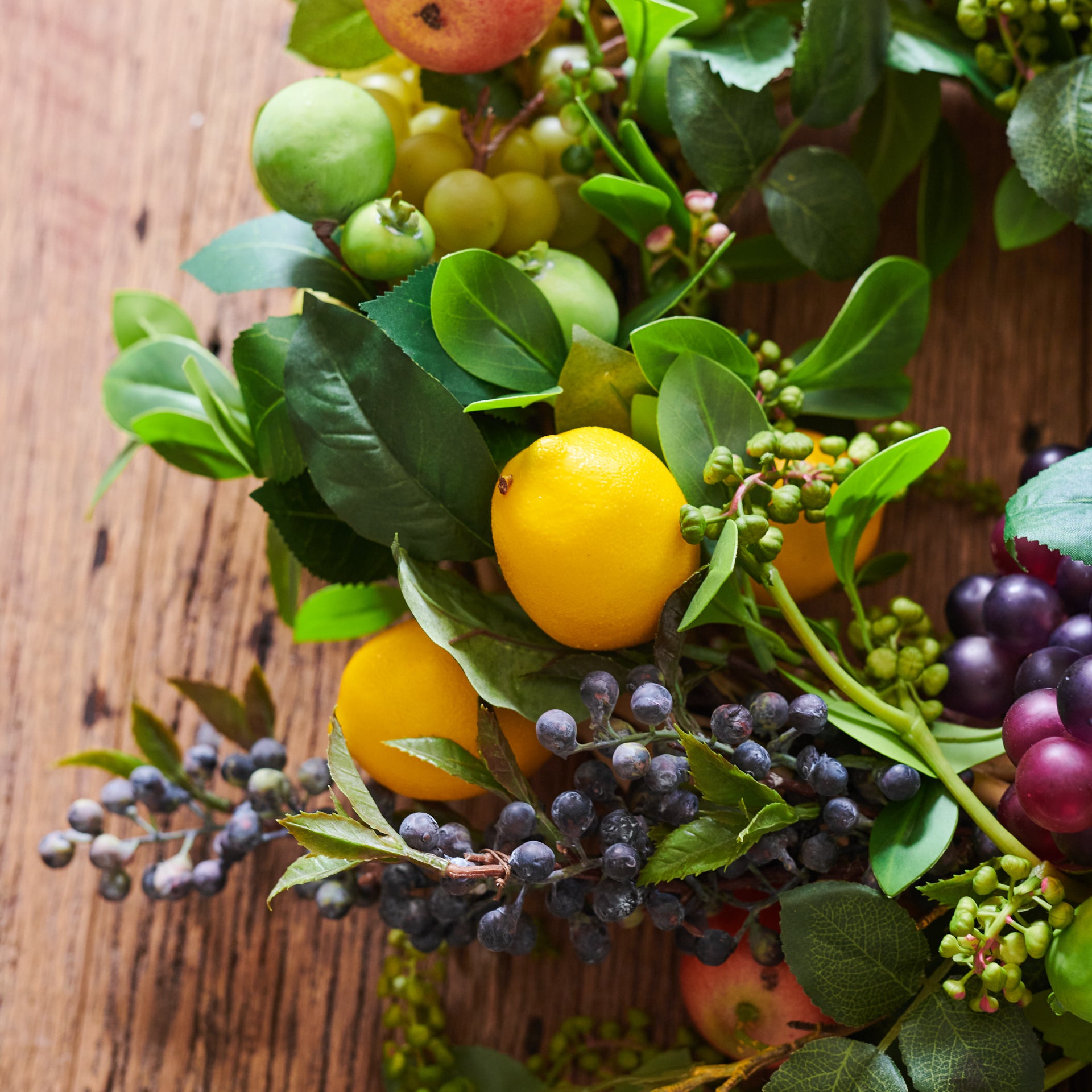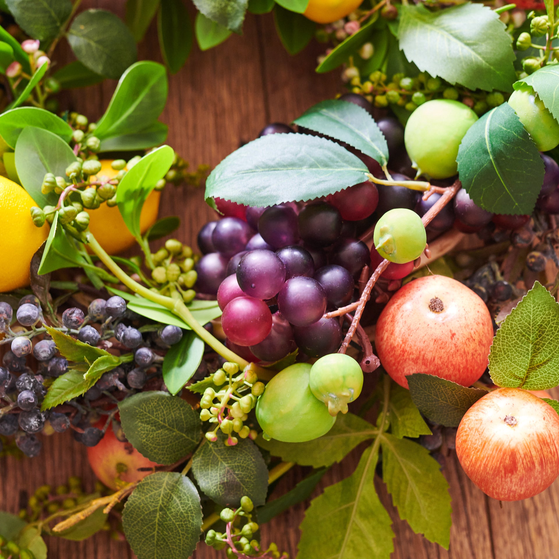Handmade Wreath for Christmas or all year round! Made with a vibrant mix of Real Touch fruits, including lemons apples and grapes with blueberries and seed.