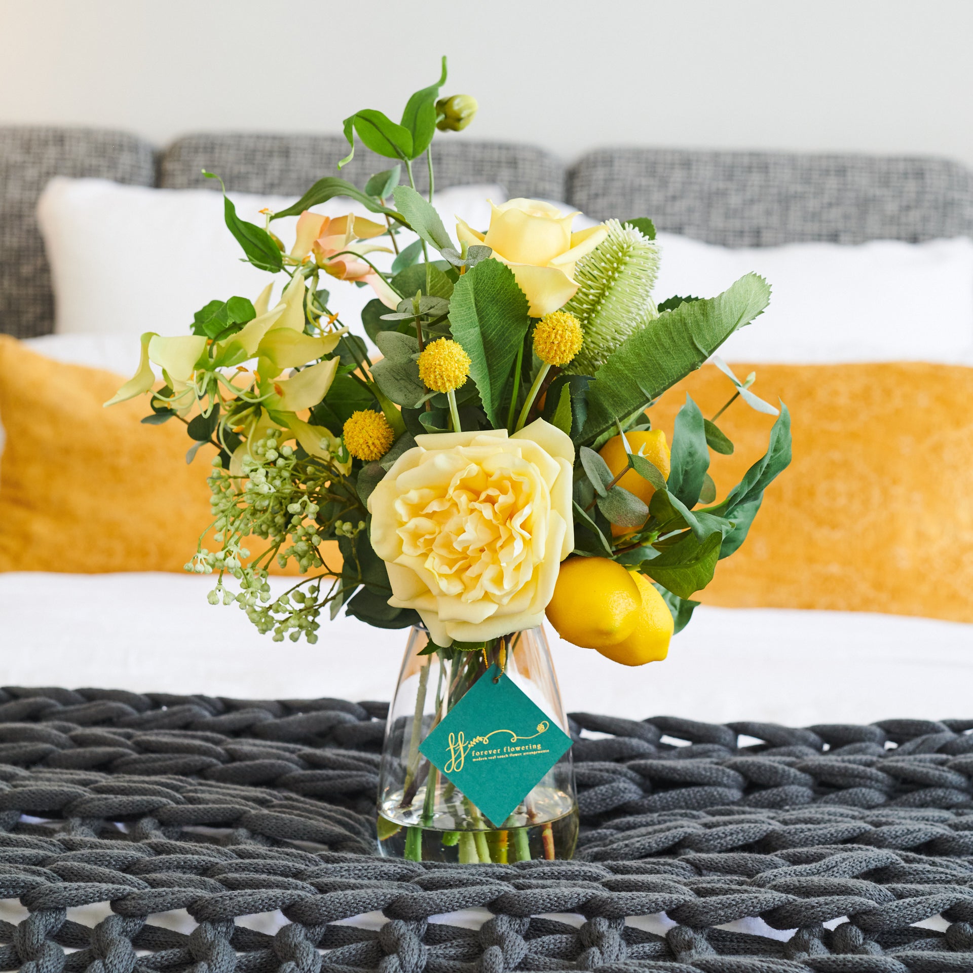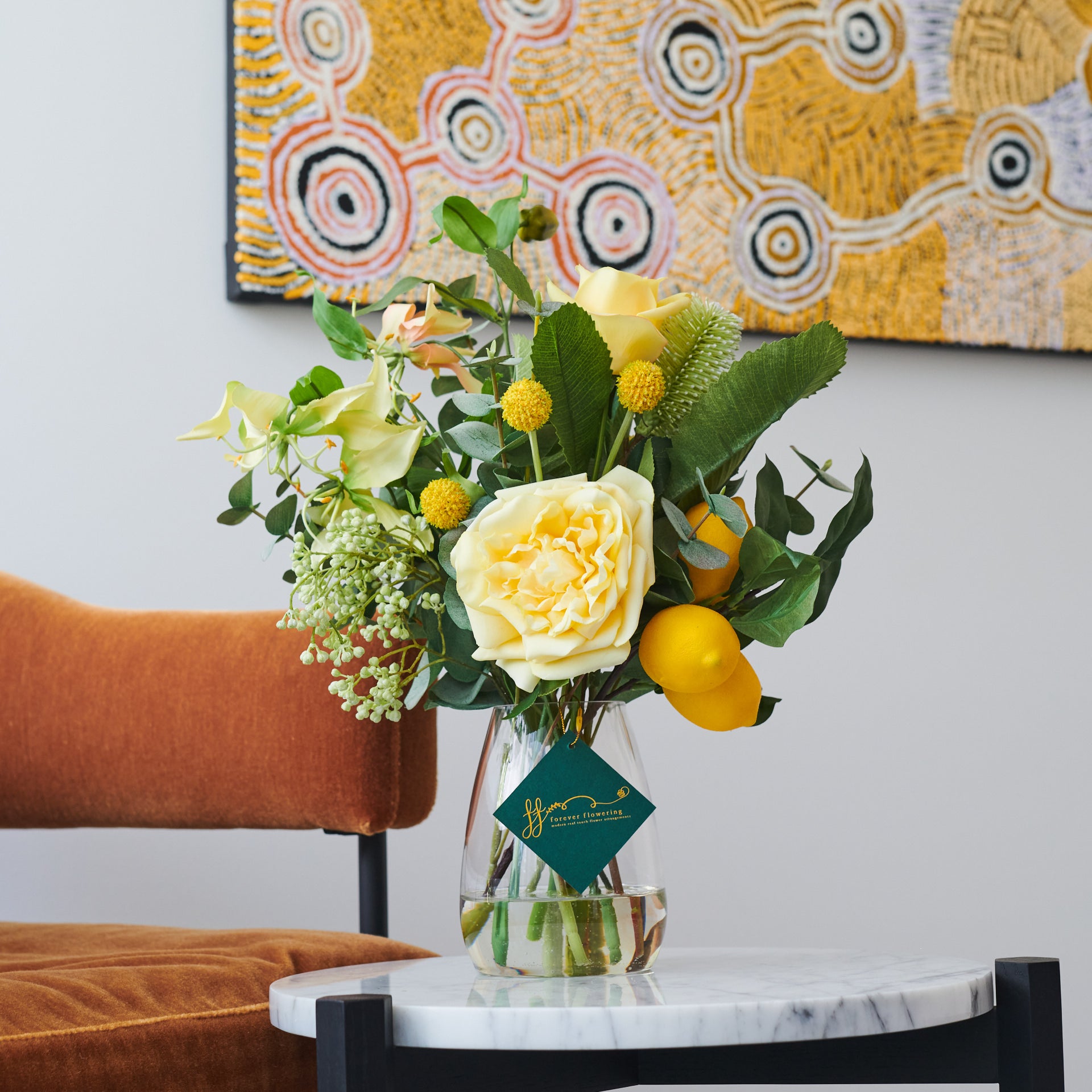 Like a delicious Limoncello, this arrangement features lemons with real touch roses, carnation and banksia with eucalyptus and seeded berry set in artificial water in a glass vase.