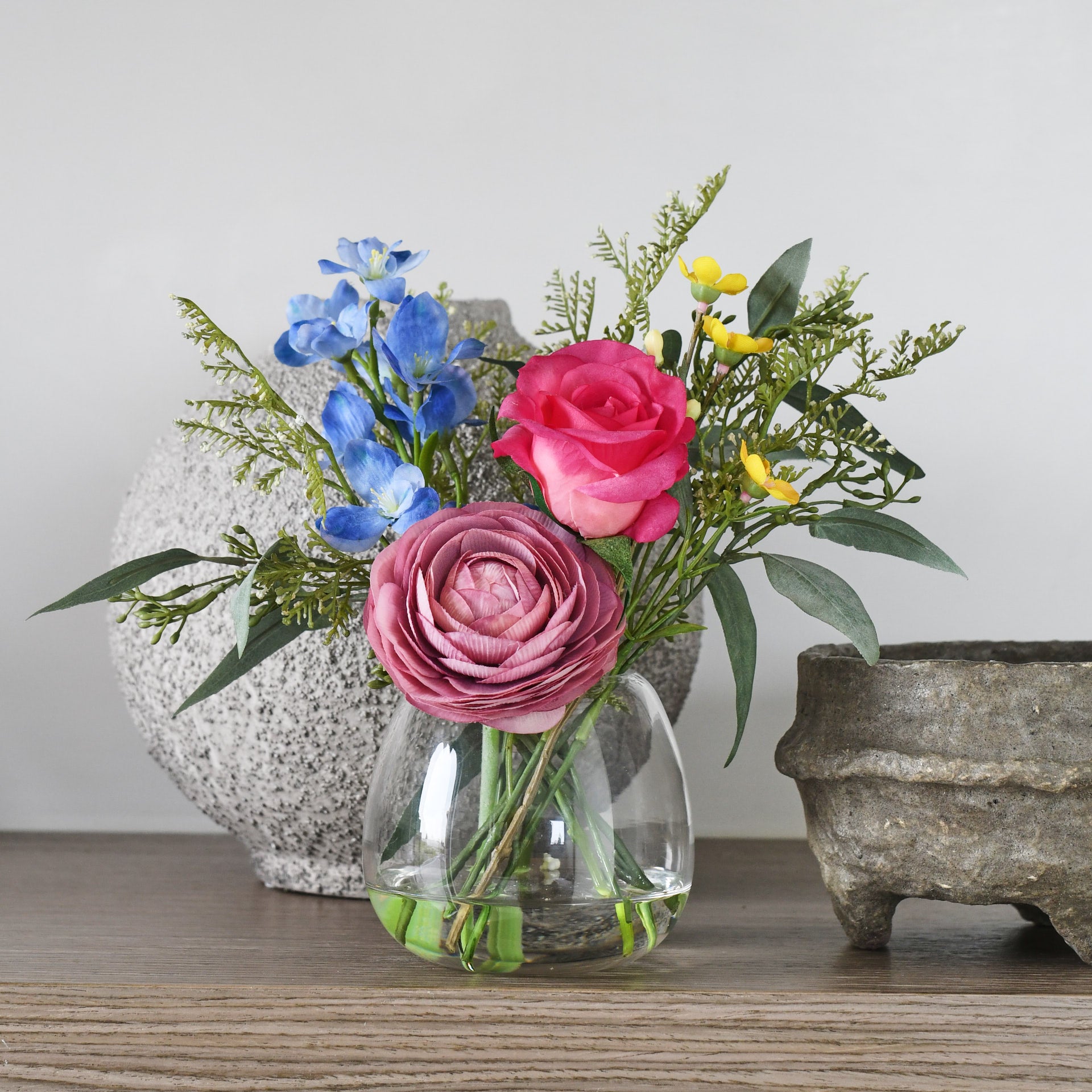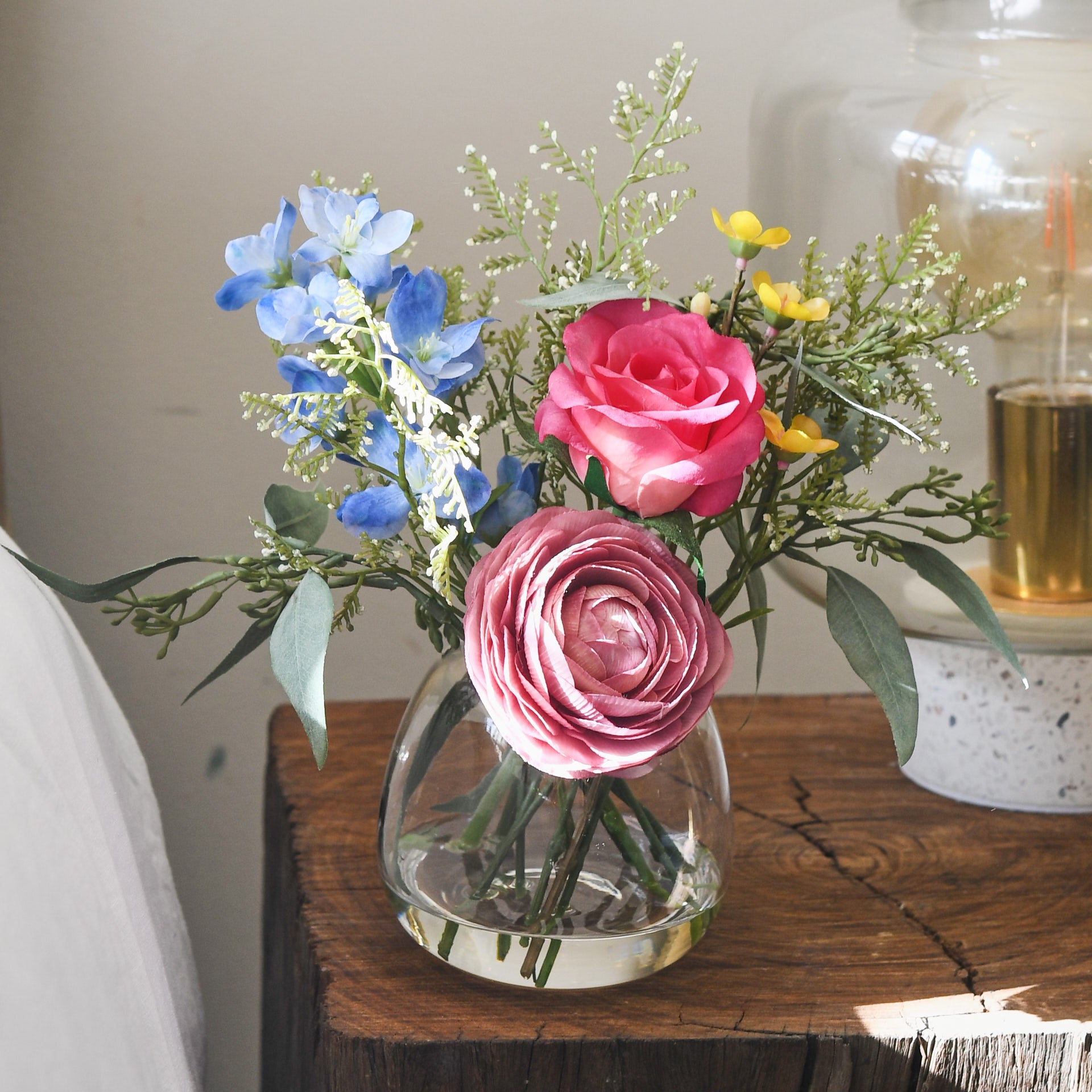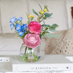 Real touch early bloom rose, ranunculus and larkspur with wax flower and seeded eucalyptus set in a glass vase in artificial water.