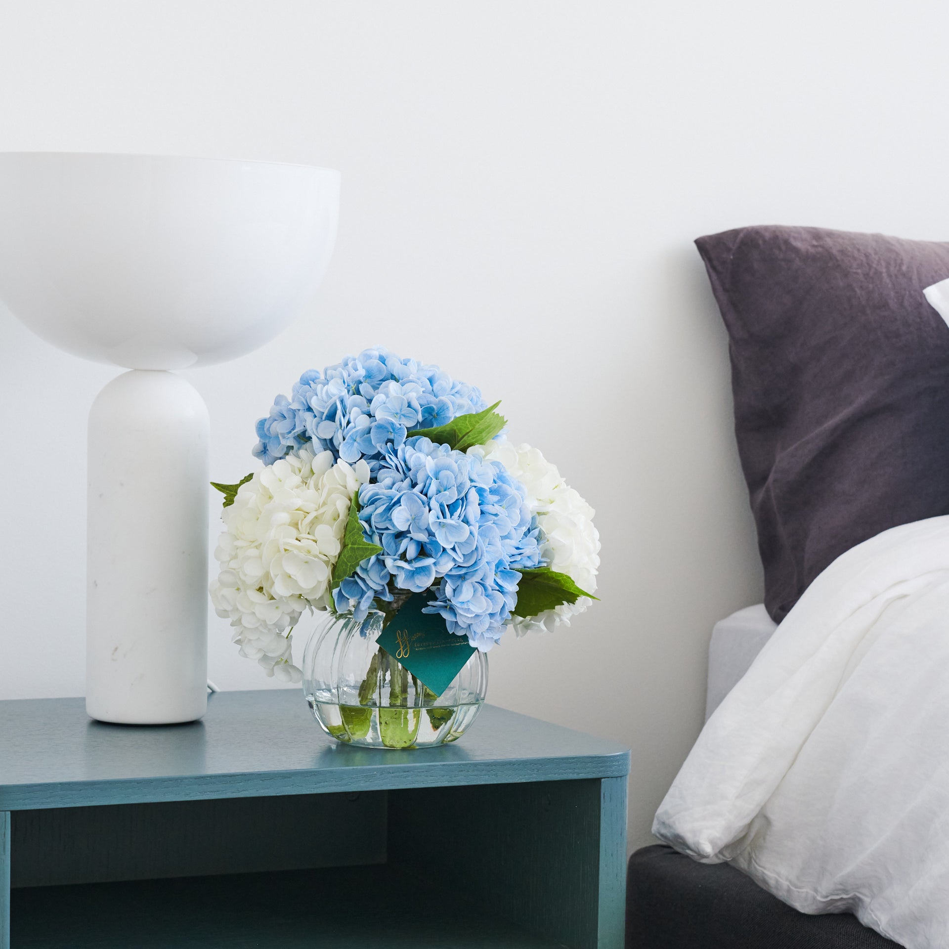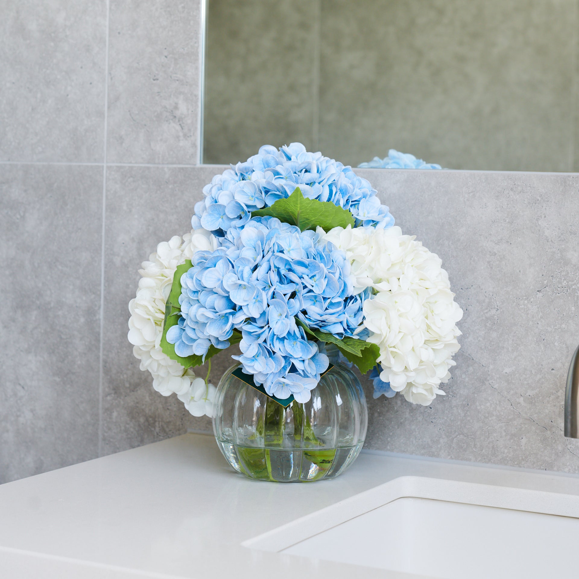Real Touch Hydrangeas in a small fishbowl vase permanently set in artificial water.