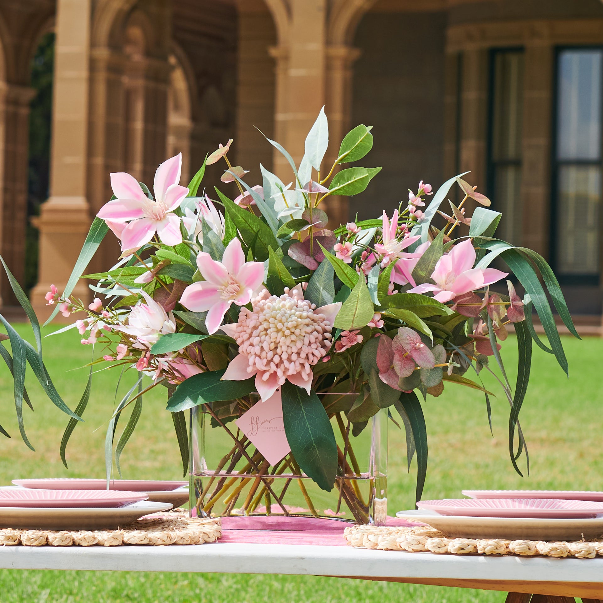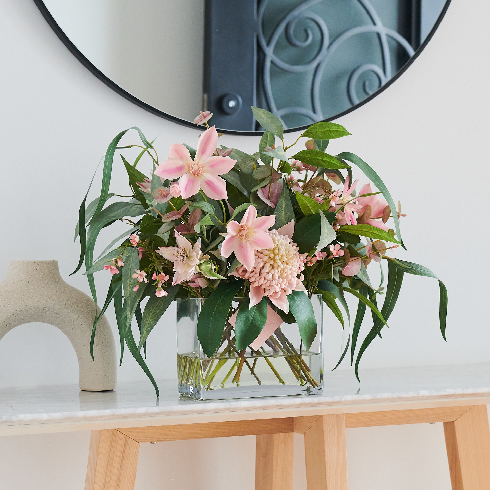 Real Touch Artificial Waratah, Clematis and Eucalyptus Leaves with Wax Flower and Blushing Bride set in Rectangle Vase with Artificial Water. 360 degree flower arrangement