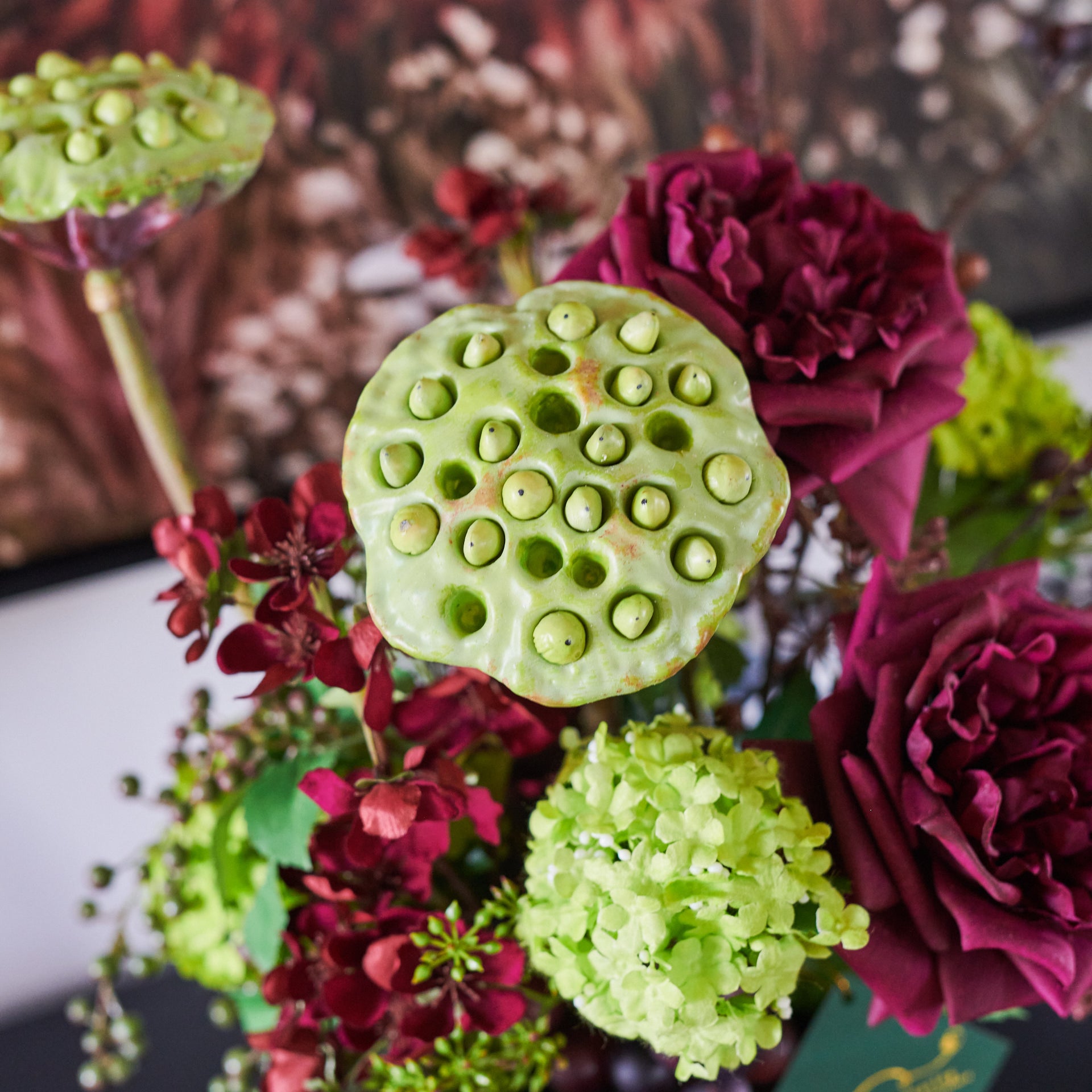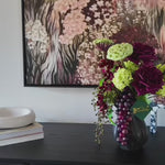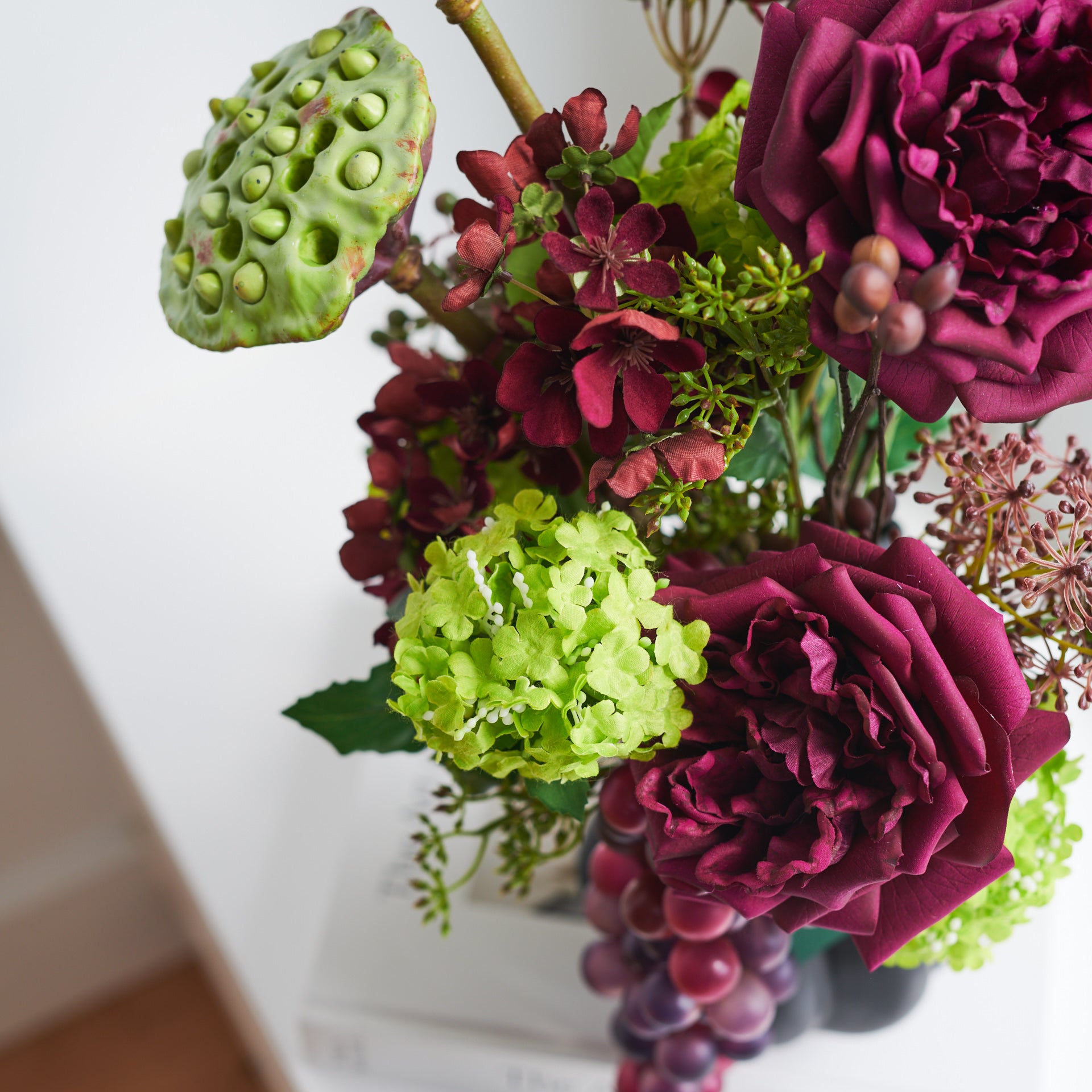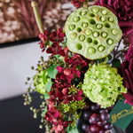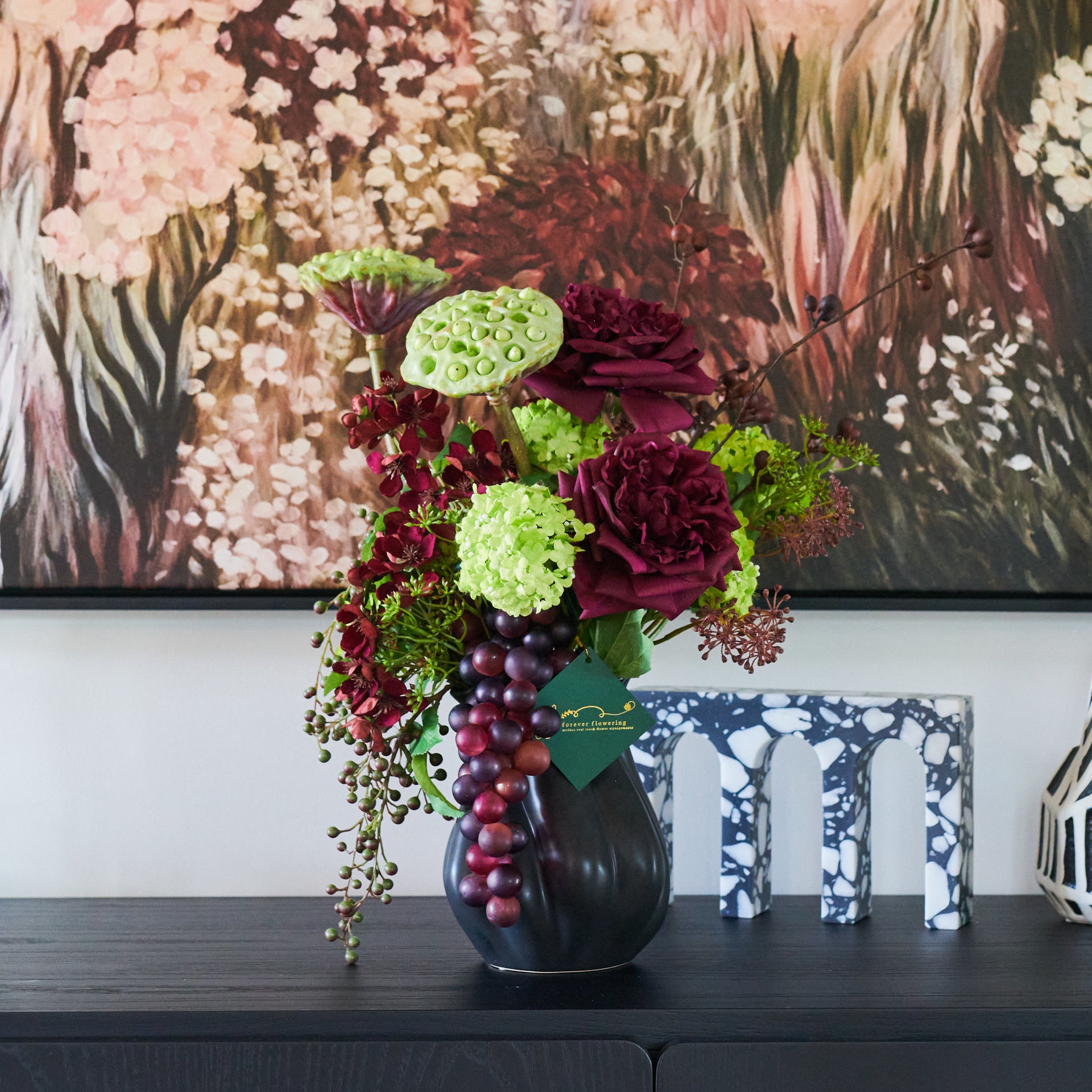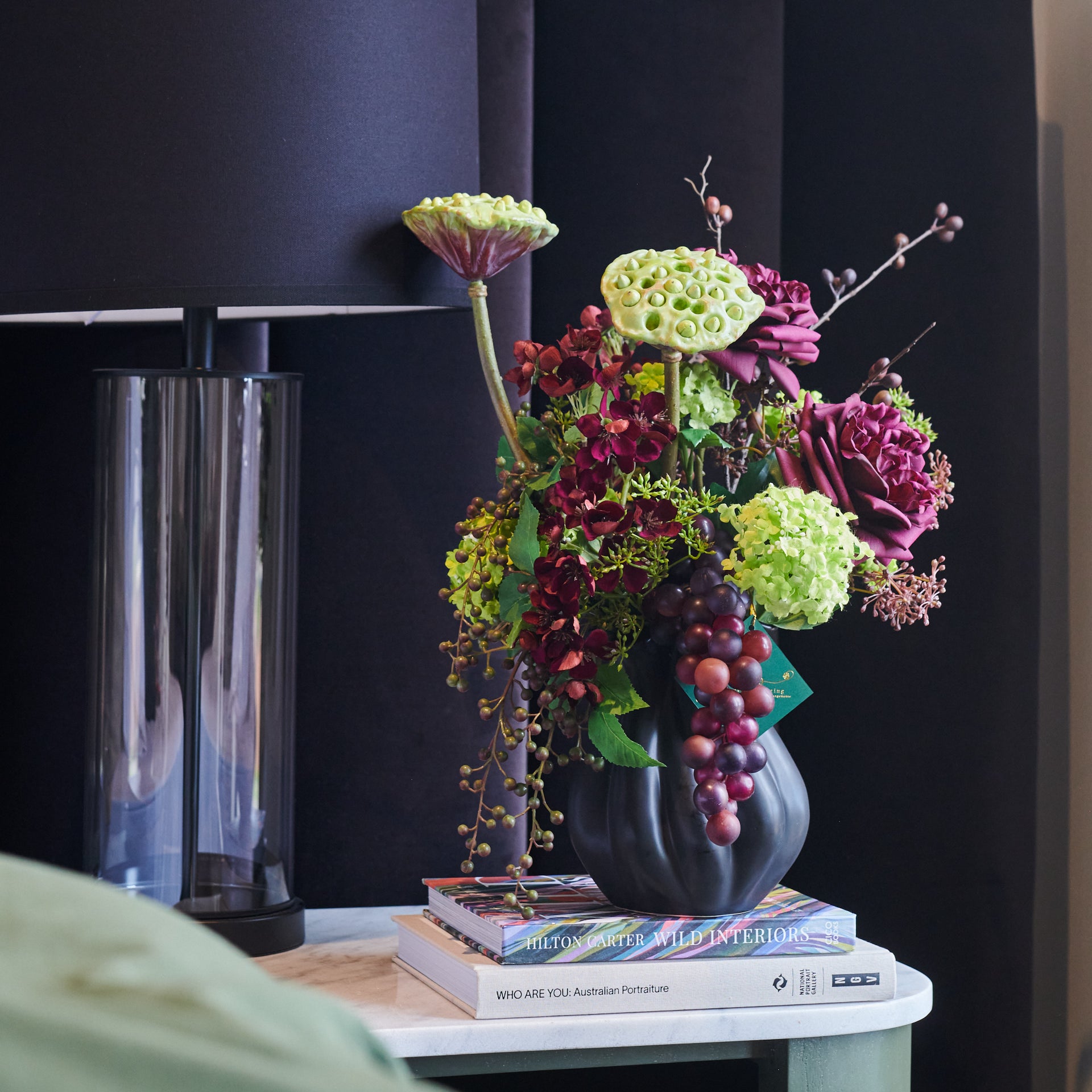 A deep and moody arrangement of Lotus, Snowball and Austin Roses with Begonia, Seed and Grapes set in Black Ceramic Vase in Artificial Water