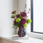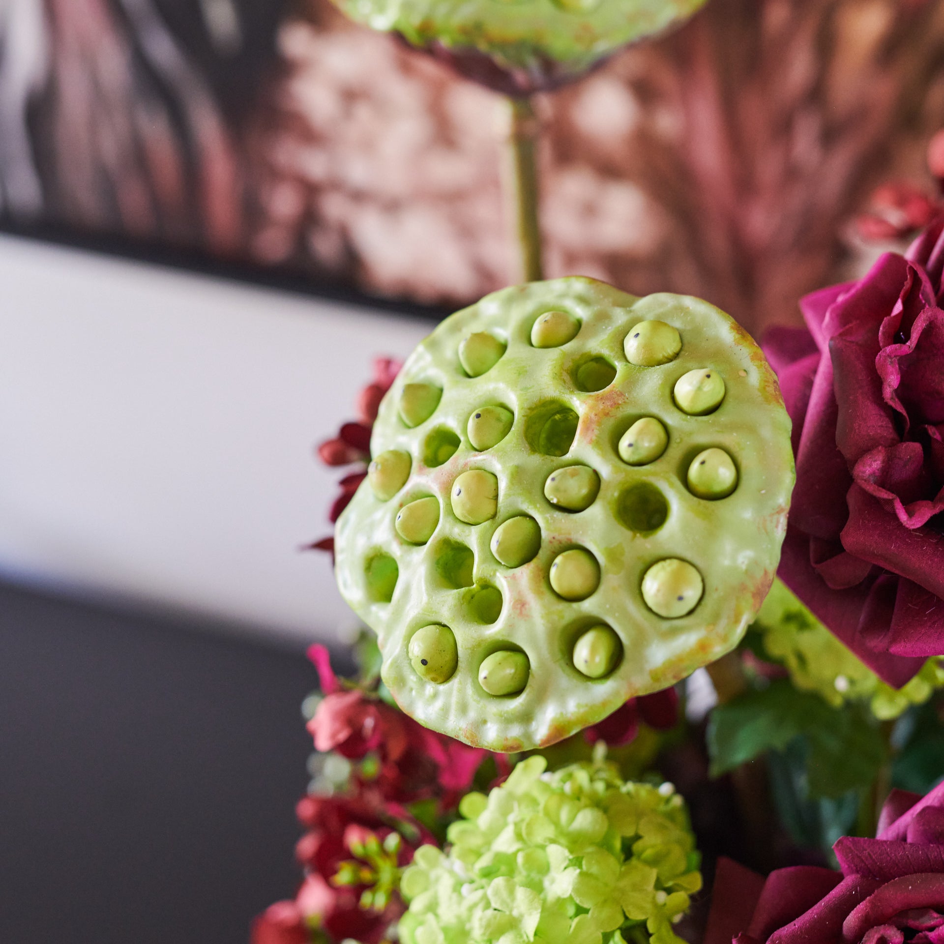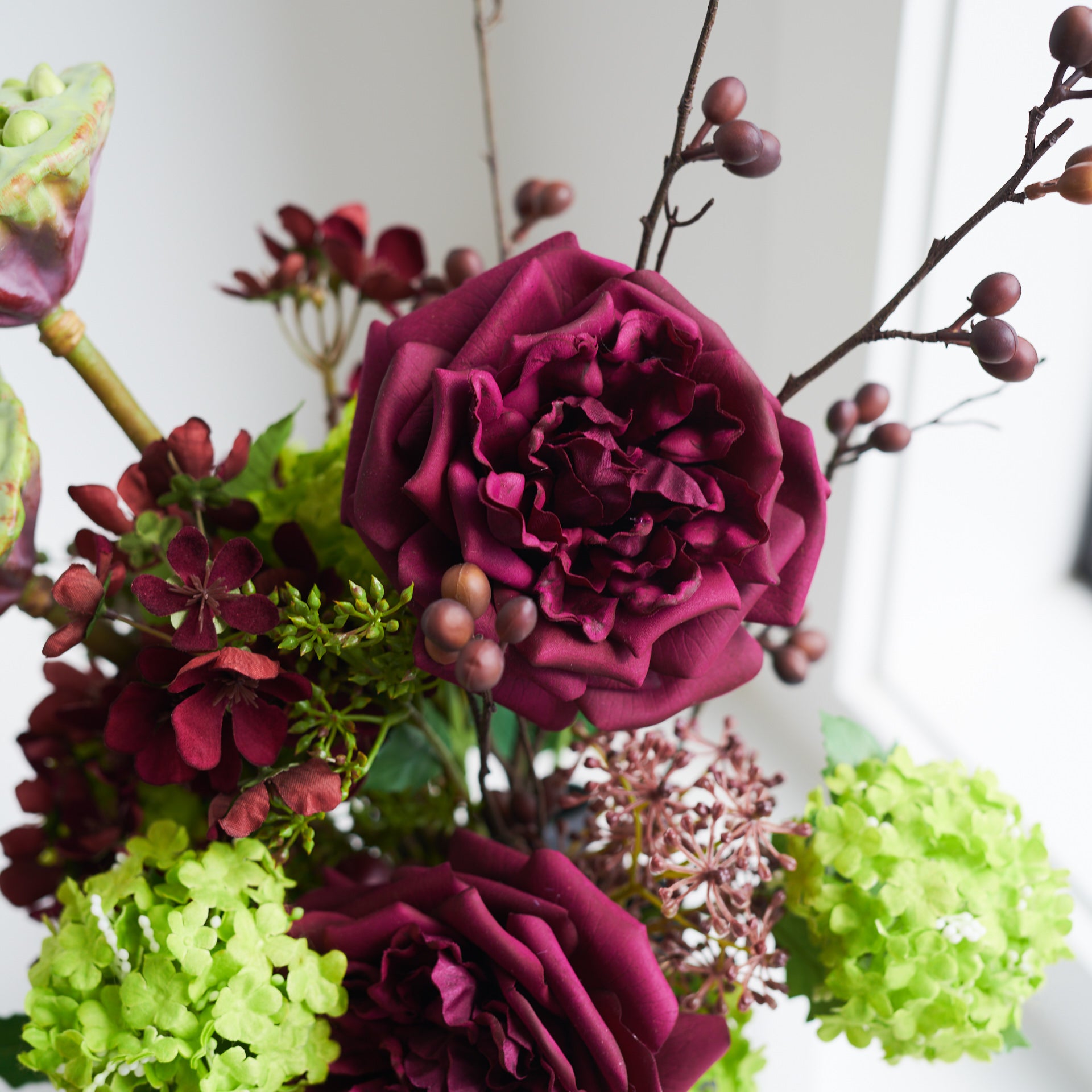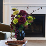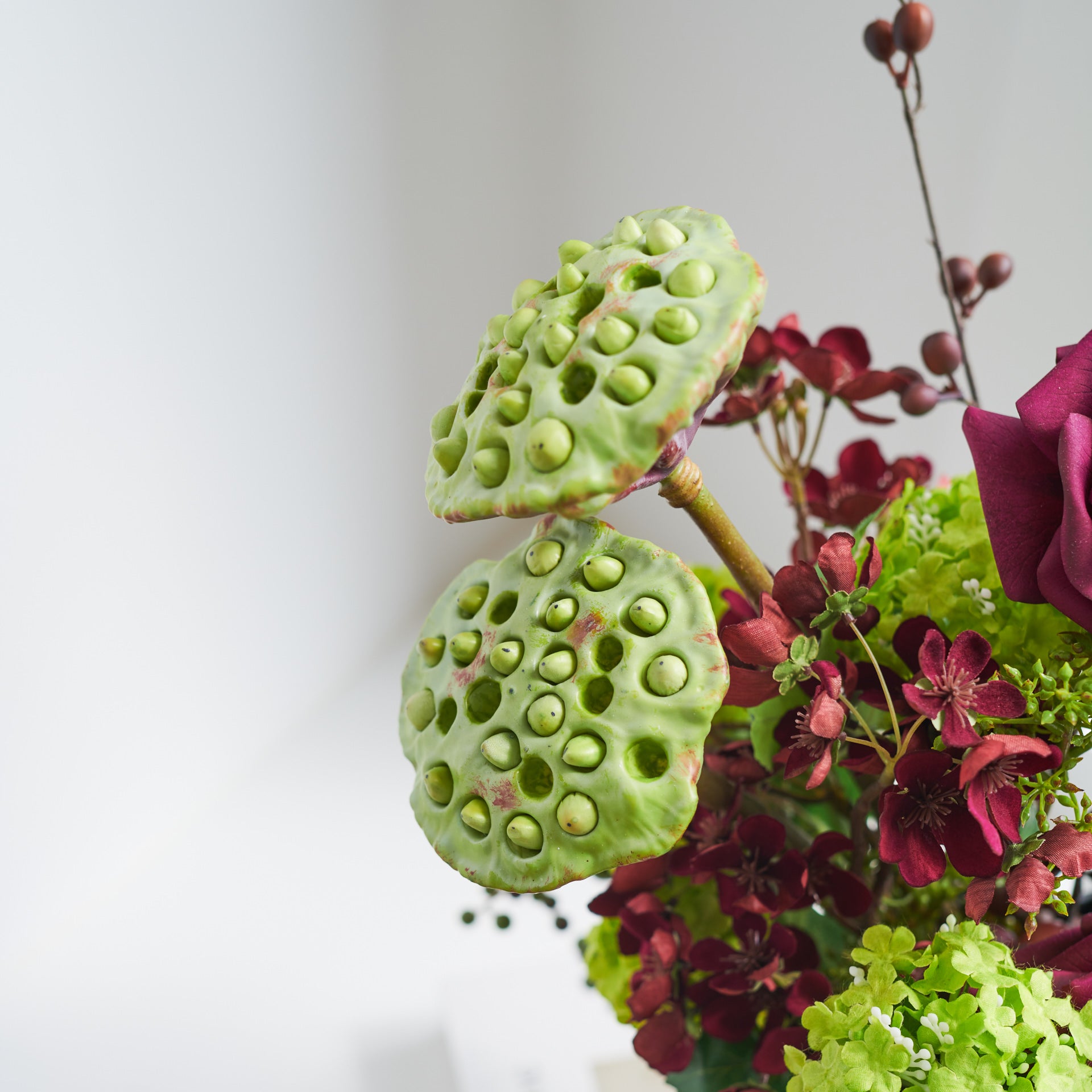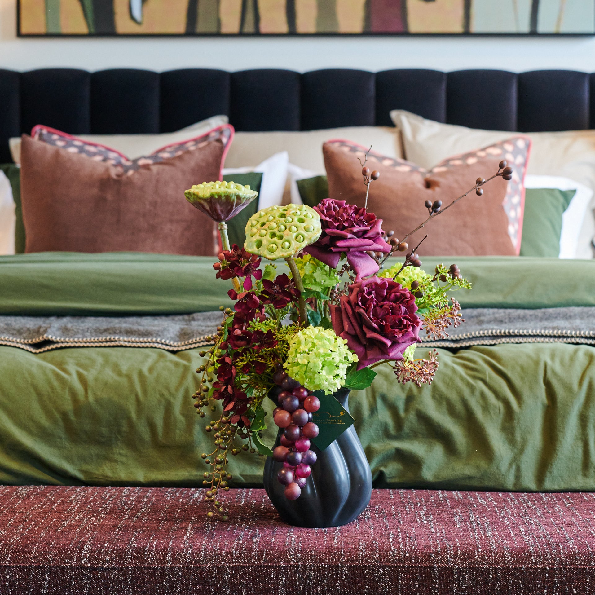 A deep and moody arrangement of Lotus, Snowball and Austin Roses with Begonia, Seed and Grapes set in Black Ceramic Vase in Artificial Water
