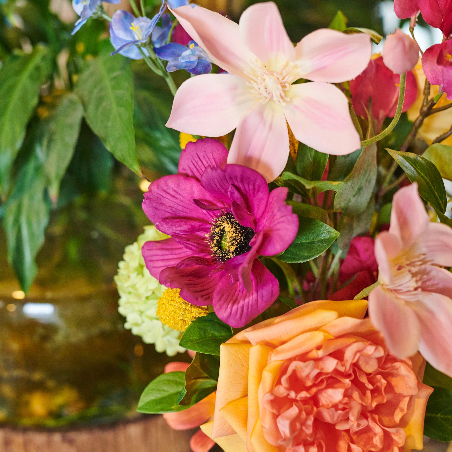 A colourful arrangement including Real Touch Clematis, Austin Rose and Snowball with Billy Buttons, Larkspur, Carnation, Enki Leaf and Bougainvillea set in a Glass Vase in Artificial Water