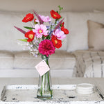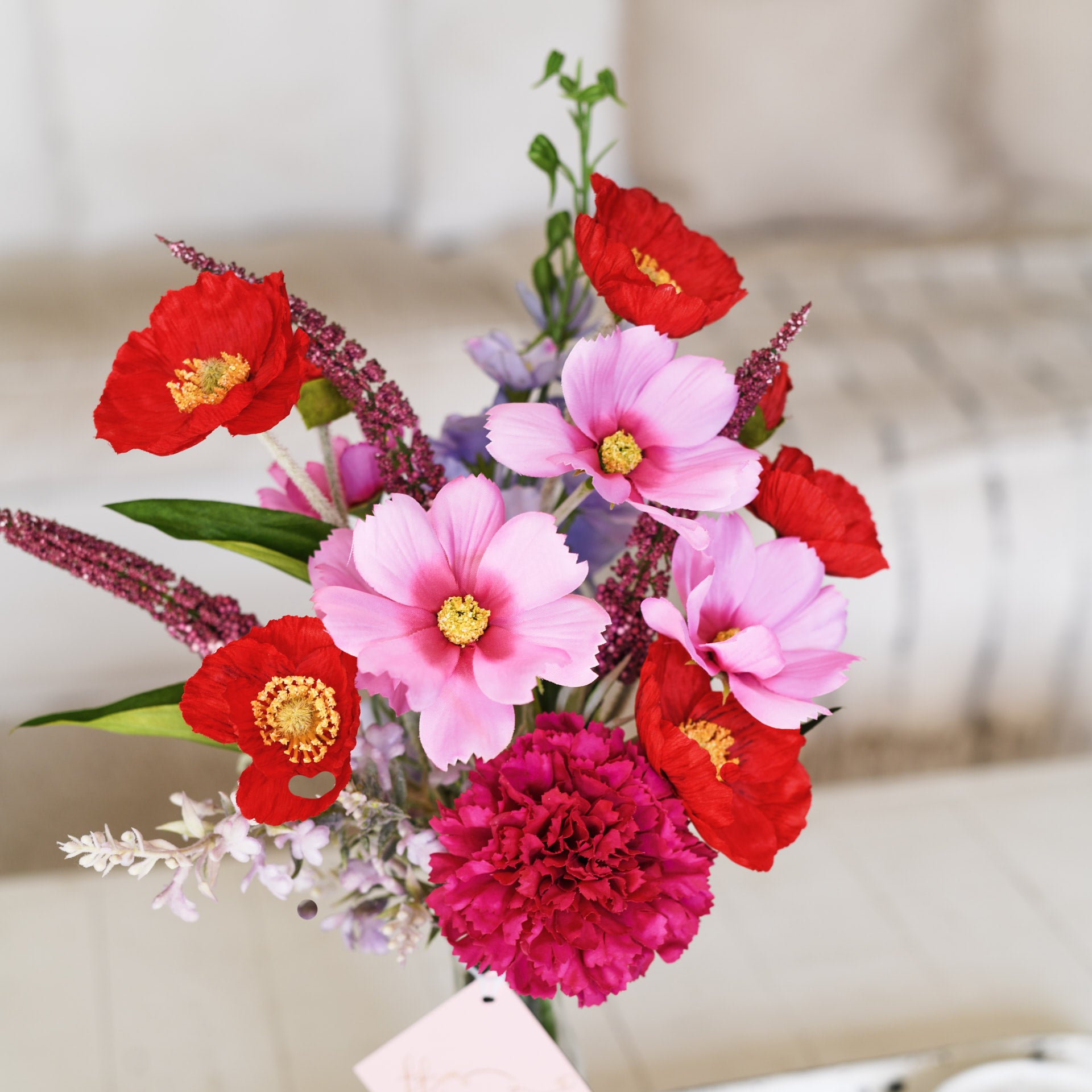 A colourful mix of pink cosmo and rich red poppy with carnation and delphinium.