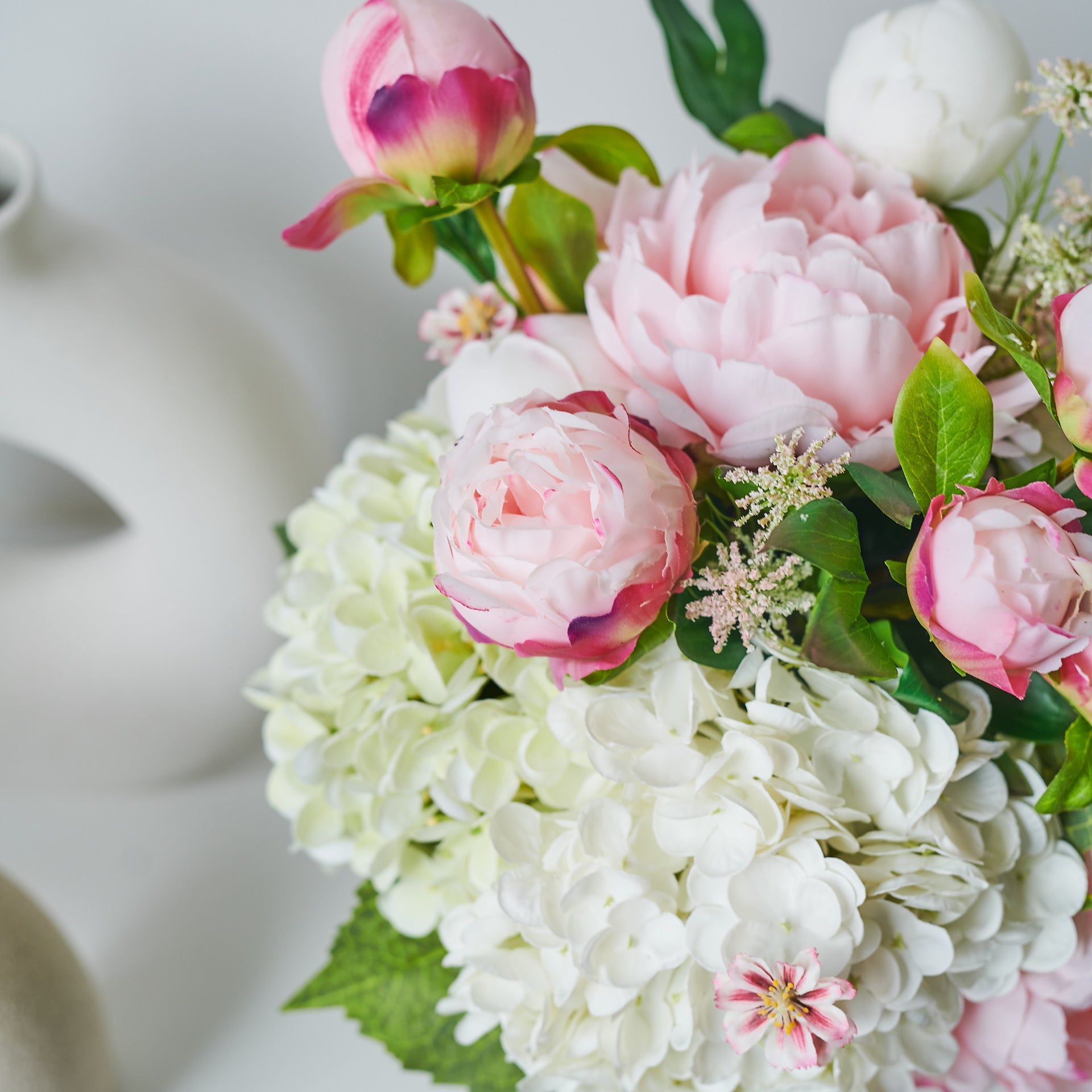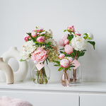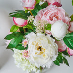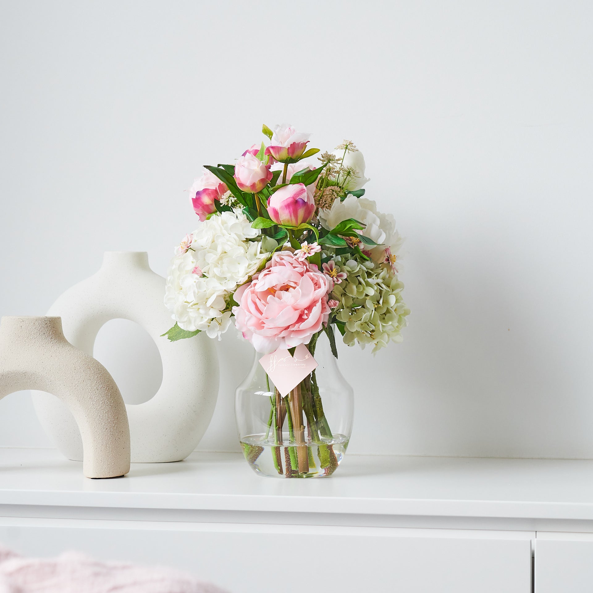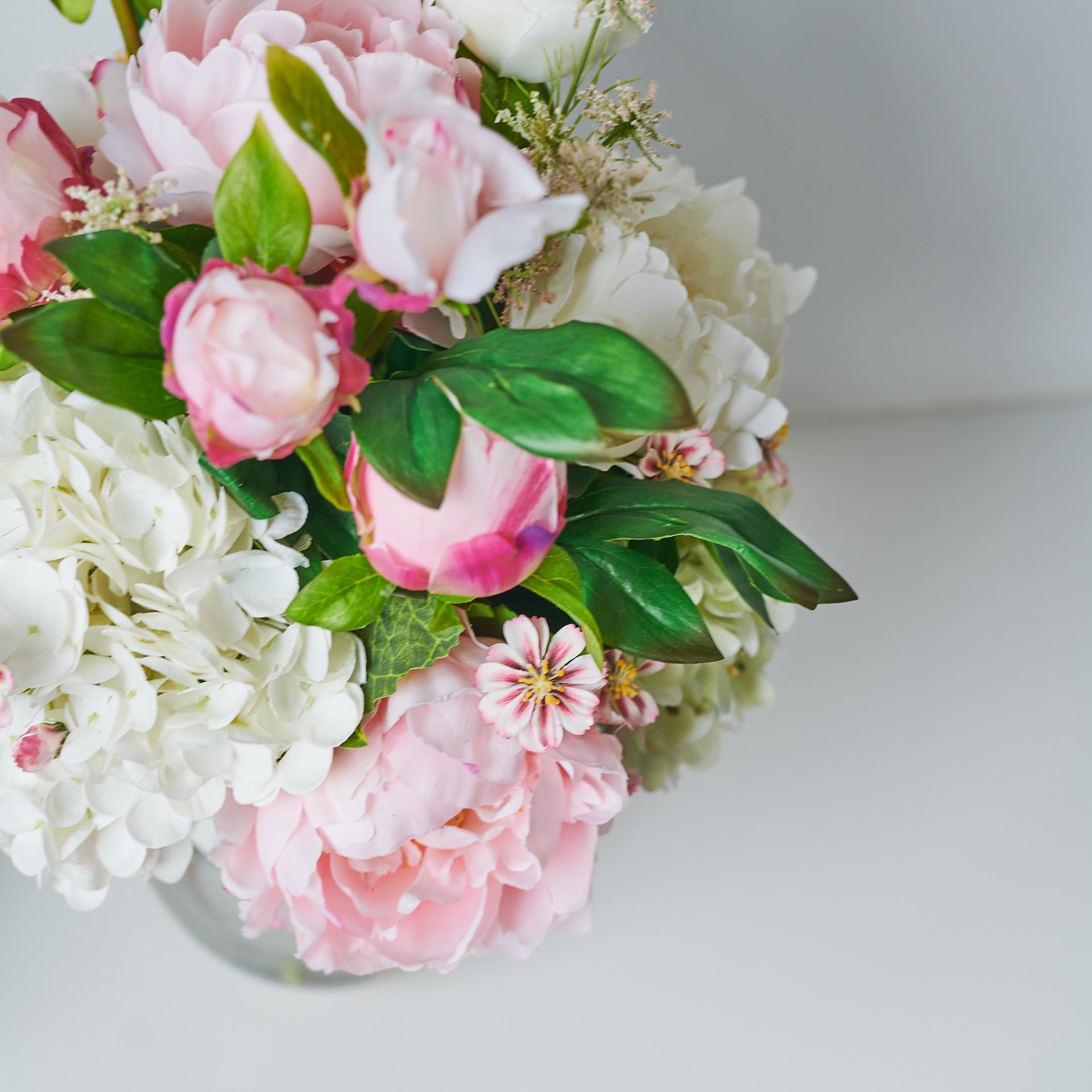 Nancy : An abundant mix of Peony Roses and Hydrangea, accented with delicate Queen Annes Lace and Mini Cosmo set in Glass Vase in Artificial Water.