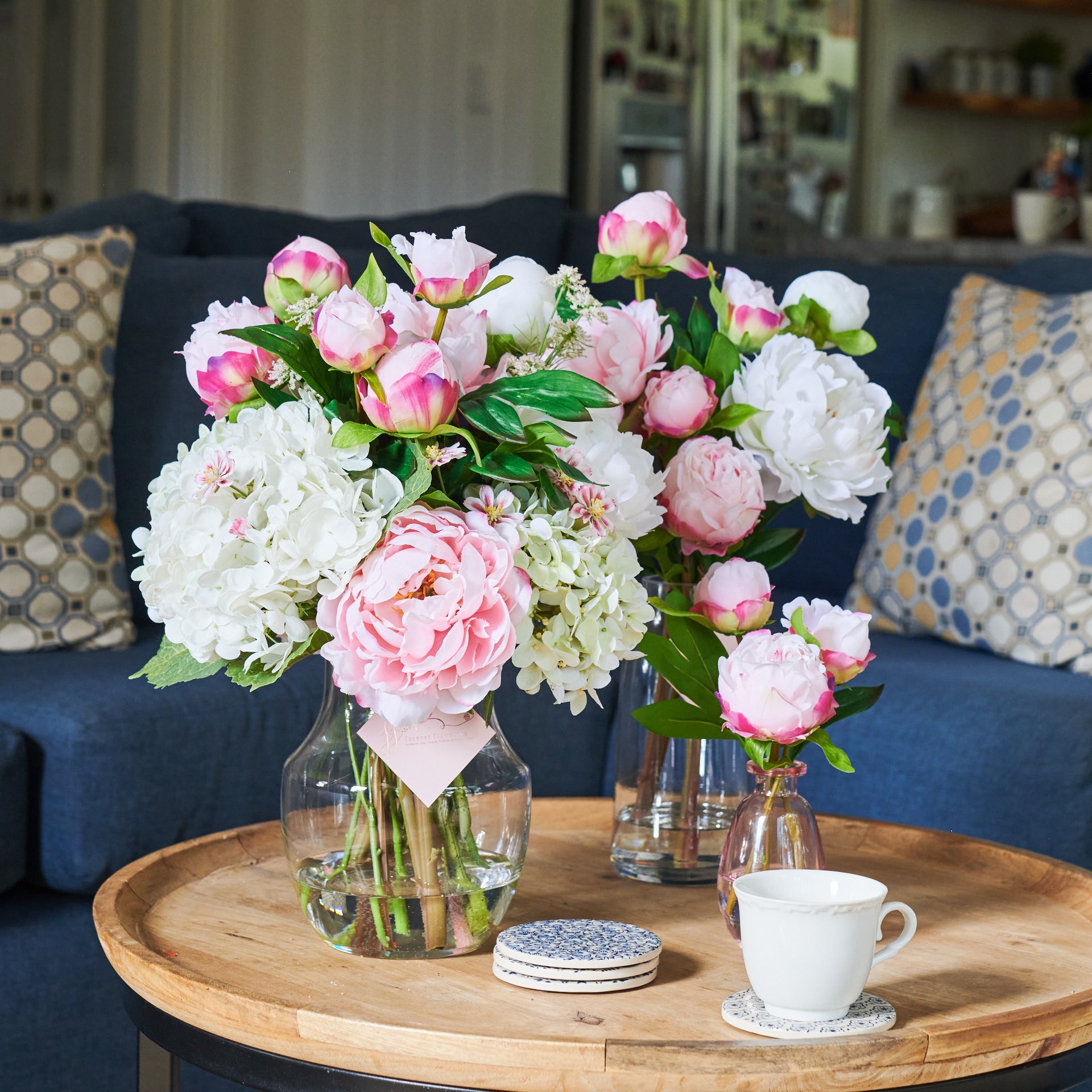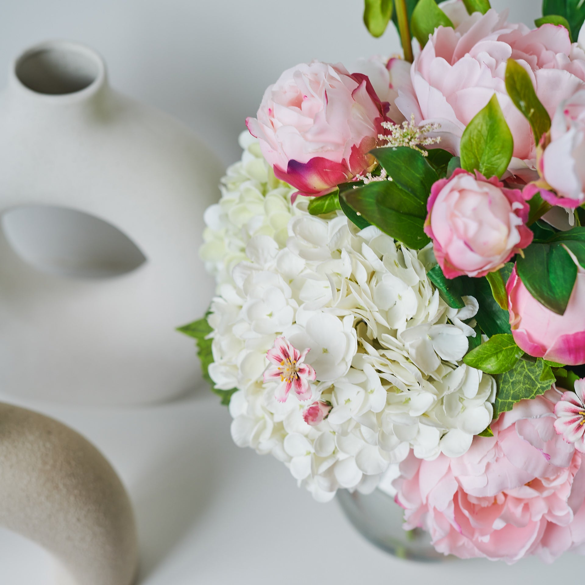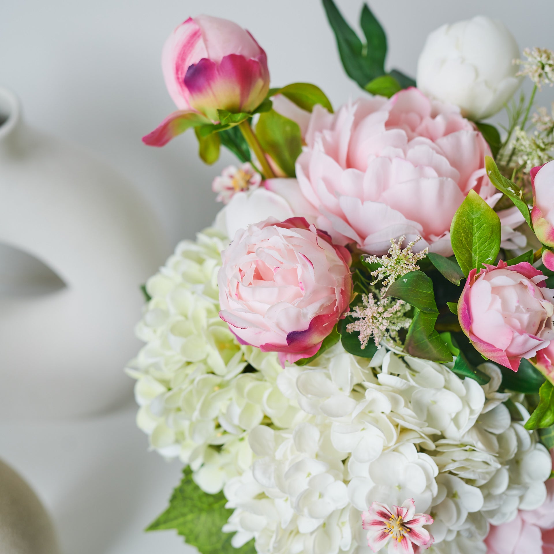 Nancy : An abundant mix of Peony Roses and Hydrangea, accented with delicate Queen Annes Lace and Mini Cosmo set in Glass Vase in Artificial Water.