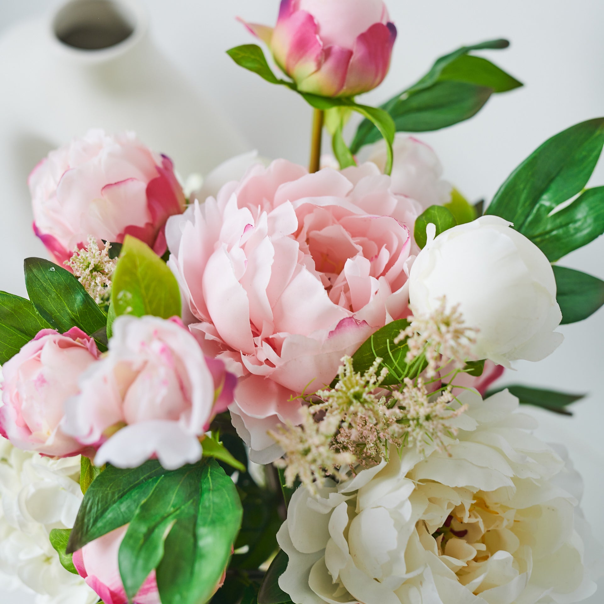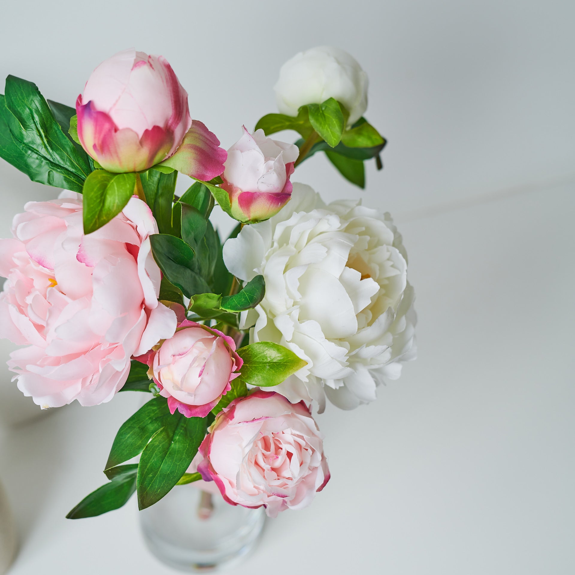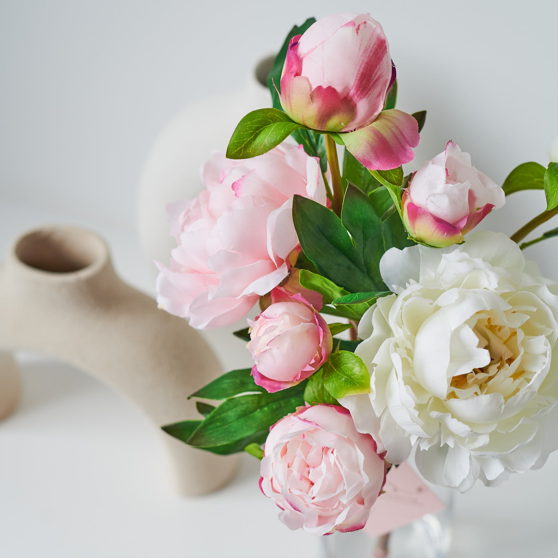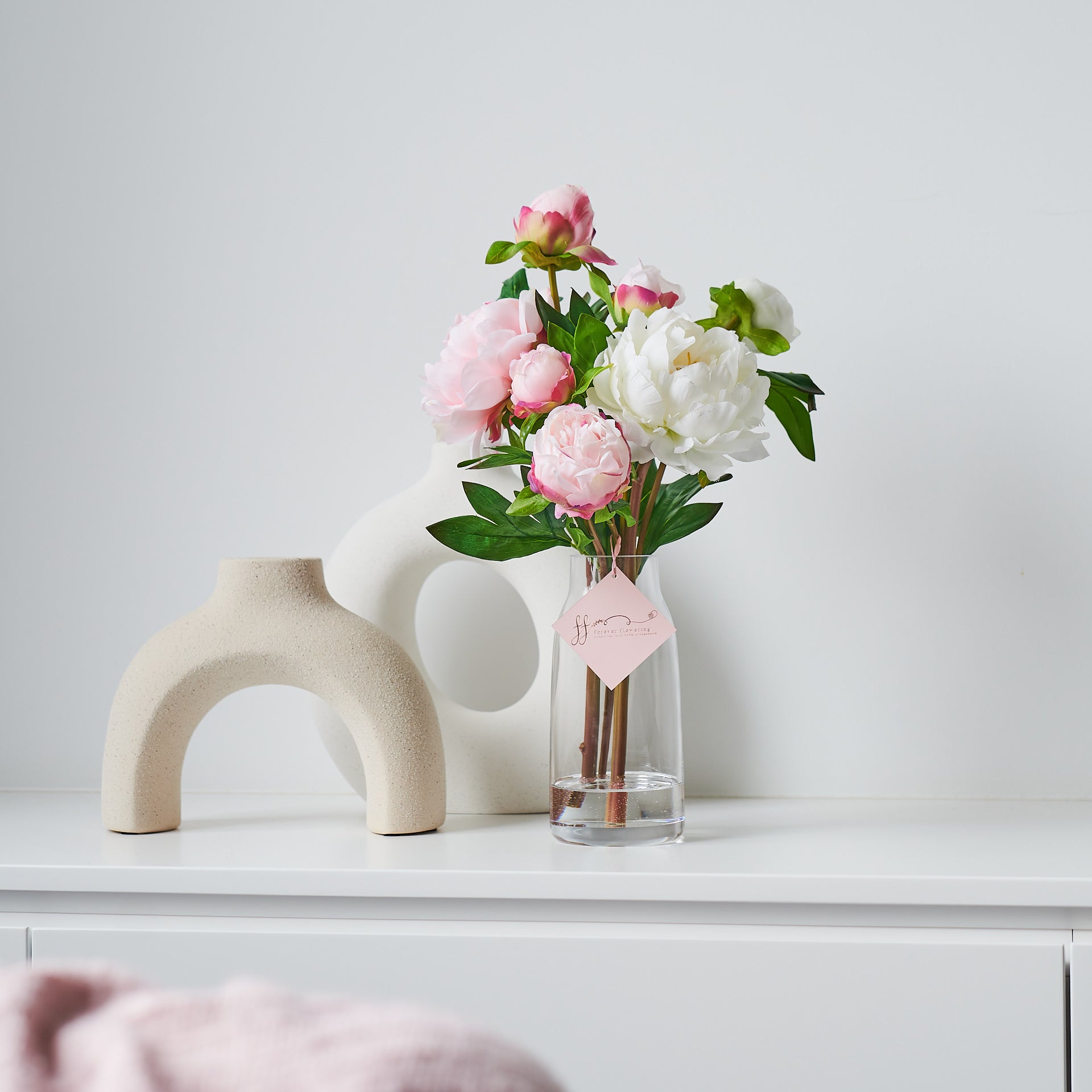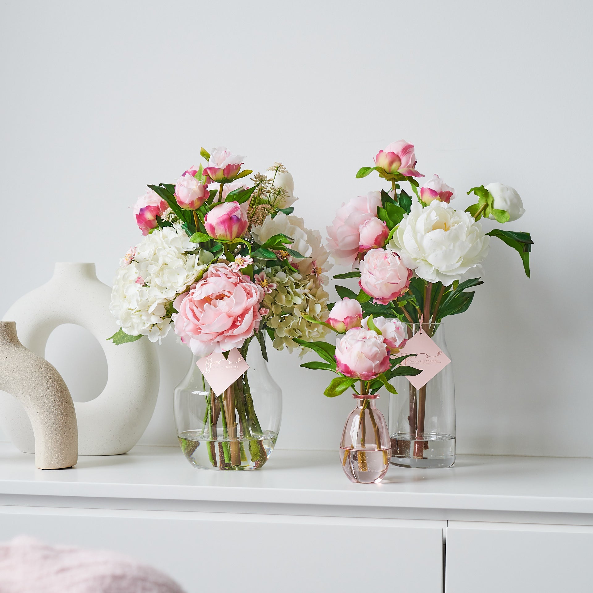 Faye : A beautiful bunch of Pink and White Peony Roses set in a Glass Vase in Artificial Water.