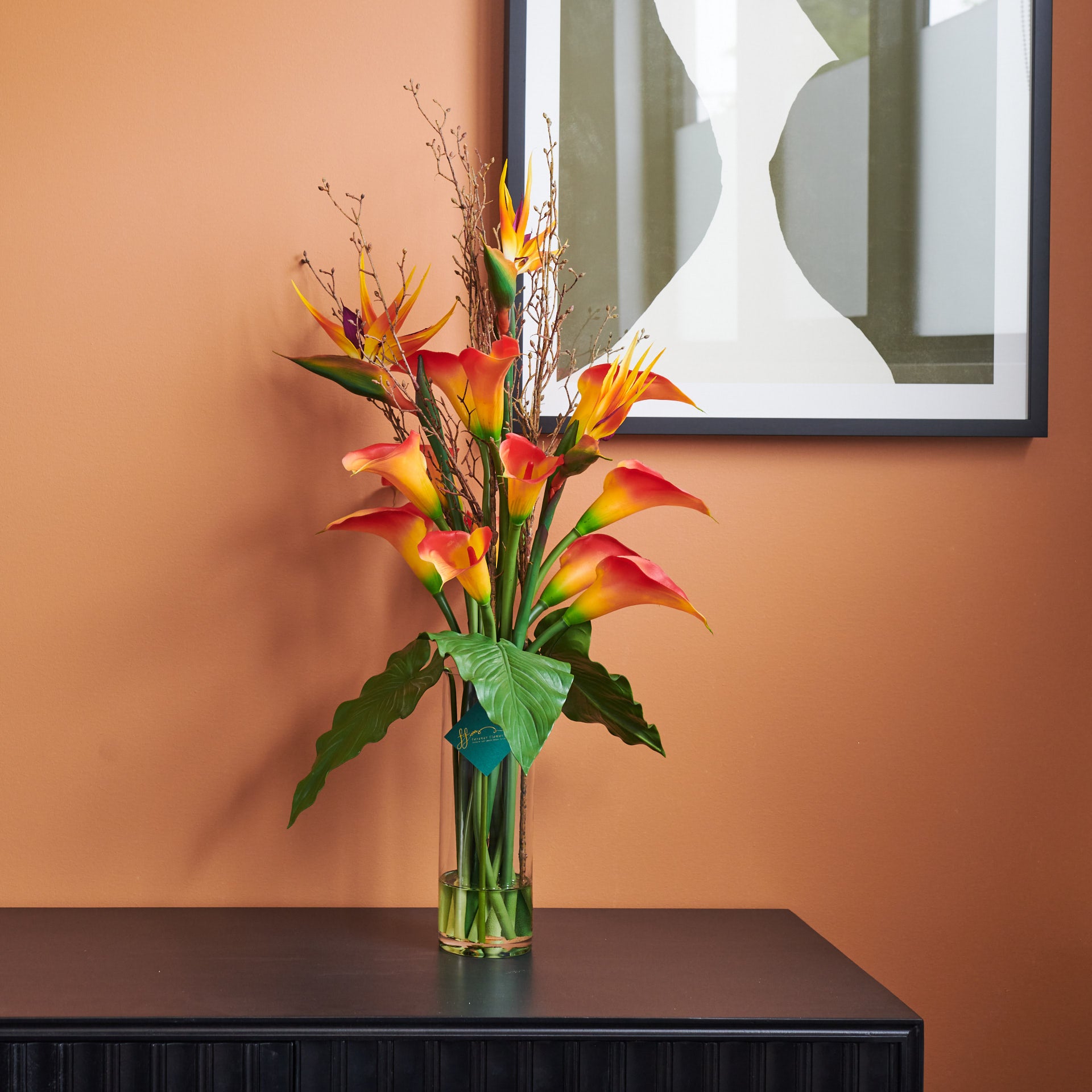 Mix of Real Touch Calla Lilies, Birds of Paradise flowers, Twig Branches and Calla Leaves in a cylinder vase permanently set in an artificial water.