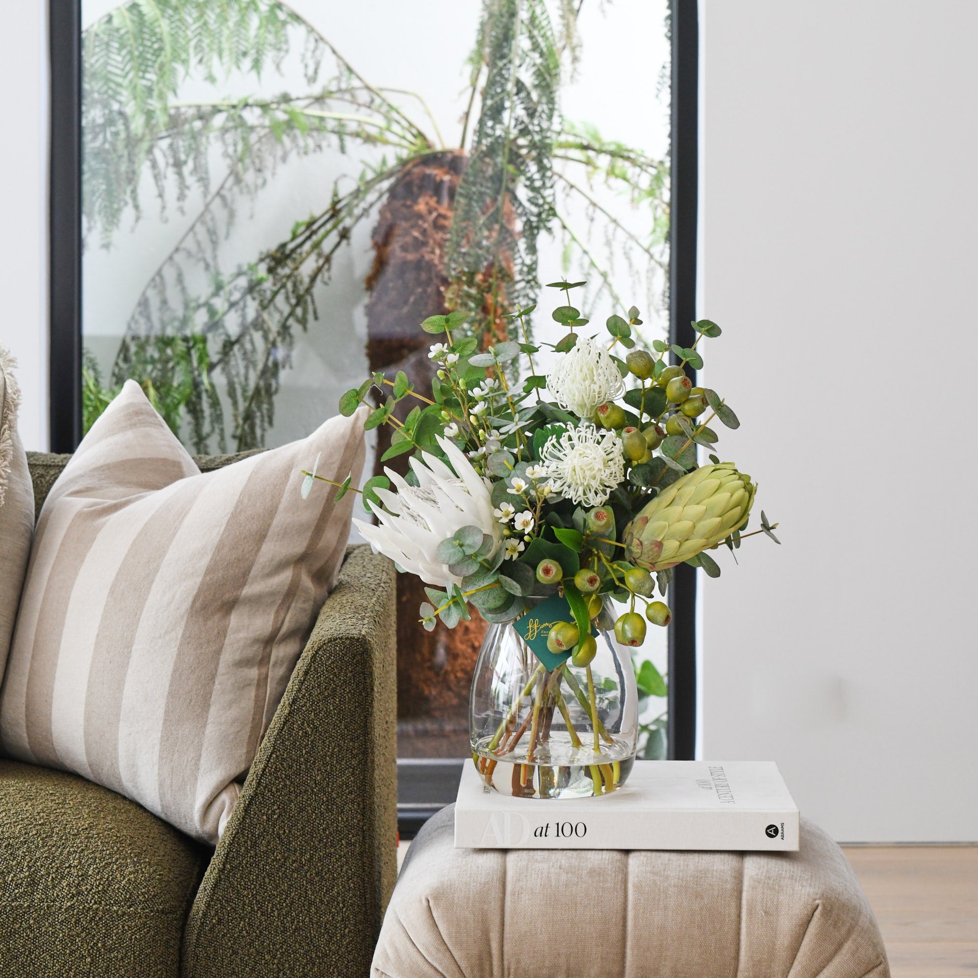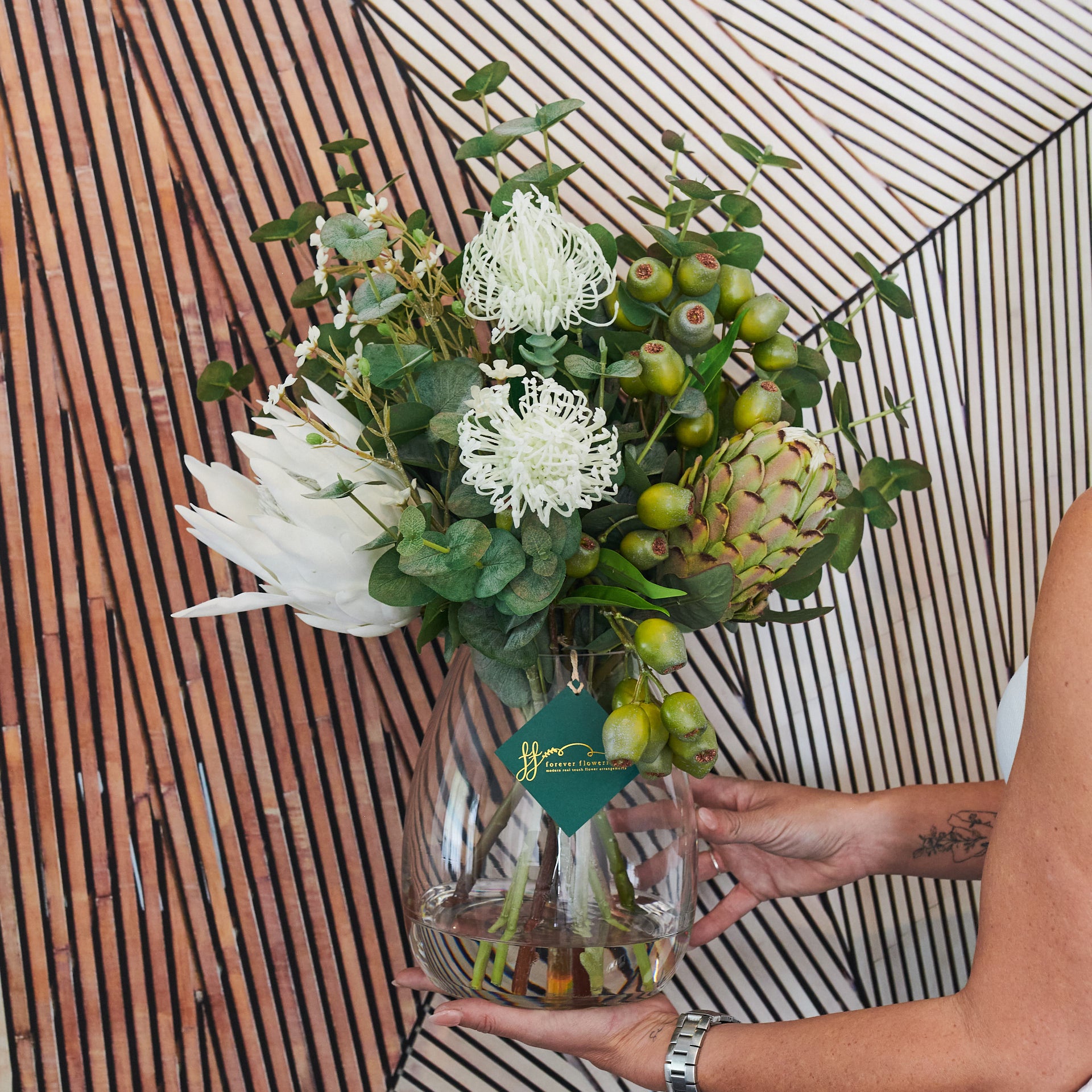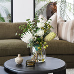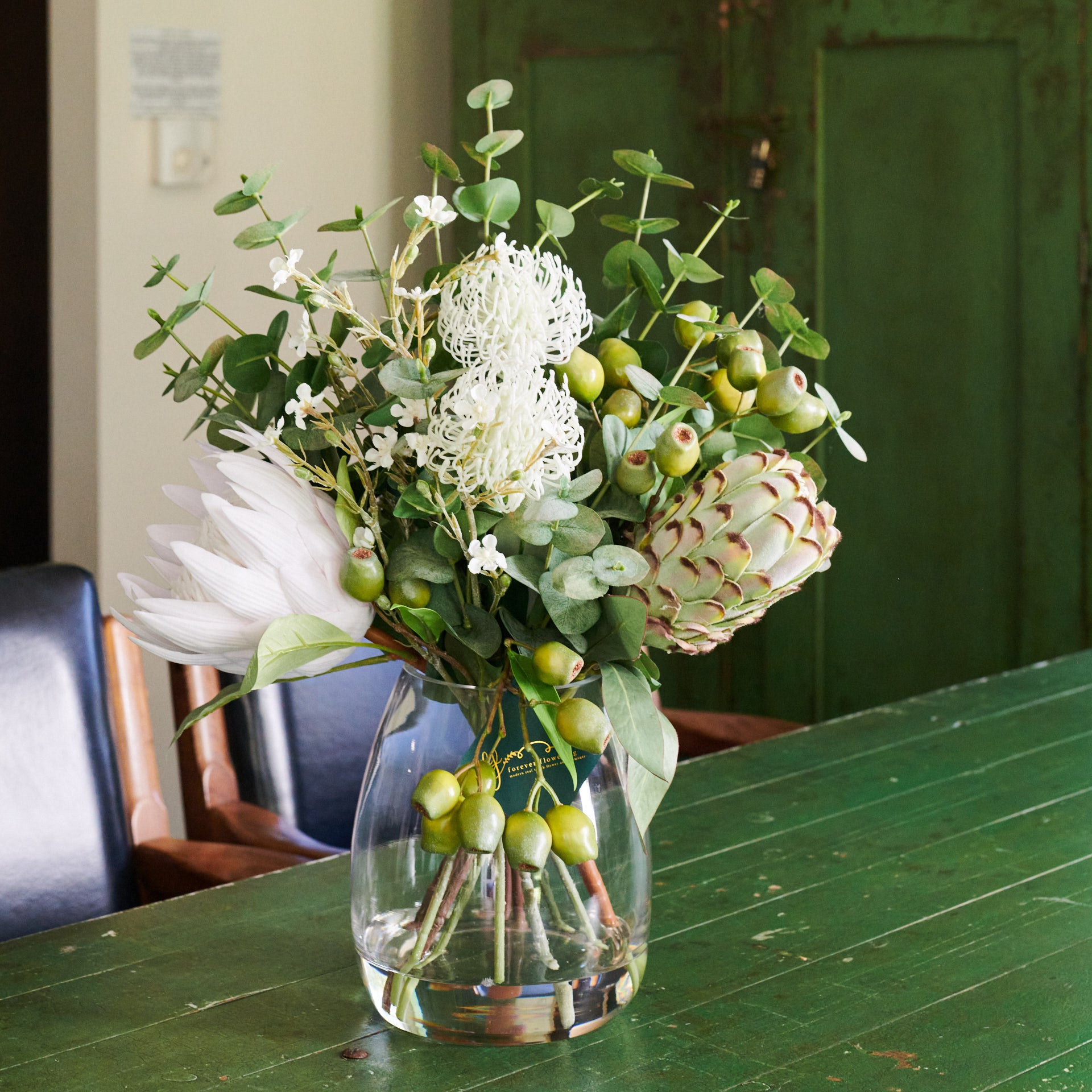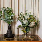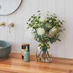 Real Touch Proteas, Gum Nuts, Eucalyptus Leaves, Leucosperum and Flower spray in belly vase set in artificial water.