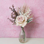 Real touch Rose, Reed Grass, Wattle and Mini Eucalyptus Gum in vintage glass bottle and Artificial Water.
