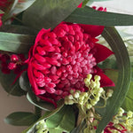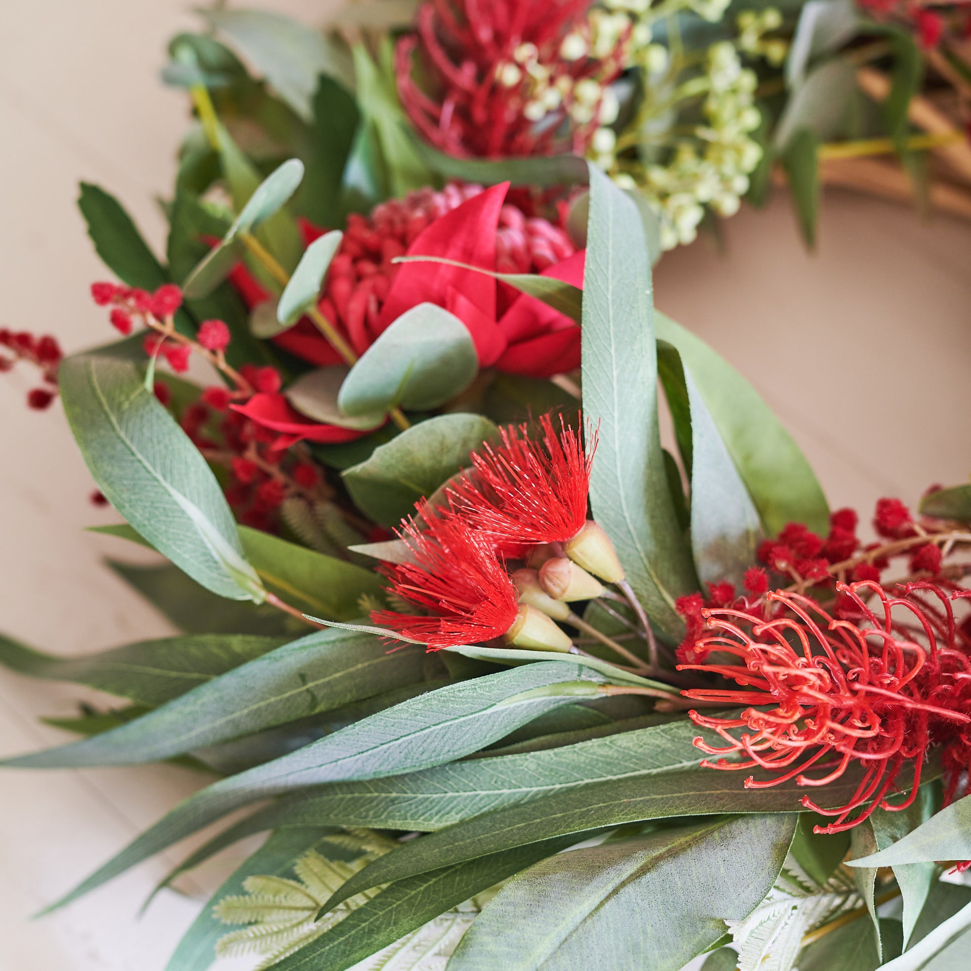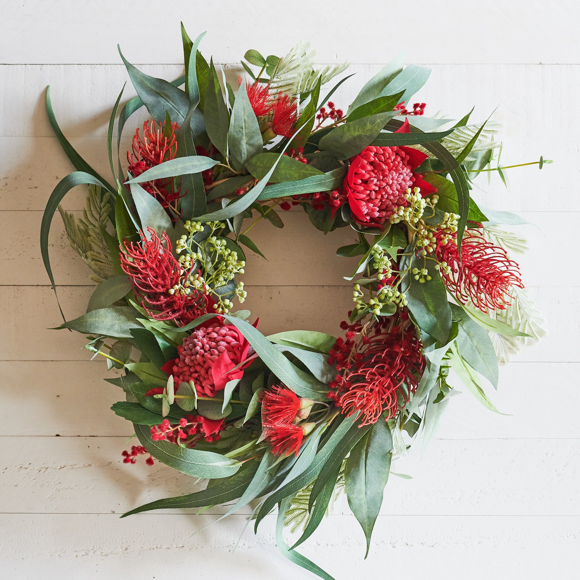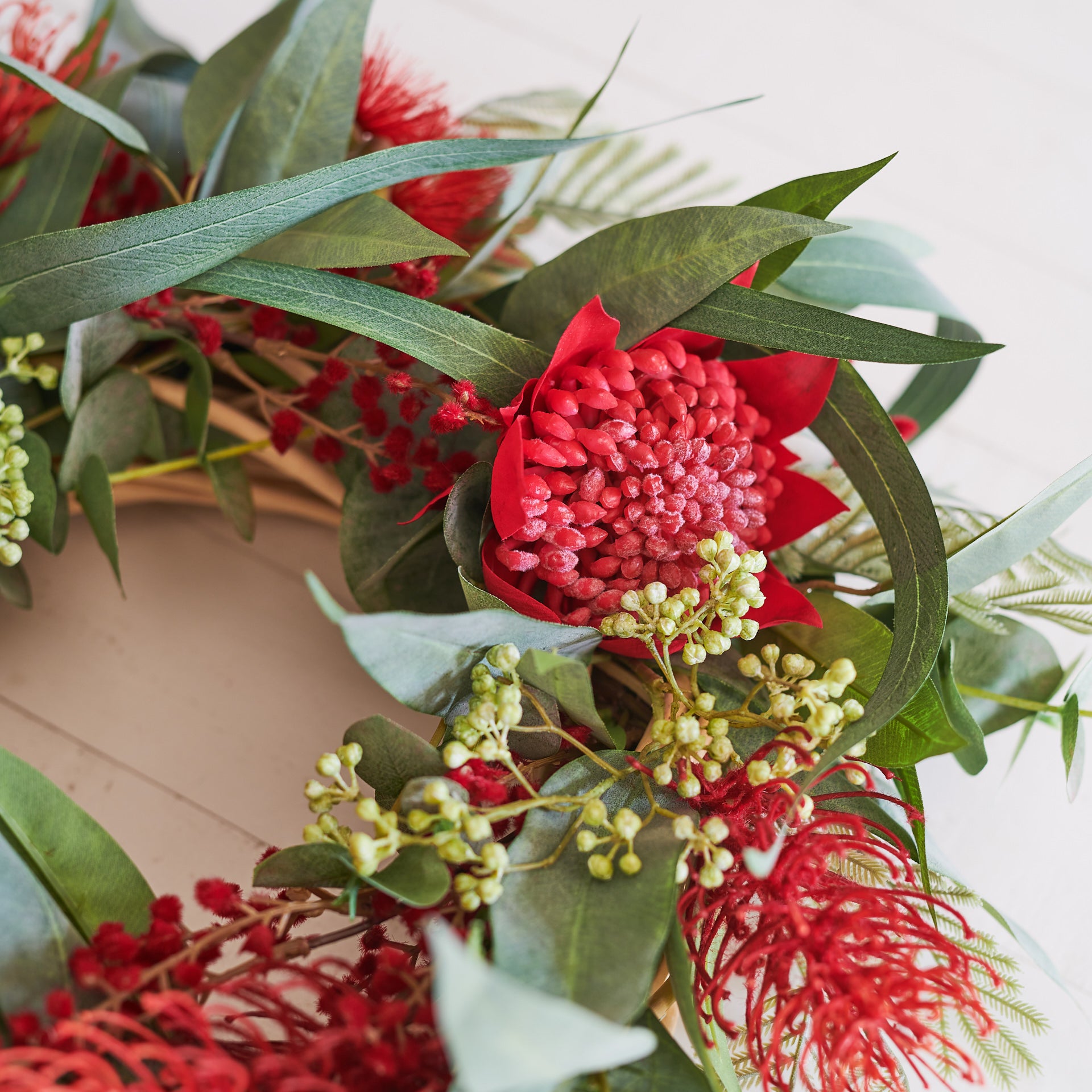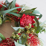 Handmade Wreath for Christmas or all year round! Made with a festive combination of Real Touch Eucalyptus, Waratah, Blossom, Seeding Berry, Wattle and Grevillea.