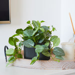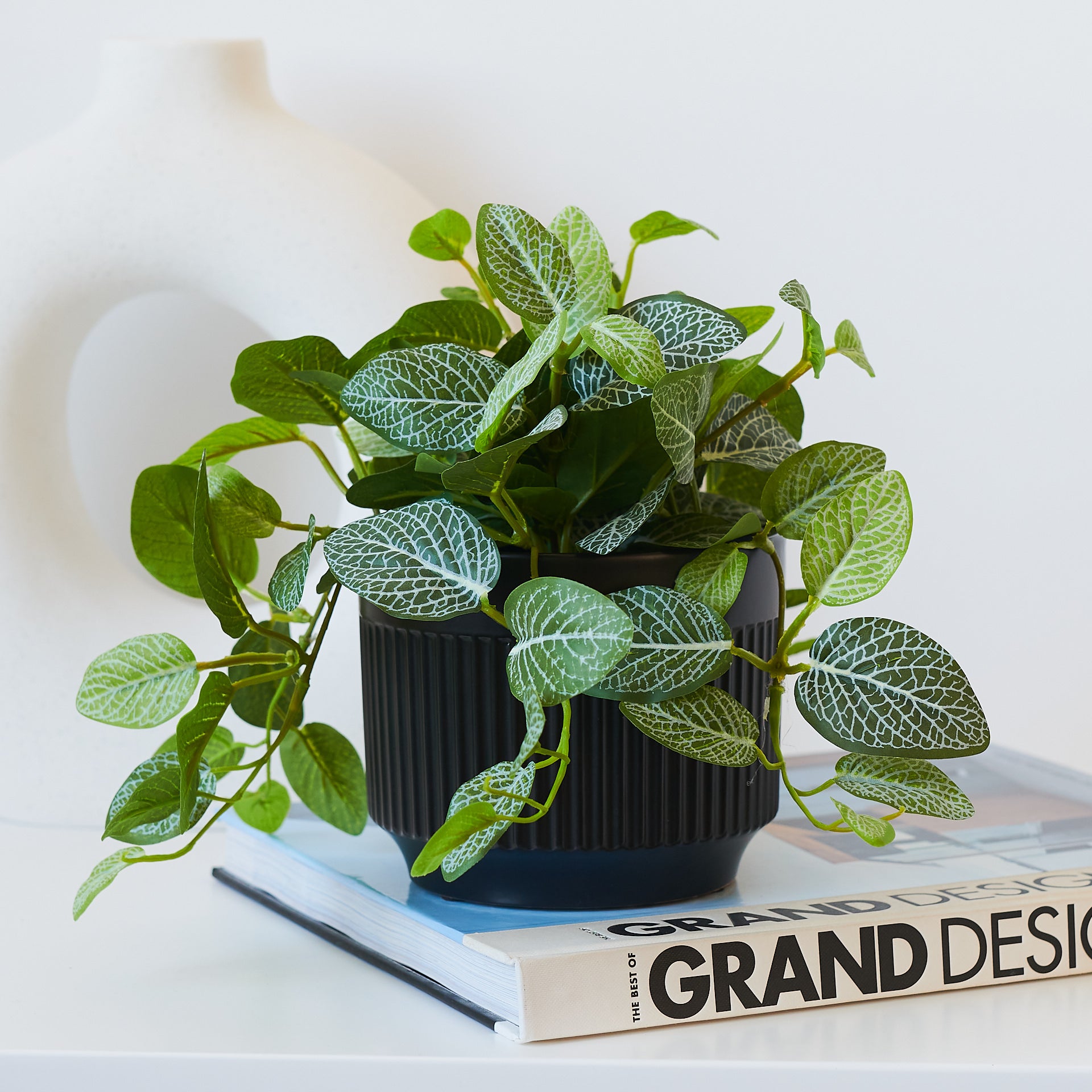 Fittonia hanging plant in a ribbed ceramic black pot.