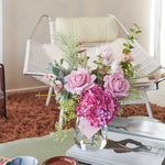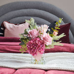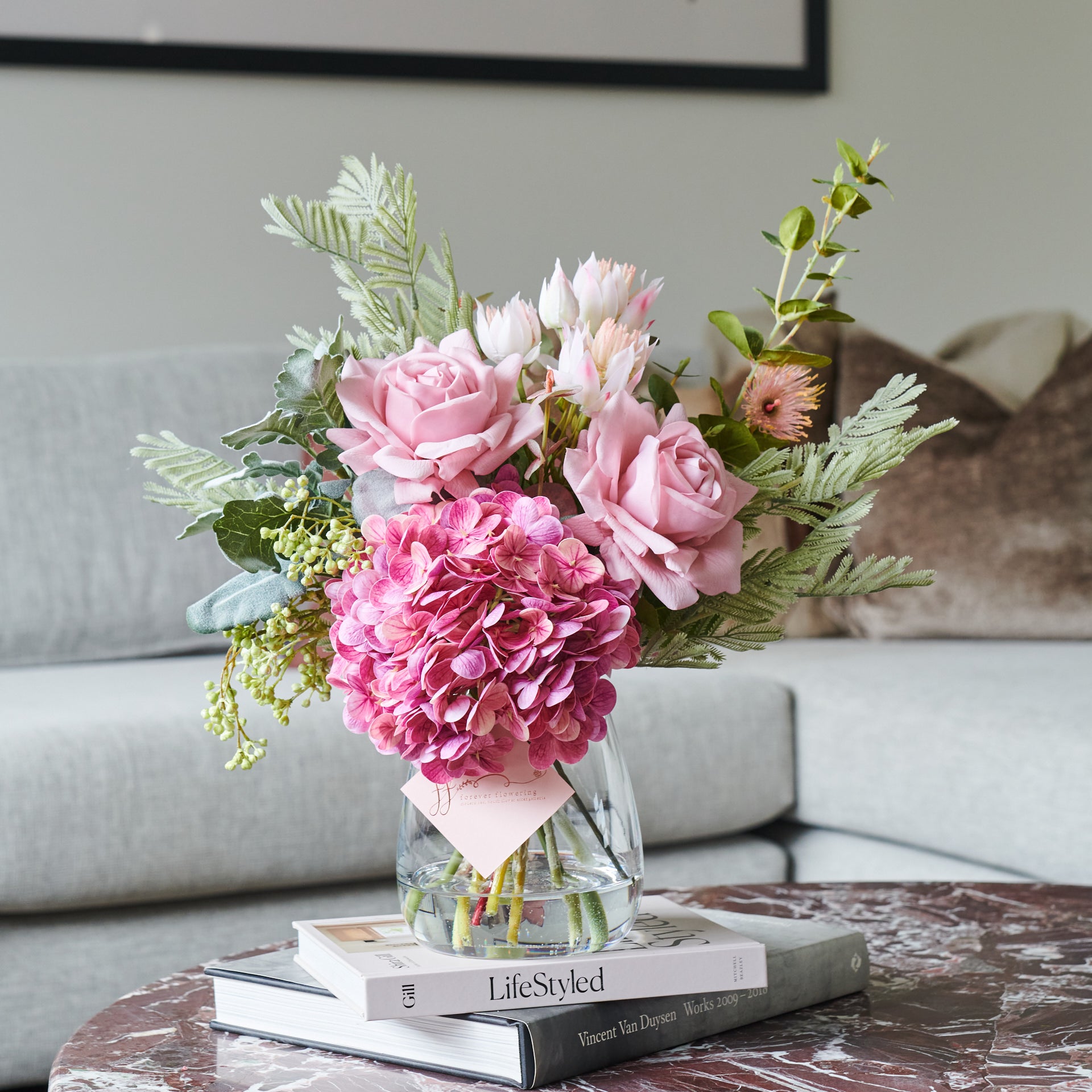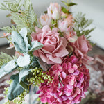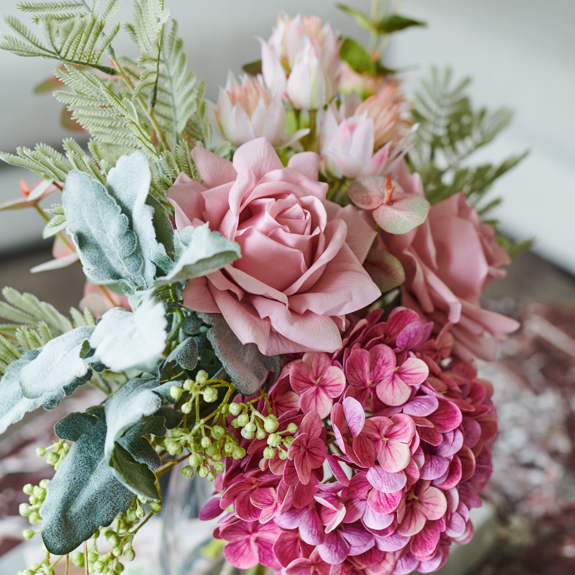 Real Touch Eucalyptus, Blossom, Hydrangea and Rose with Blushing Bride Set in a Belly Vase with Artificial Water.