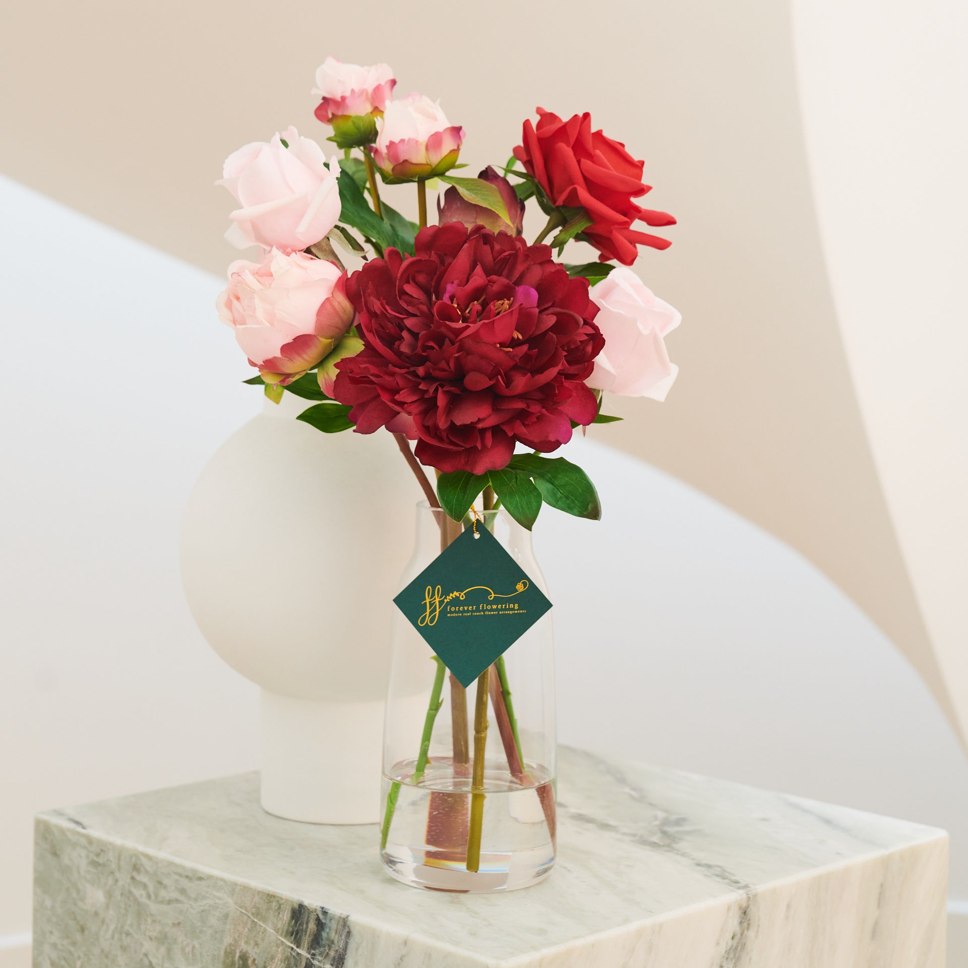 A classic arrangement featuring our Signature Real Touch Roses permanently set in Glass Vase in Artificial Water.